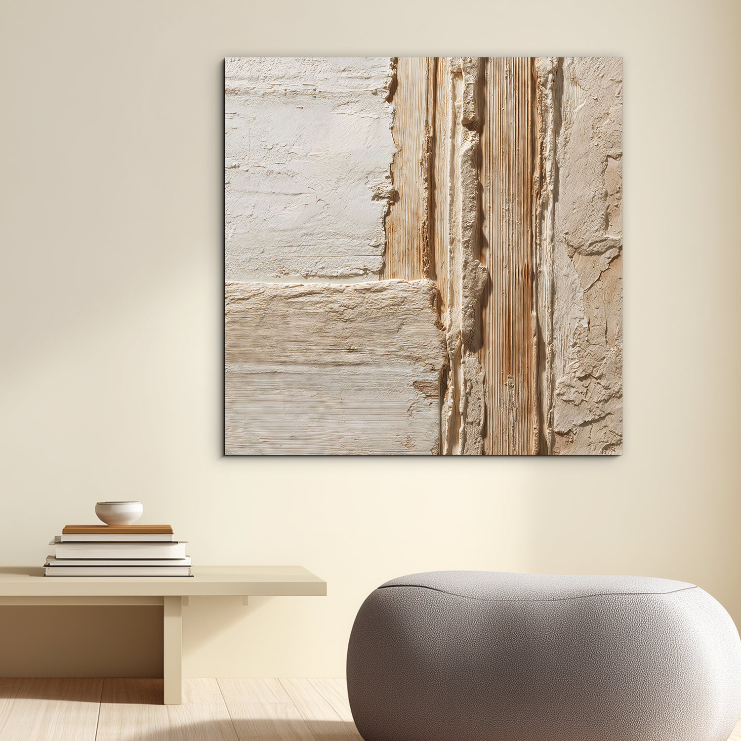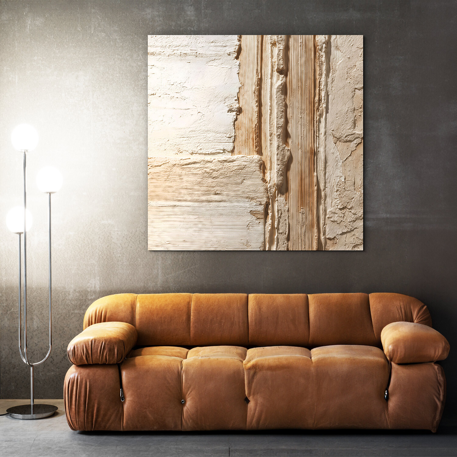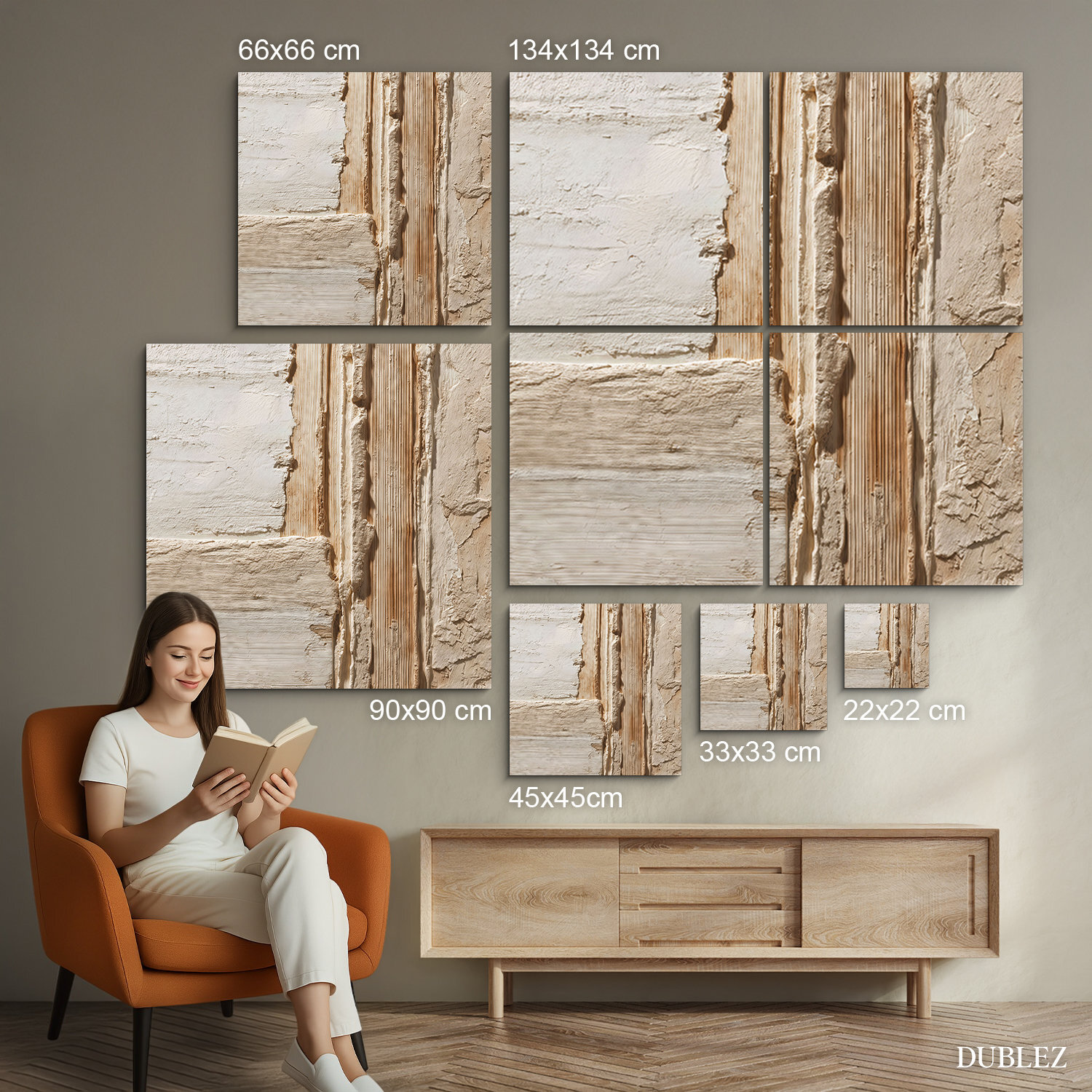 Dřevěný obraz Vrstva je minimalistická abstrakce inspirovaná syrovou architekturou – omítkou, patinou a přirozenou strukturou materiálů. Jemné krémovo-bežové tóny se prolínají s reliéfními vrstvami a vertikálními liniemi, které připomínají práci se špachtlí či stěrkou. I když je povrch dřeva hladký, tisk věrně zachycuje plasticitu a hloubku textury, díky čemuž působí obraz jako skutečný reliéf. Moderní obraz na stěnu do obývacího pokoje, chodby nebo kanceláře.