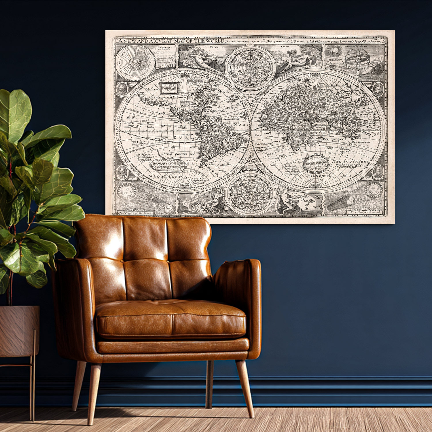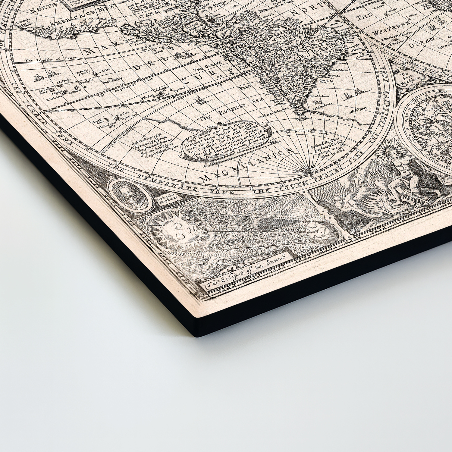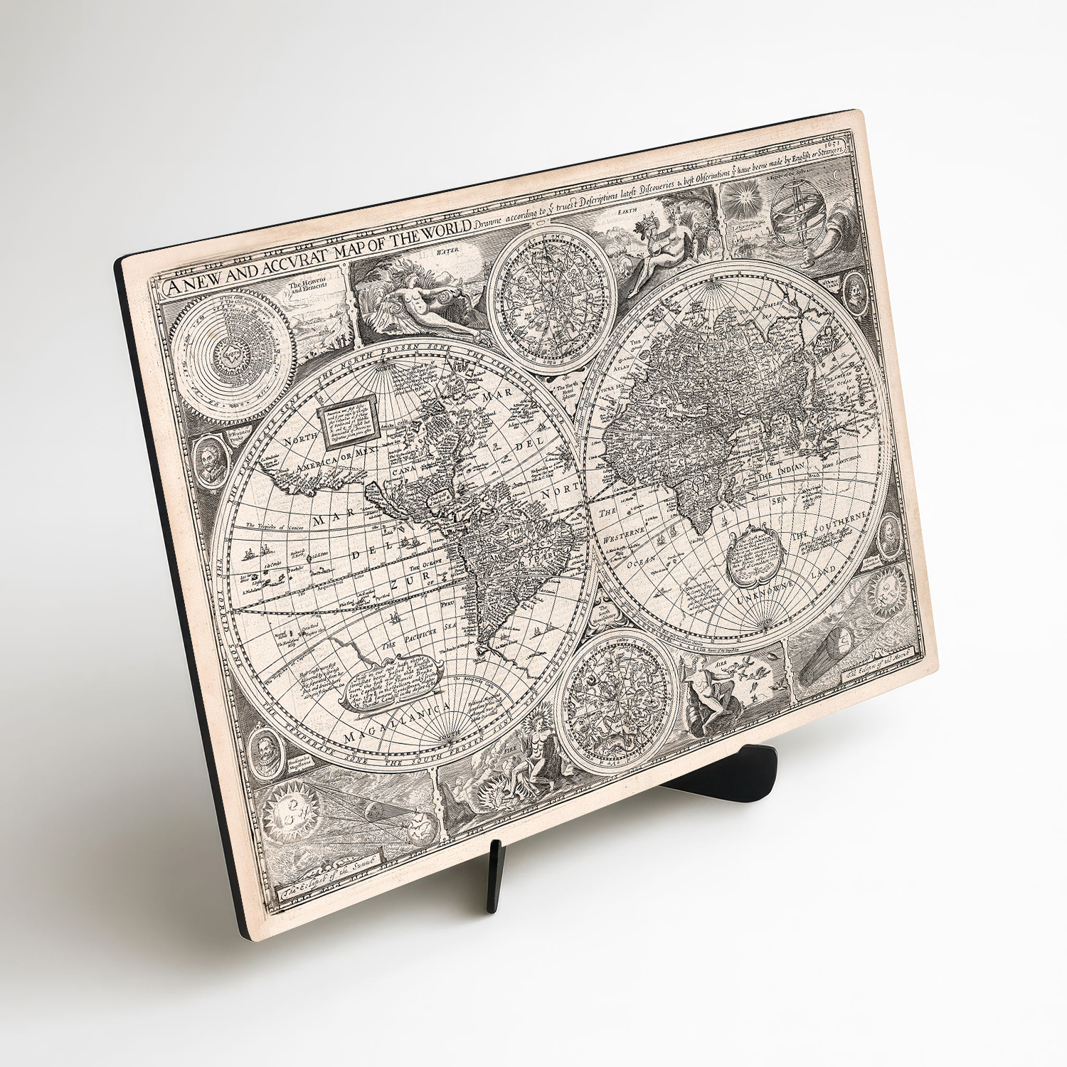 Význam obrazu: Dřevěný obraz mapy světa vychází z historických map ze 17. století, které tvořili především holandští kartografové jako Frederik de Wit, Joan Blaeu či Nicolas Visscher. Jejich mapy se považují za vrchol barokní kartografie, protože spojovaly geografickou přesnost s uměleckým zobrazením kontinentů, moří a nebeských sfér.