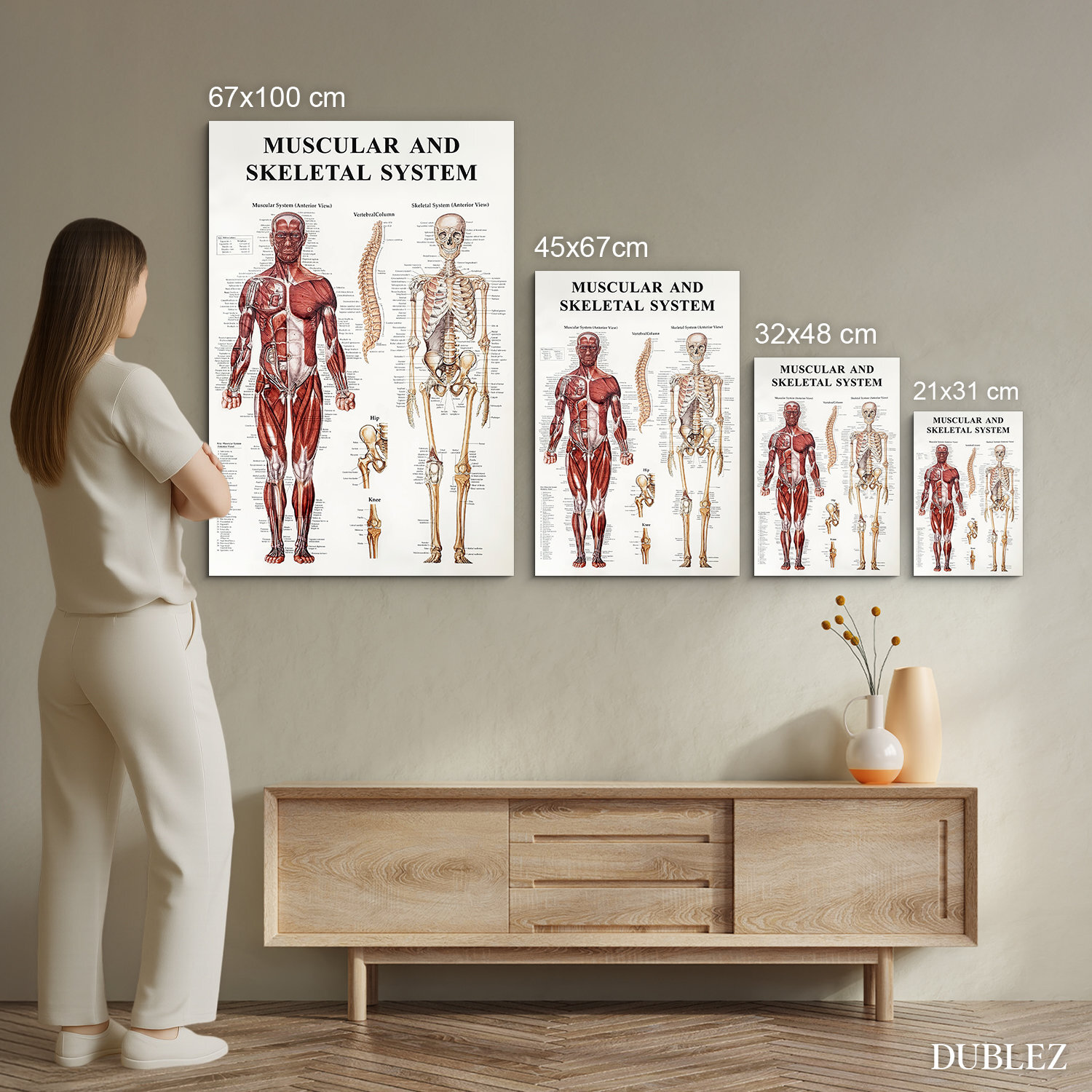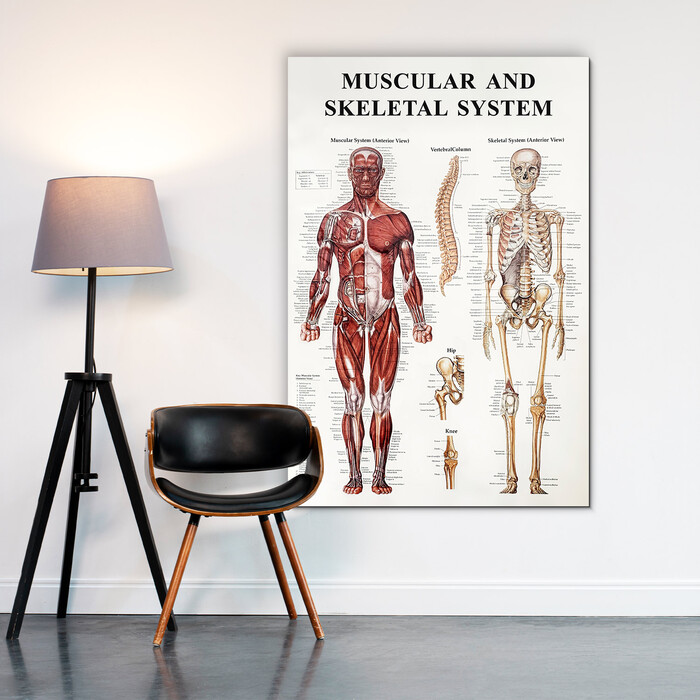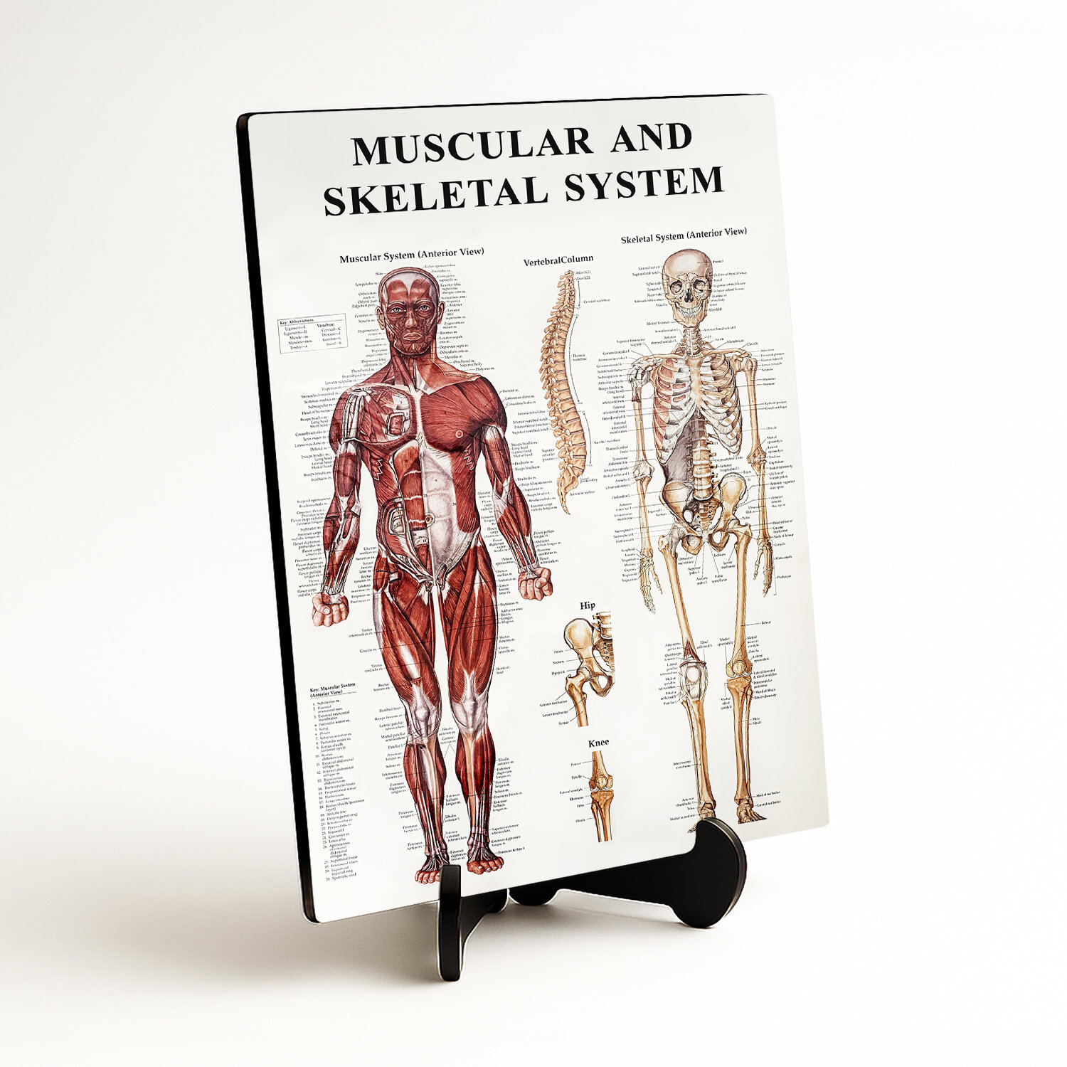 Dřevěný anatomický obraz zobrazuje svalovou i kosterní soustavu lidského těla. Nejedná se o obyčejný papírový plakát, ale o kvalitní tisk na dřevě. Přehledné uspořádání předního pohledu na svalstvo, páteř a skelet doplňují odborné latinské popisy jednotlivých částí, což z obrazu dělá nejen dekorativní, ale i vysoce edukativní prvek. Obraz anatomie na zeď je ideální volbou do lékařských ordinací, rehabilitačních center, fyzioterapeutických místností či masérských salónů, ale také pro studenty medicíny a nadšence biologie.