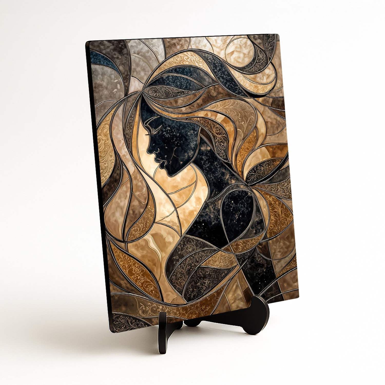 Vneste do svého interiéru eleganci zlaté éry s tímto moderním obrazem ženy ve stylu Art Deco. Portrét ženského profilu propletený bohatými ornamenty vyzařuje noblesu a klid. Umělecká dekorace na dřevě je výjimečným spojením luxusní mozaiky a současného designu.