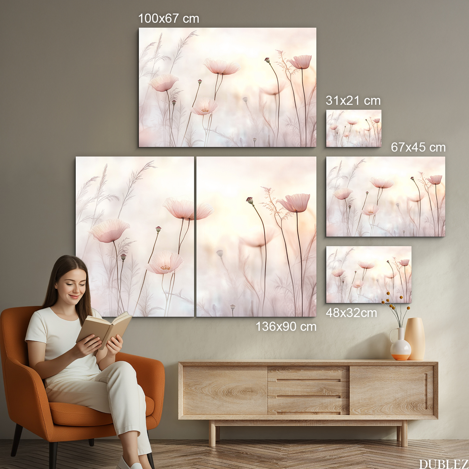 Dřevěný obraz do ložnice – Růžové máky je ztělesněním něžnosti, klidu a přirozené krásy. Pastelové barvy a jemné okvětní lístky květů vytvářejí uklidňující atmosféru, která je jako stvořená pro ložnici, romantický obývací pokoj či domácí knihovnu. Dřevěný obraz je perfektním dárkem pro ženu, která si potrpí na detaily, má ráda květiny a vnímá krásu i v jedinečných momentech.