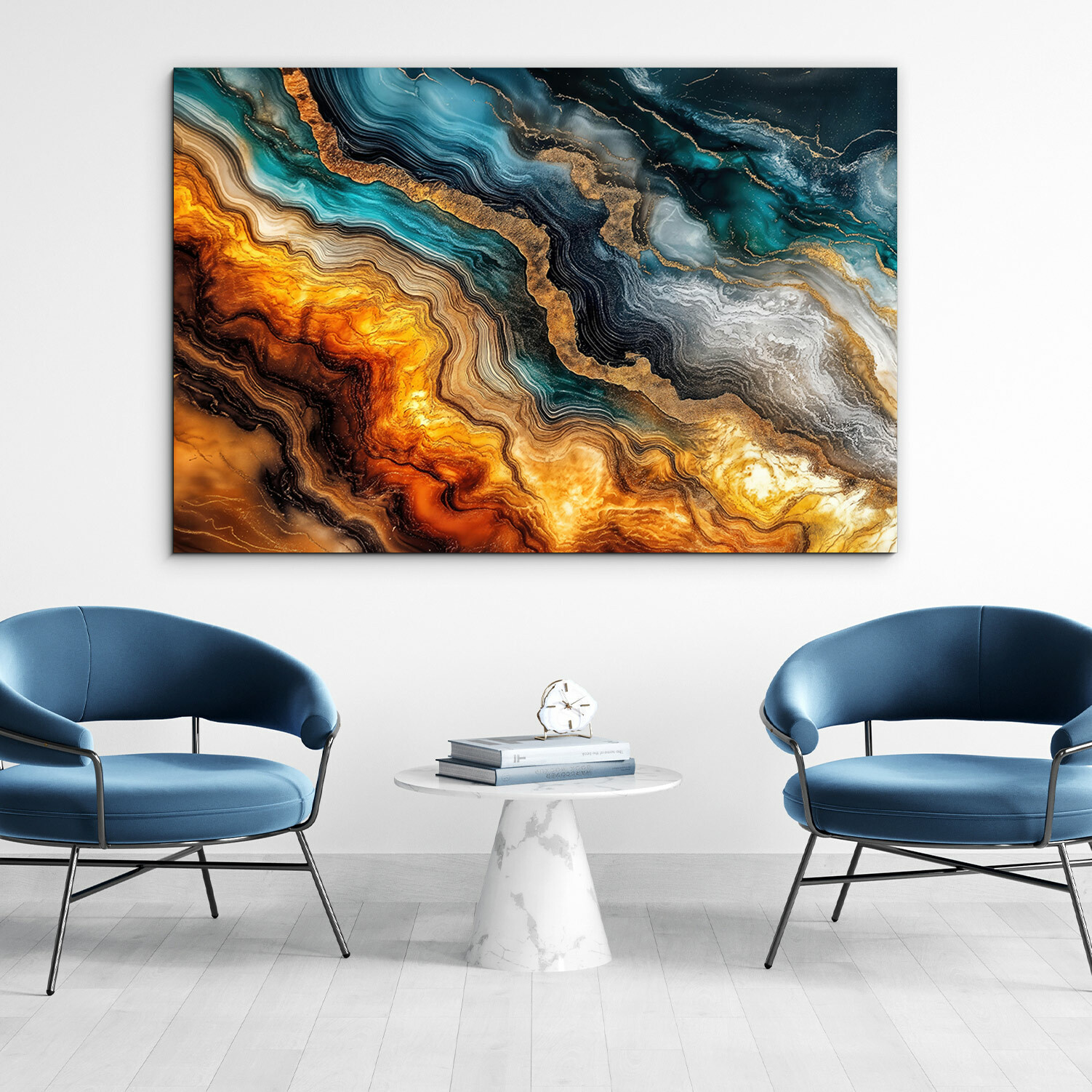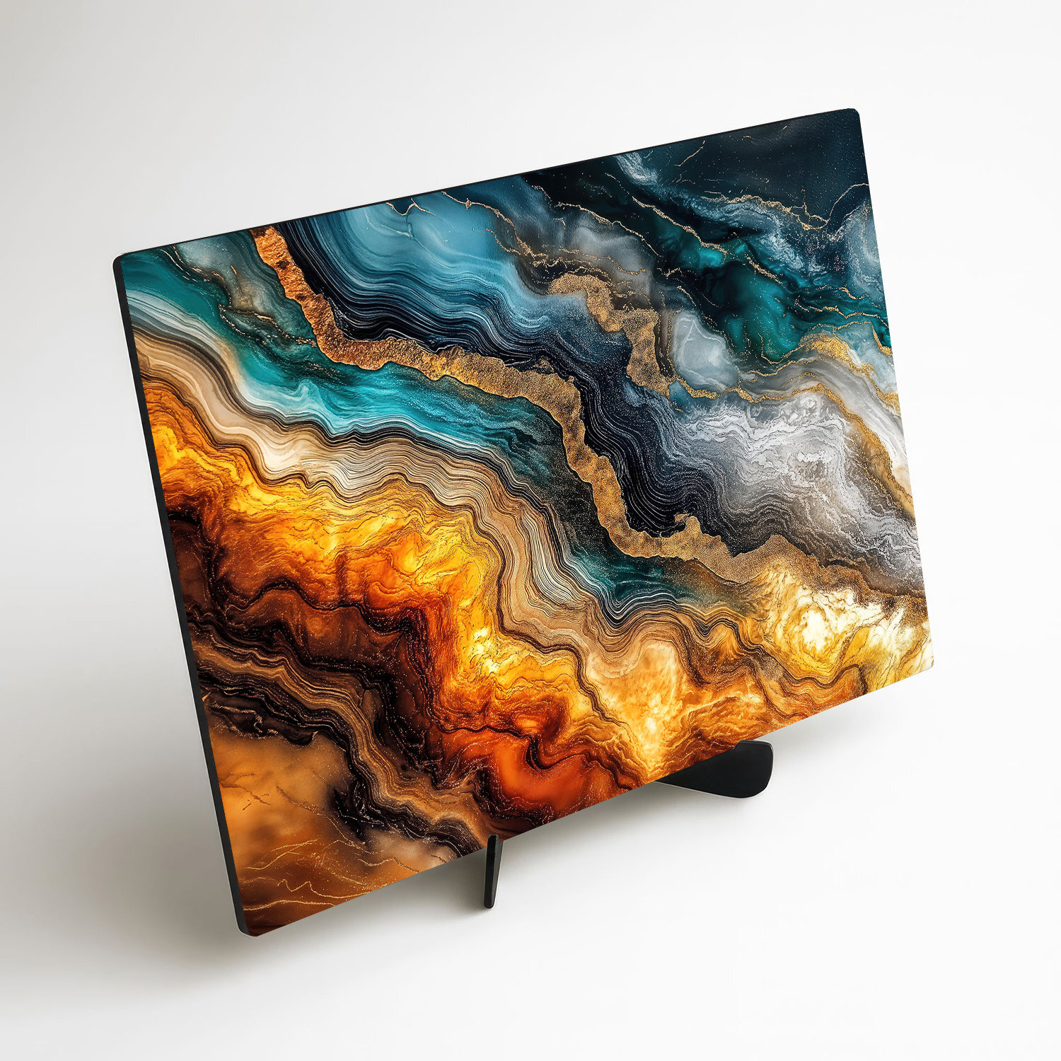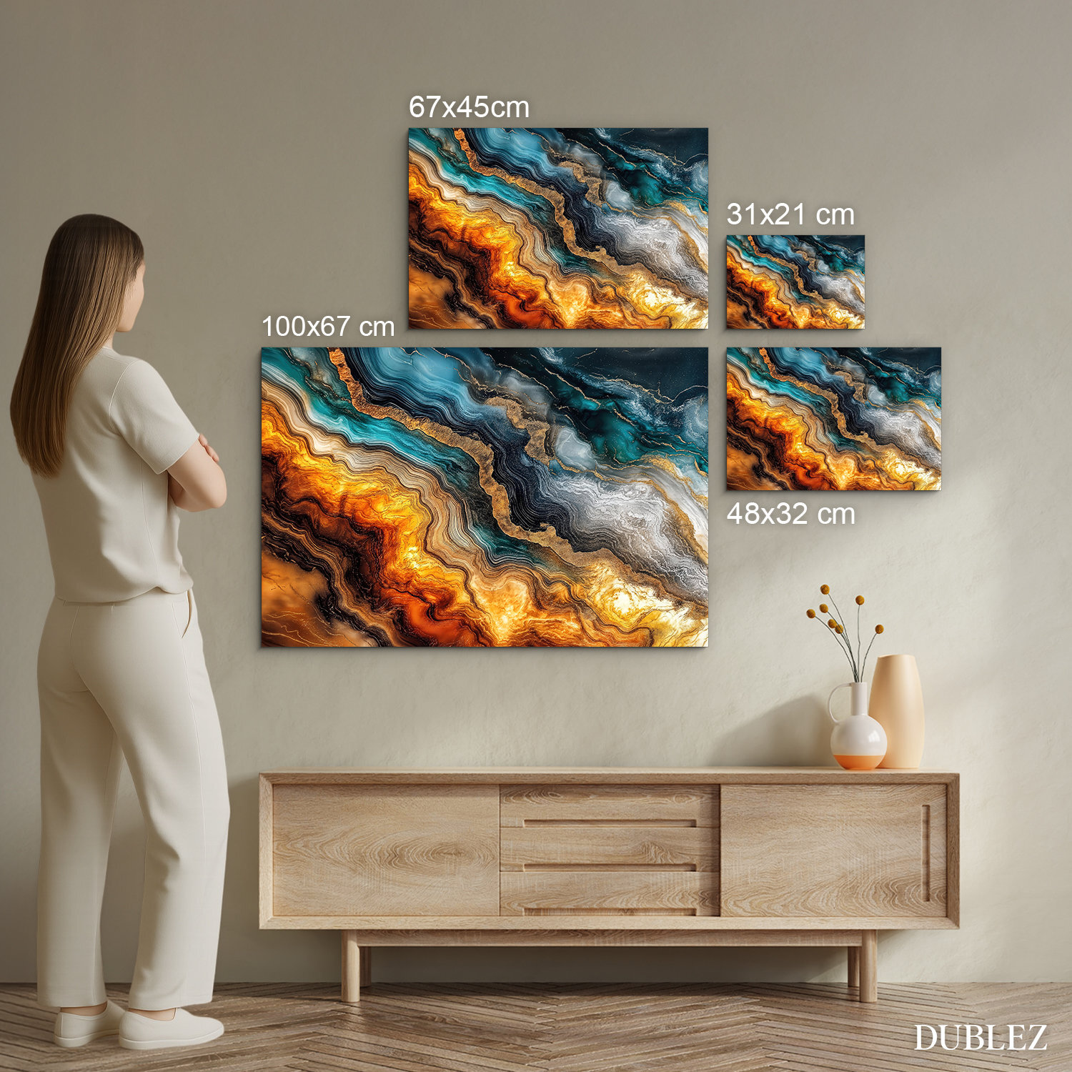 Dřevěný obraz krásně vynikne v obývacím pokoji i kanceláři. Design připomíná barevné vrstvy kamene – teplé oranžovo-zlaté tóny se střídají s modrou a šedou. Kvalitní UV tisk na dřevě věrně ukazuje detaily a barvy, které jsou trvalé a nevyblednou. Obraz se snadno kombinuje s dřevem, kamenem, betonem či kovem a hodí se do moderního i industriálního interiéru.