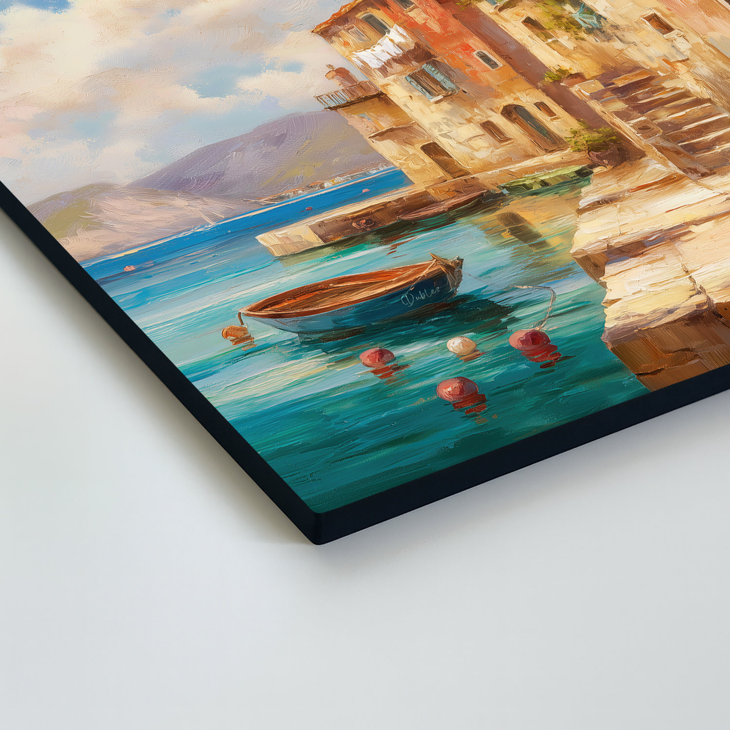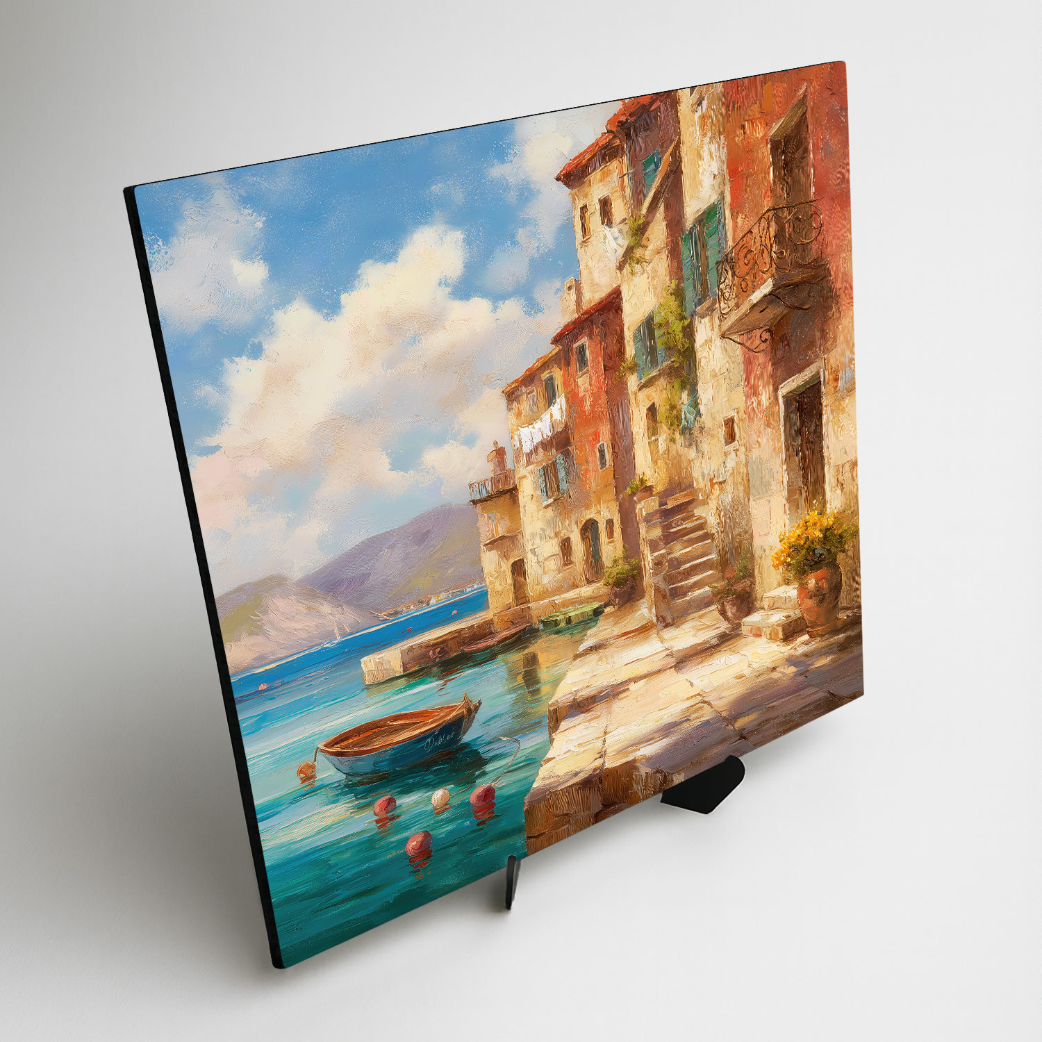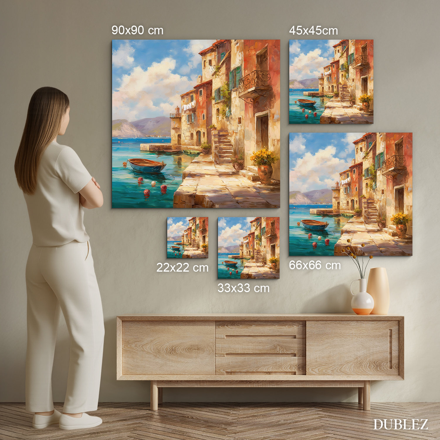 Dřevěný obraz přímořského městečka zachycuje klidné pobřeží s malebnou uličkou, starobylými domy a člunem zakotveným v tyrkysové vodě. Teplé tóny fasád a světlo pronikající do každého detailu vytvářejí atmosféru klidu, odpočinku a středomořské pohody. Barevný obraz je skvělou volbou pro obývací pokoj, ložnici nebo chodbu, kde přinese příjemnou dovolenkovou náladu a kousek přímořského slunce. Vhodný také jako dárek pro milovníky cestování, přírody a umění.