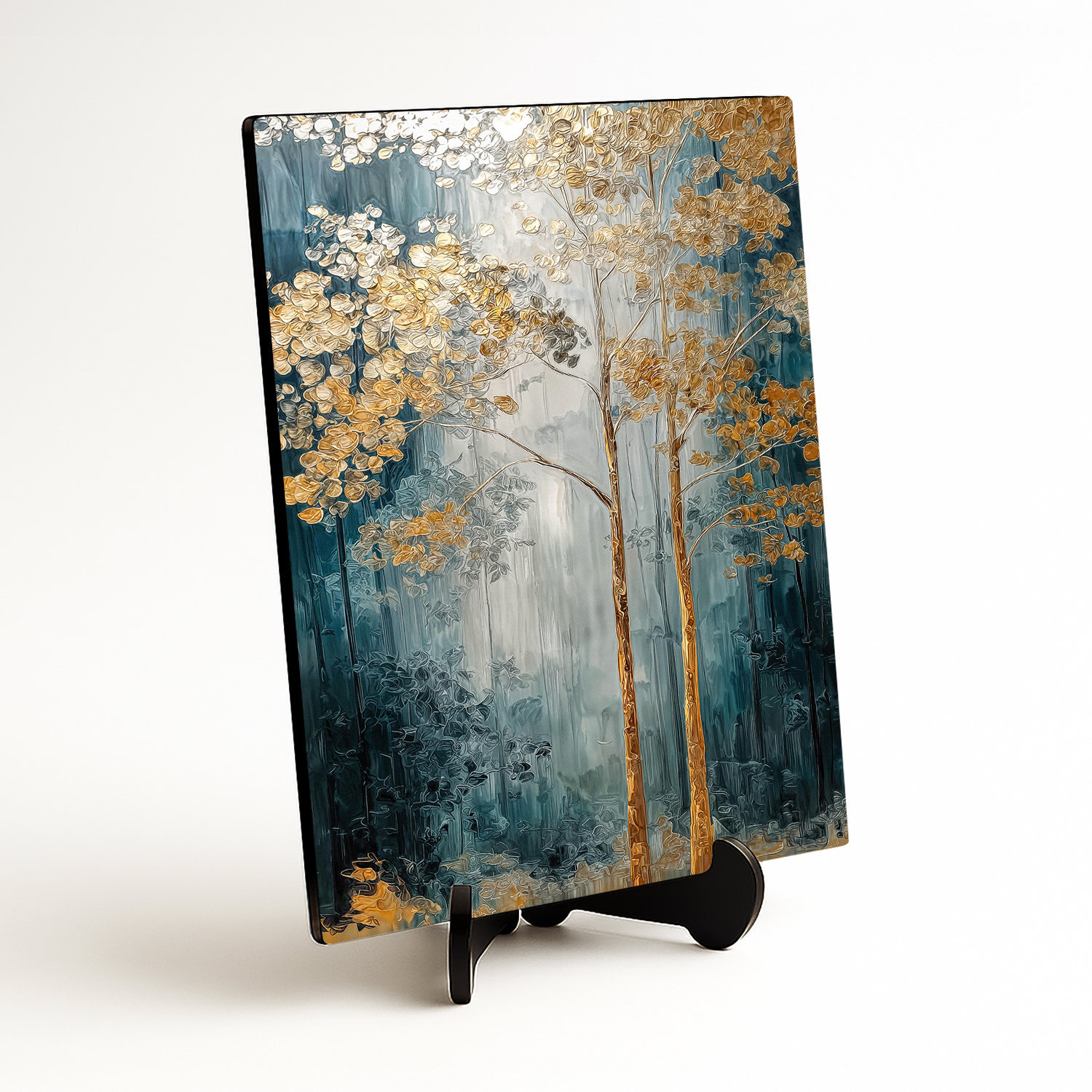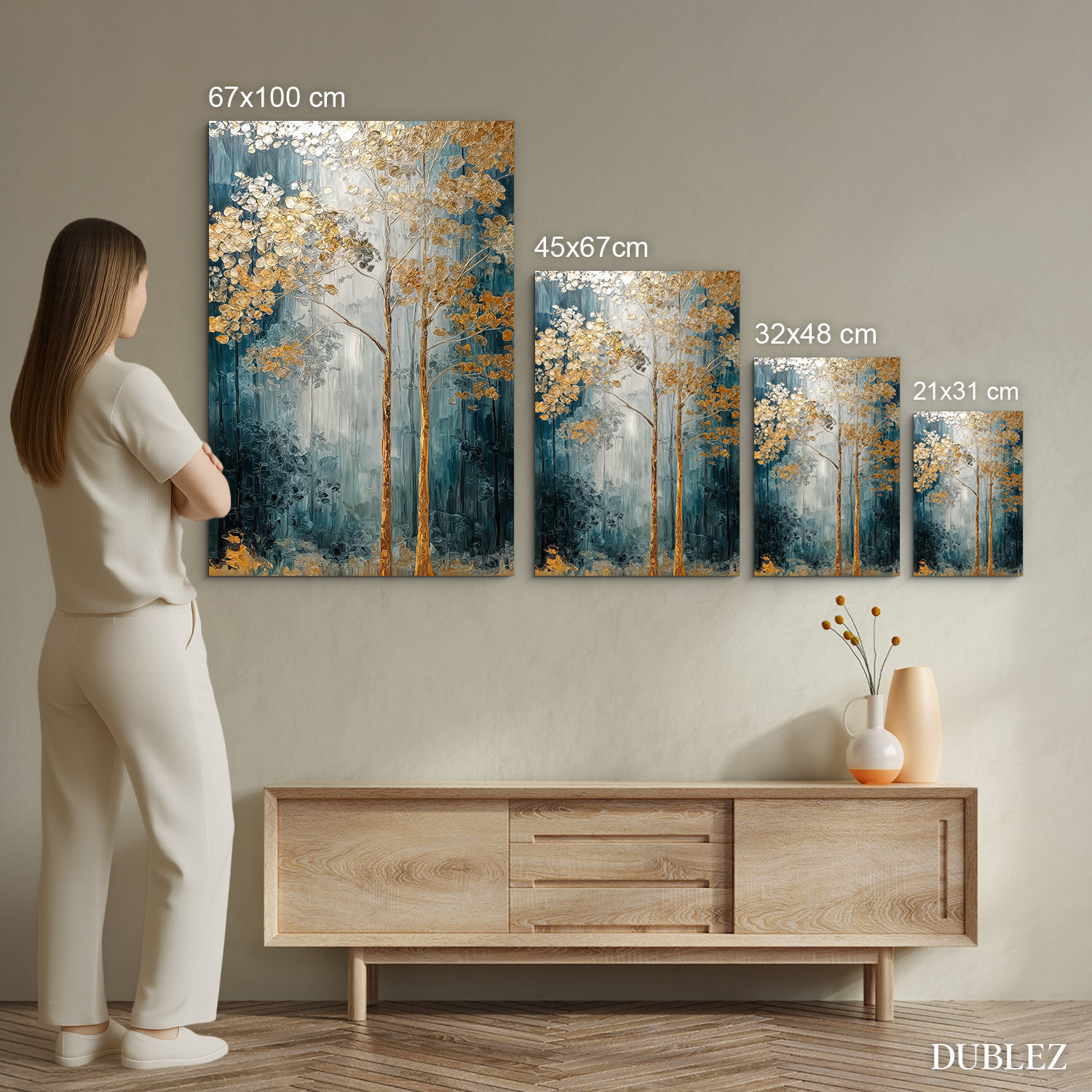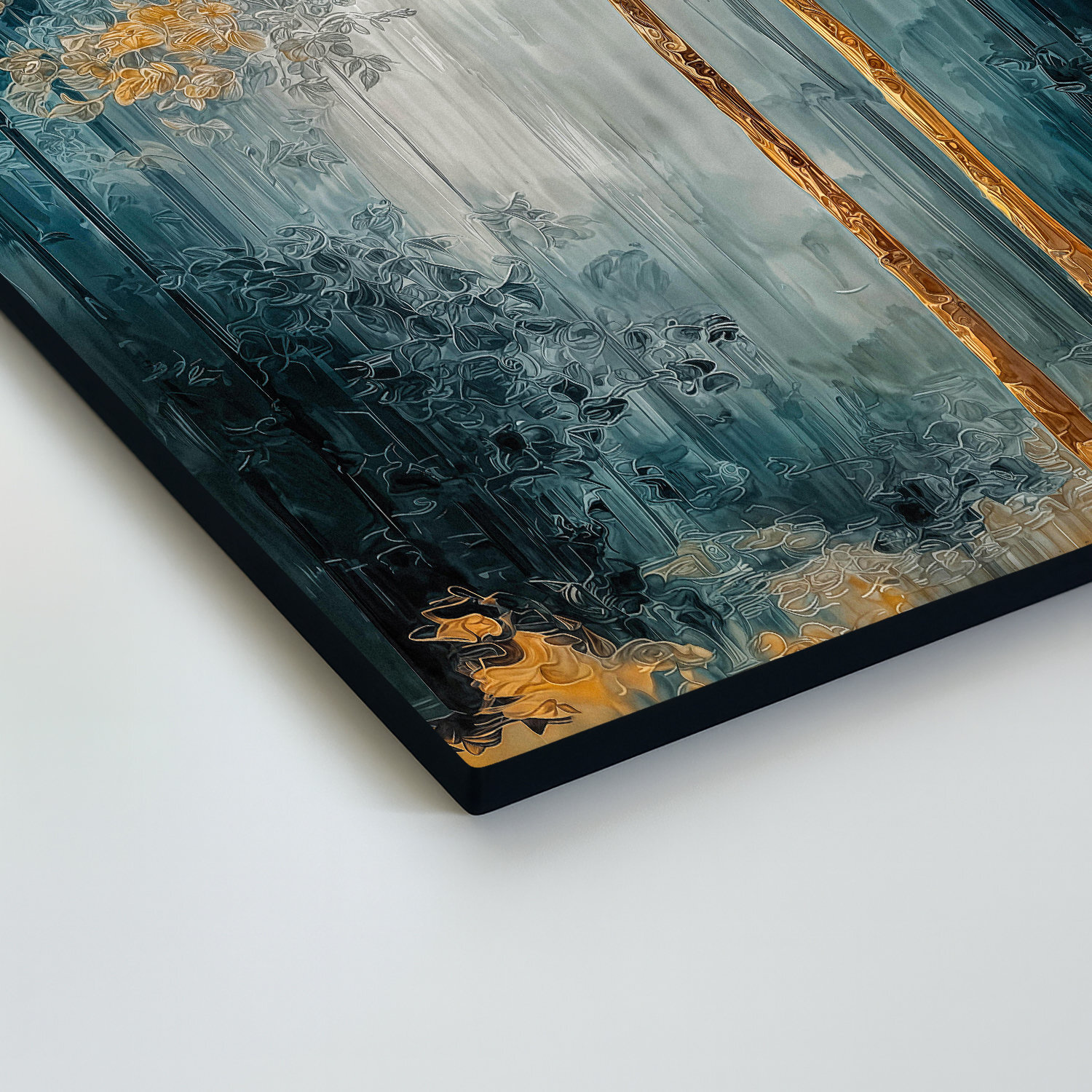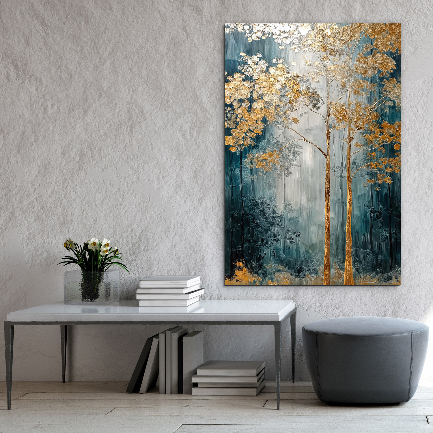 Význam obrazu: Zlaté stromy symbolizují stabilitu, růst a prosperitu. V obraze představují spojení přírody s elegancí a působí jako talisman pro klid a úspěch v prostoru.