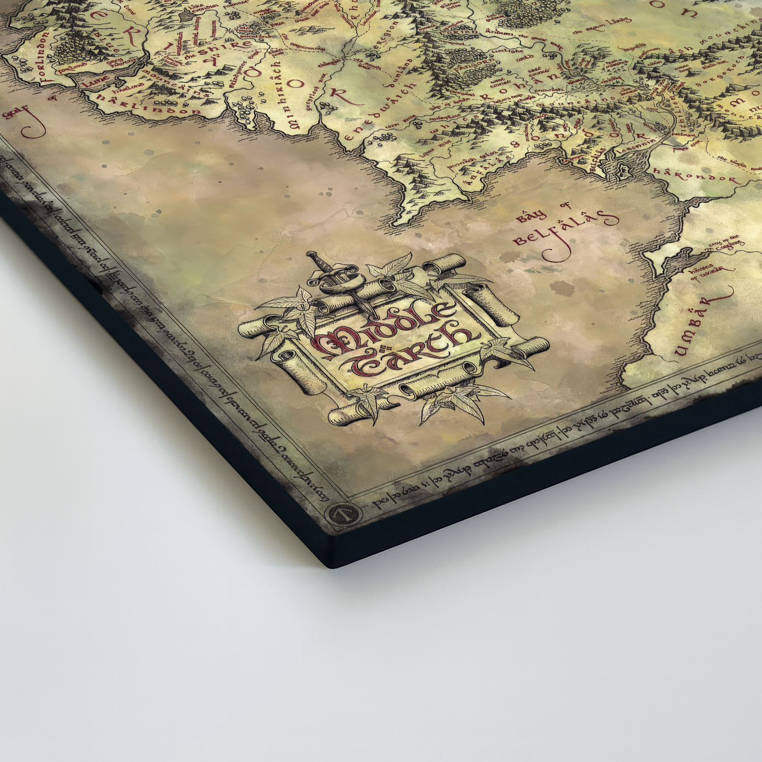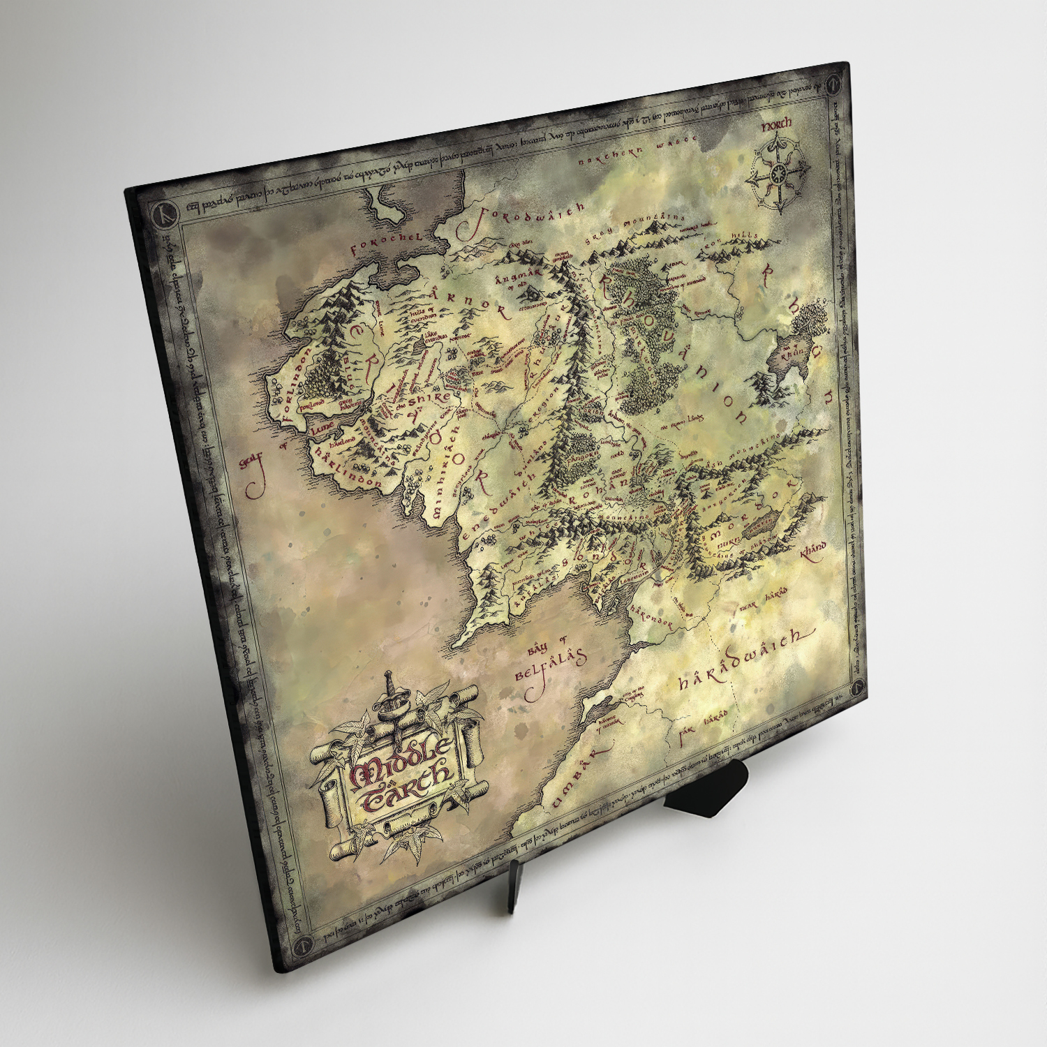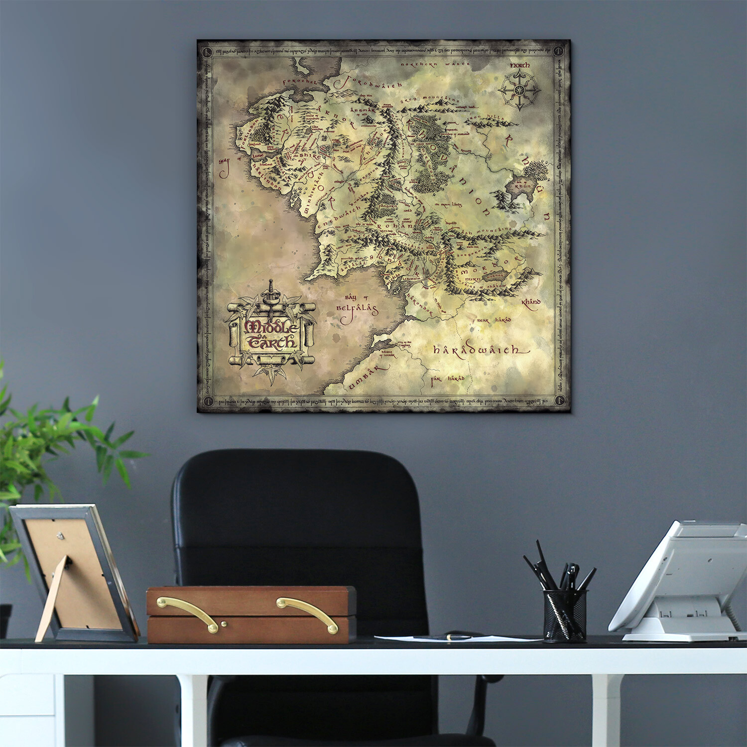 Dřevěný obraz s mapou Středozemě je jako stvořený pro fanoušky světa J. R. R. Tolkiena. Jemně patinovaný vzhled dodává obrazu styl starého svitku. Vynikne v pracovně, kanceláři nebo studentském pokoji, kde působí jako výjimečný doplněk.