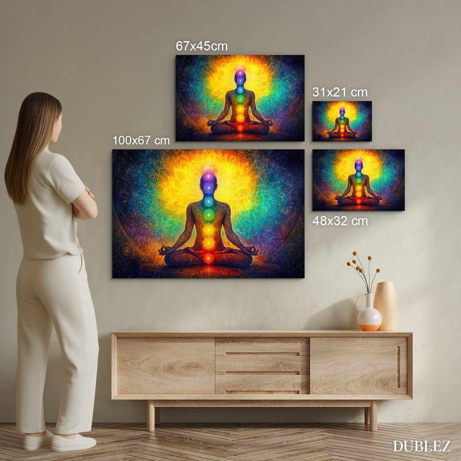 Barevný dřevěný obraz meditace – Jóga a čakry vyniká svou zářivou kombinací odstínů, které okamžitě rozjasní každý interiér. Postava v lotosové pozici je obklopena energií duhových barev, které symbolizují sedm čaker a vytvářejí harmonickou a uklidňující atmosféru.