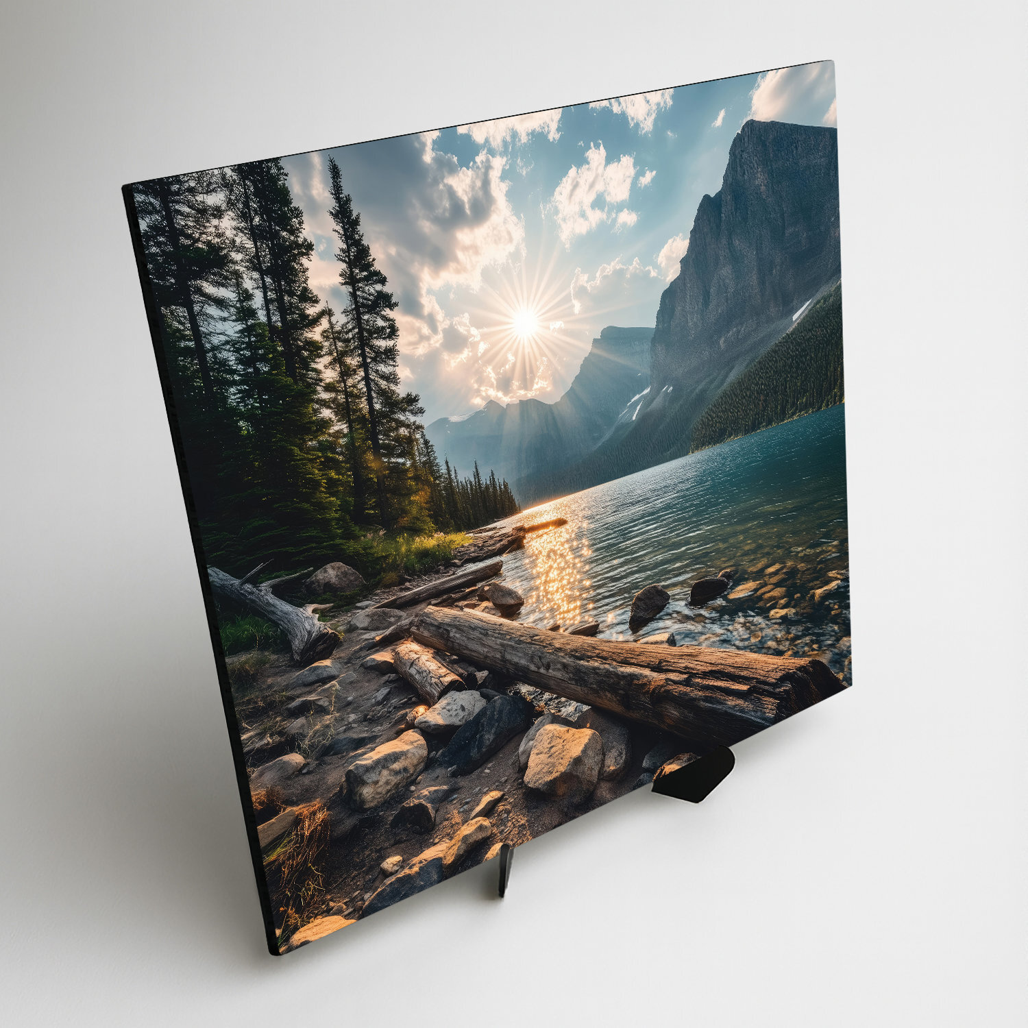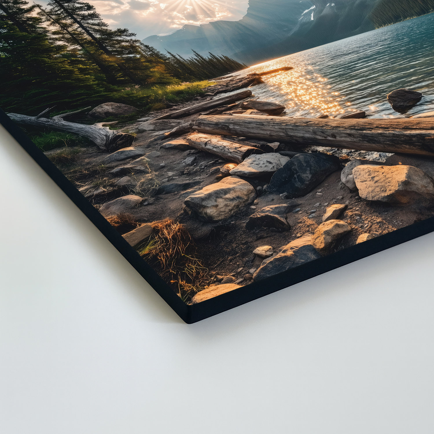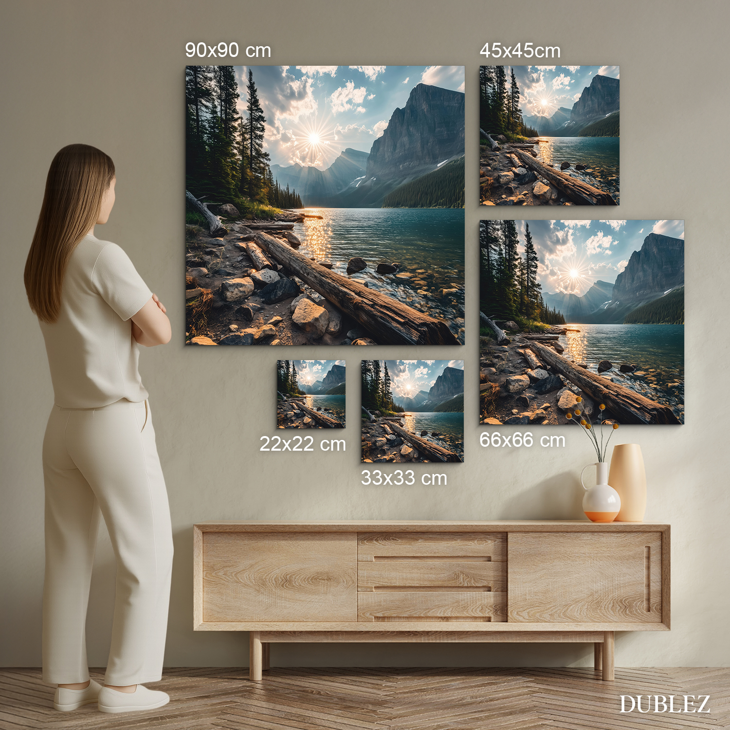 Okouzlující obraz přírody zachycuje výhled na horské jezero obklopené hustým lesem. Slunce nad horami proniká skrz jehličnaté lesy a odráží se na klidné hladině vody. Obraz přírody zobrazuje vysoké stromy a strmé skály, které působí jako ochranný štít kolem jezera, čímž zdůrazňuje klid a krásu tohoto přírodního útočiště. Obraz přírody doporučujeme pověsit do obývacího pokoje, kanceláře nebo chodby.