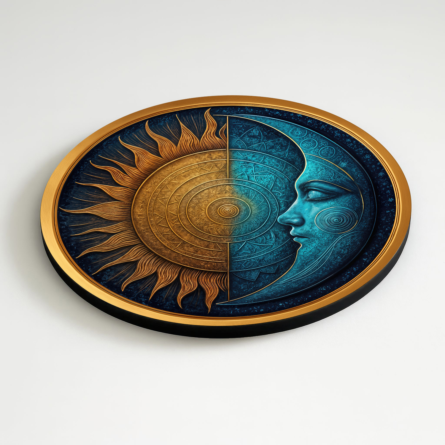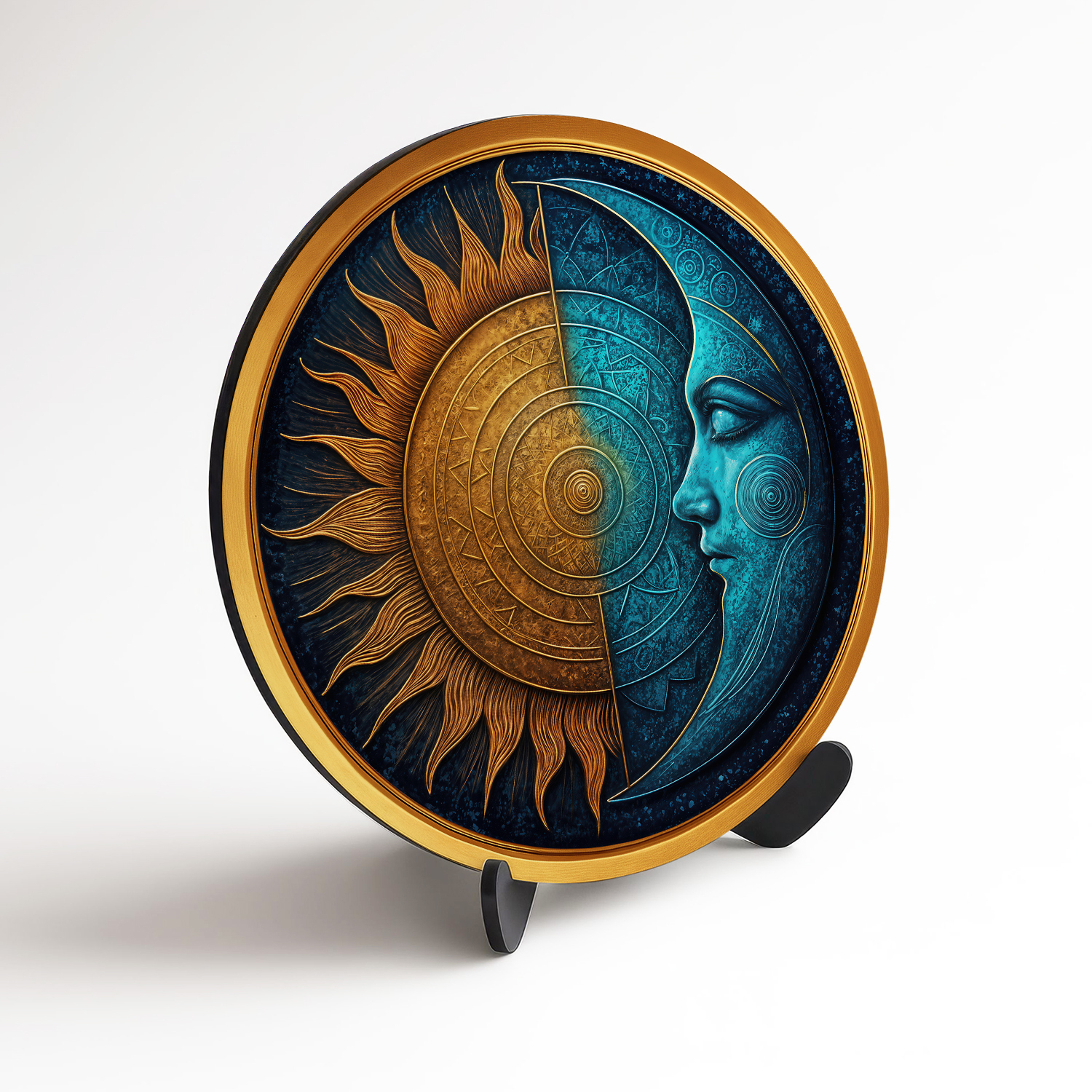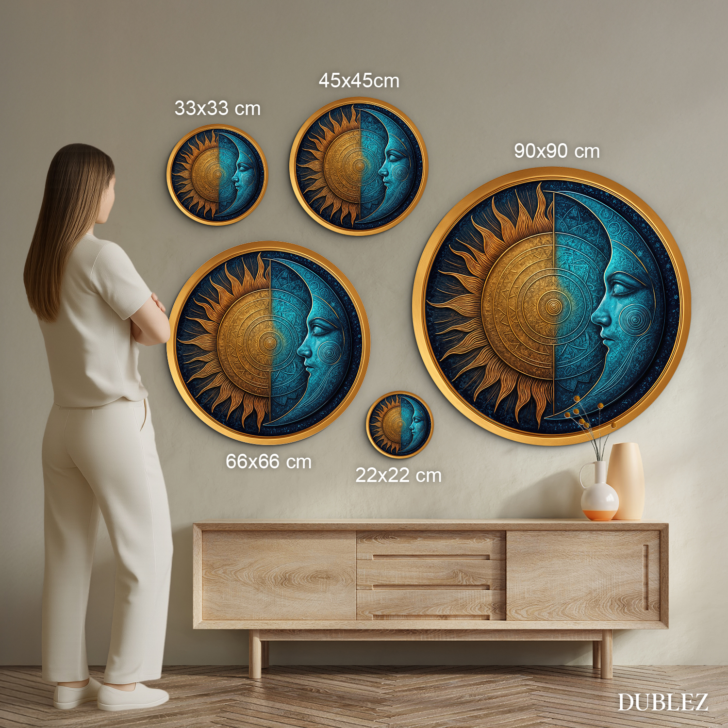 Dřevěný obraz - Slunce a Měsíc zachycuje harmonii dne a noci. Zlaté paprsky Slunce jsou v dokonalém kontrastu s chladnou modrou tváří Měsíce. Dřevěný obraz se stane neodmyslitelnou součástí každého interiéru – ideálně vynikne v obývacím pokoji či ložnici.