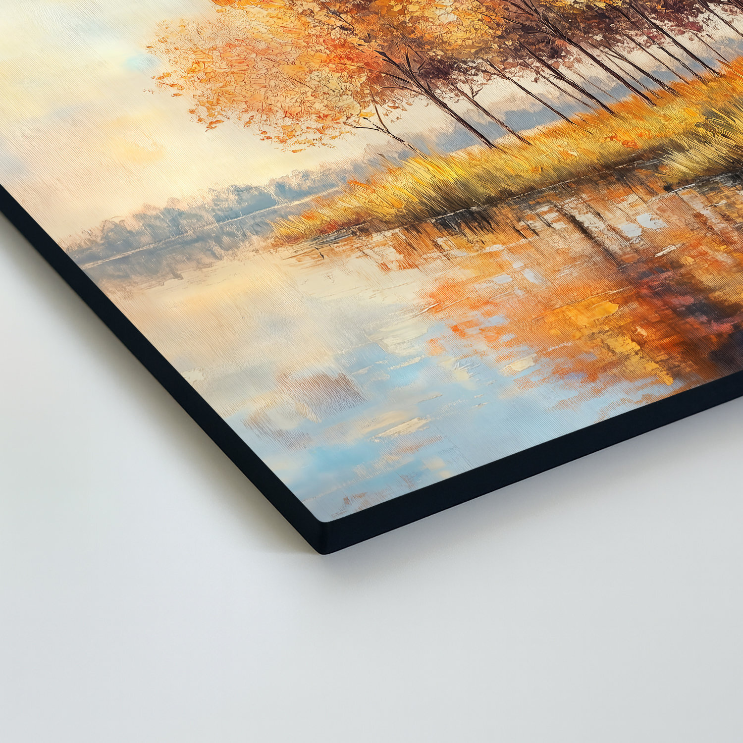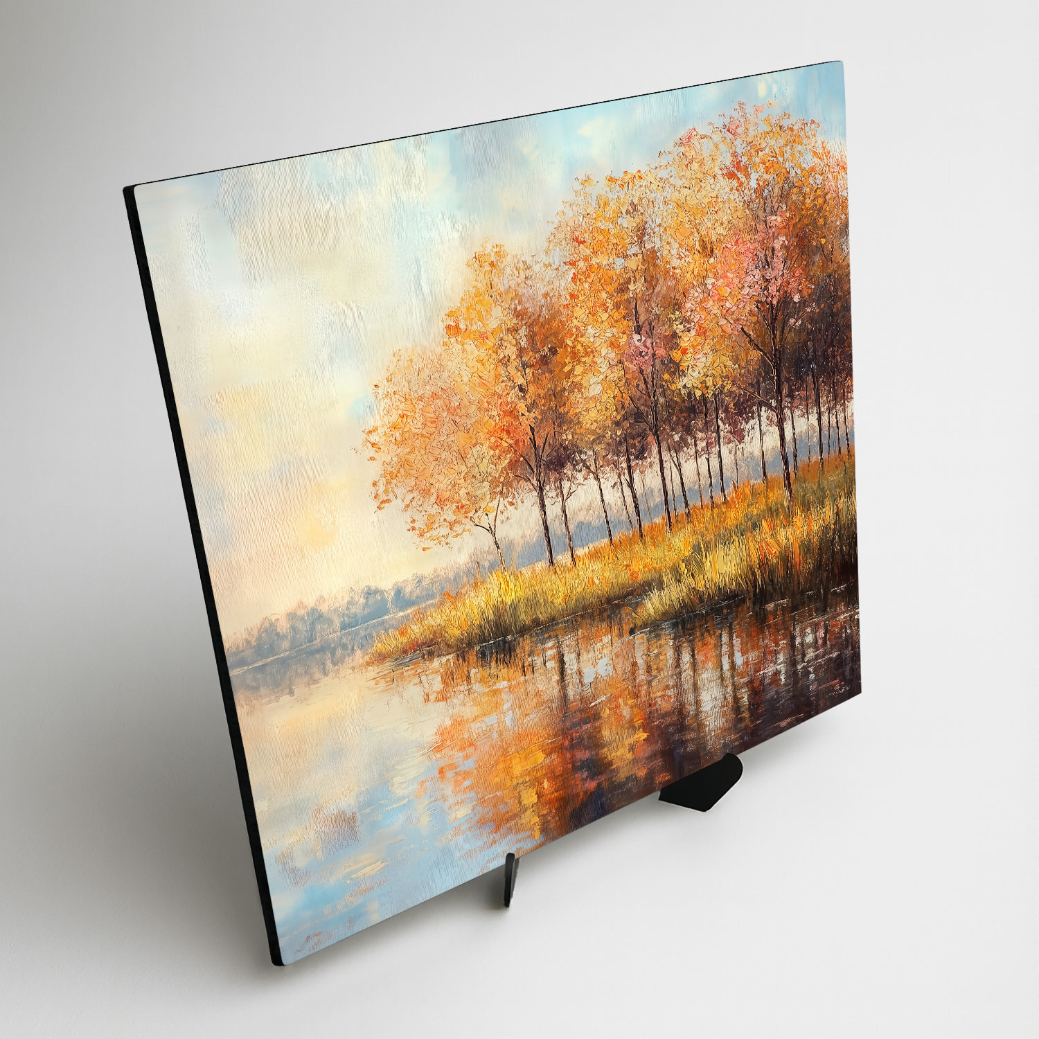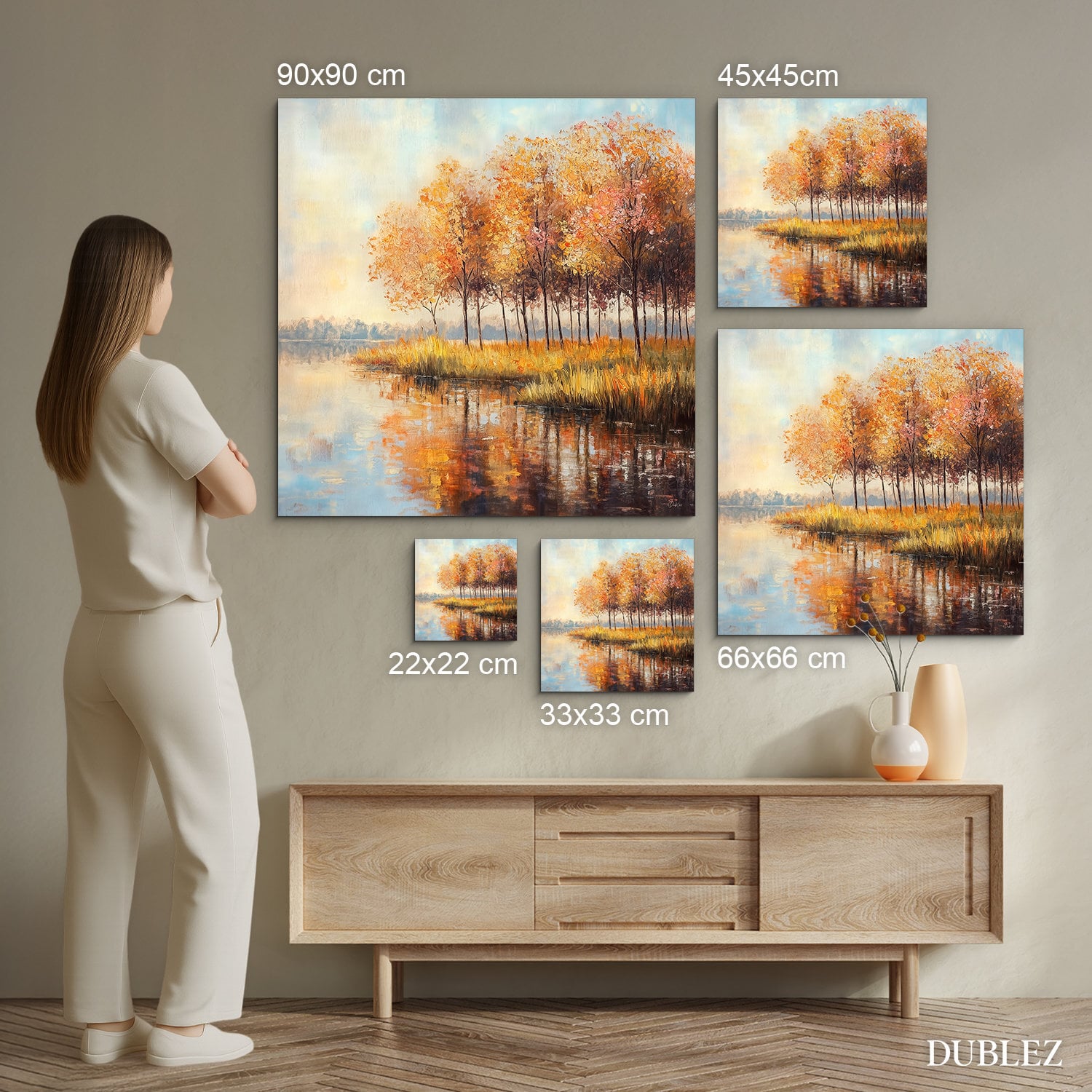 Dřevěný obraz stromy je imitací olejomalby a zobrazuje krásný výhled na jezero a stromy v podzimních barvách. Vyznačuje se bohatou paletou oranžových, žlutých a zlatých odstínů, které se zrcadlí na hladině vody. Obraz stromů vyzařuje do interiéru hřejivou, uklidňující atmosféru, což z něj dělá ideální bytový doplněk do každé místnosti. Ideálním umístěním je na stěnu do obývacího pokoje, jídelny nebo kanceláře.