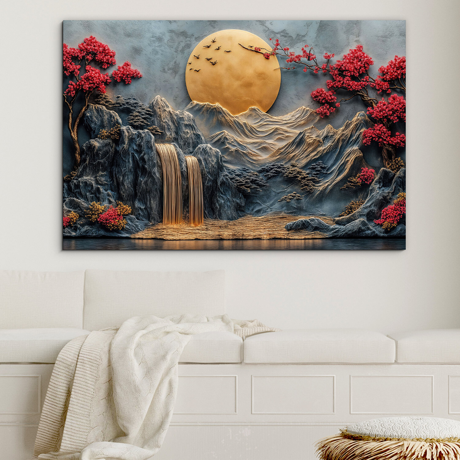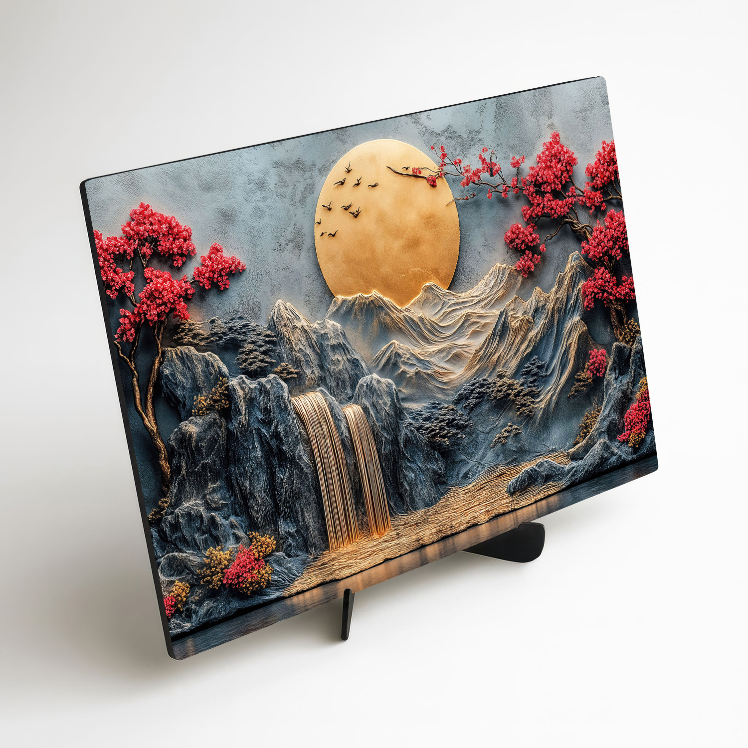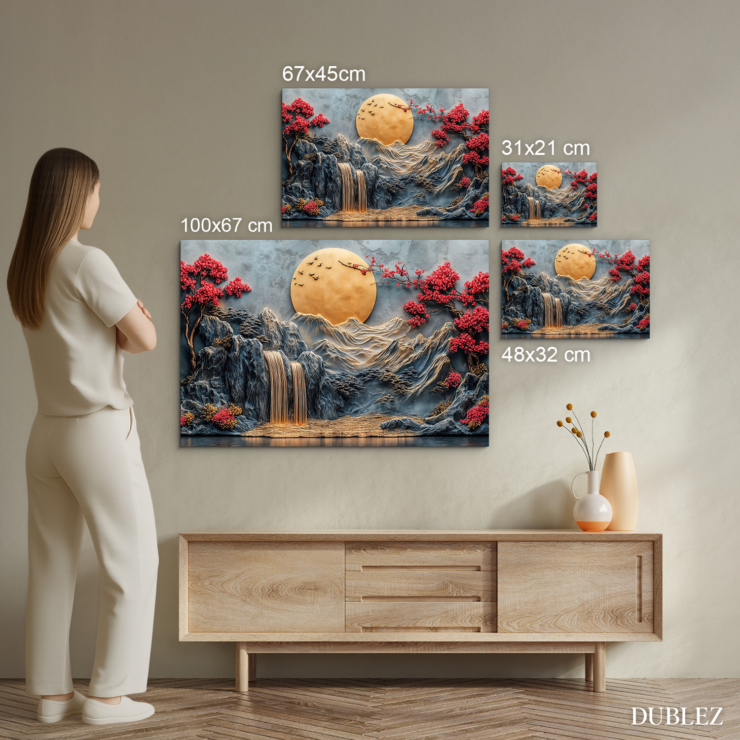 Dřevěný obraz s mystickým měsícem, zalitou krajinou, vodopádem a rozkvetlými třešněmi působí jako z jiného světa. Je spojením umění, krásné měděné barvy a obrazu přírody, přičemž červené květy okamžitě přitahují pozornost. Obraz je vysoce kvalitně vytištěn UV technologií přímo na dřevo, takže si zachovává sytost barev a zároveň působí elegantně a luxusně. Skvěle vynikne v obývacím pokoji nebo ložnici.