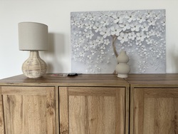 Zlatý strom se zaobleným kmenem a bohatou korunou posetou bílými květy zaujme precizním zpracováním a 3D efektem, který vytváří dojem hloubky a jemného lesku. Každý lístek i květ na tomto obraze působí lehce, jako by se vznášel. Ideální dekorace do světlých a vzdušných interiérů, kde má každý detail svůj smysl – do obýváku, ložnice, předsíně nebo kuchyně. Kombinace jemné bílé a elegantní zlaté přináší do prostoru lehkost, svěžest a nádech luxusu.
