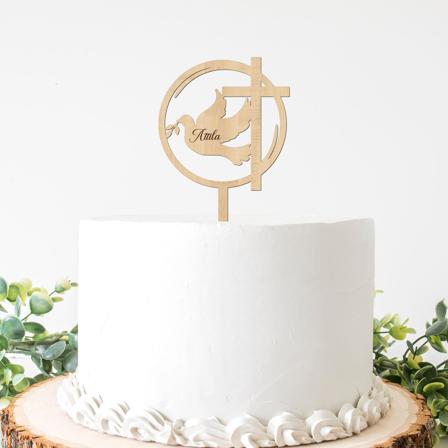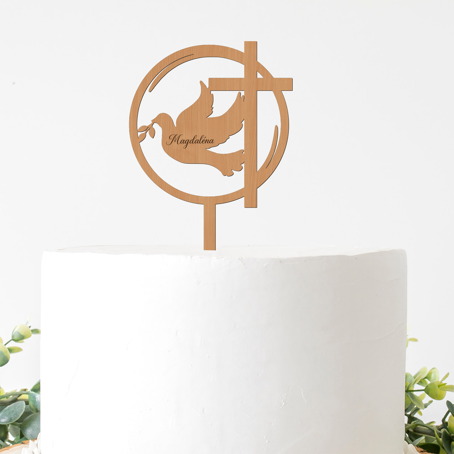 Personalizovaný drevený zápich do torty s motívom holubice a kríža je vhodný najmä na krstiny alebo prvé sväté prijímanie. V strede holubice gravírujeme meno dieťaťa, čo z tejto dekorácie robí nielen krásny doplnok na tortu, ale aj trvalú spomienku. Vďaka výberu dekoru podľa našej ponuky si jednoducho zladíte zápich s farebnou paletou oslavy.
