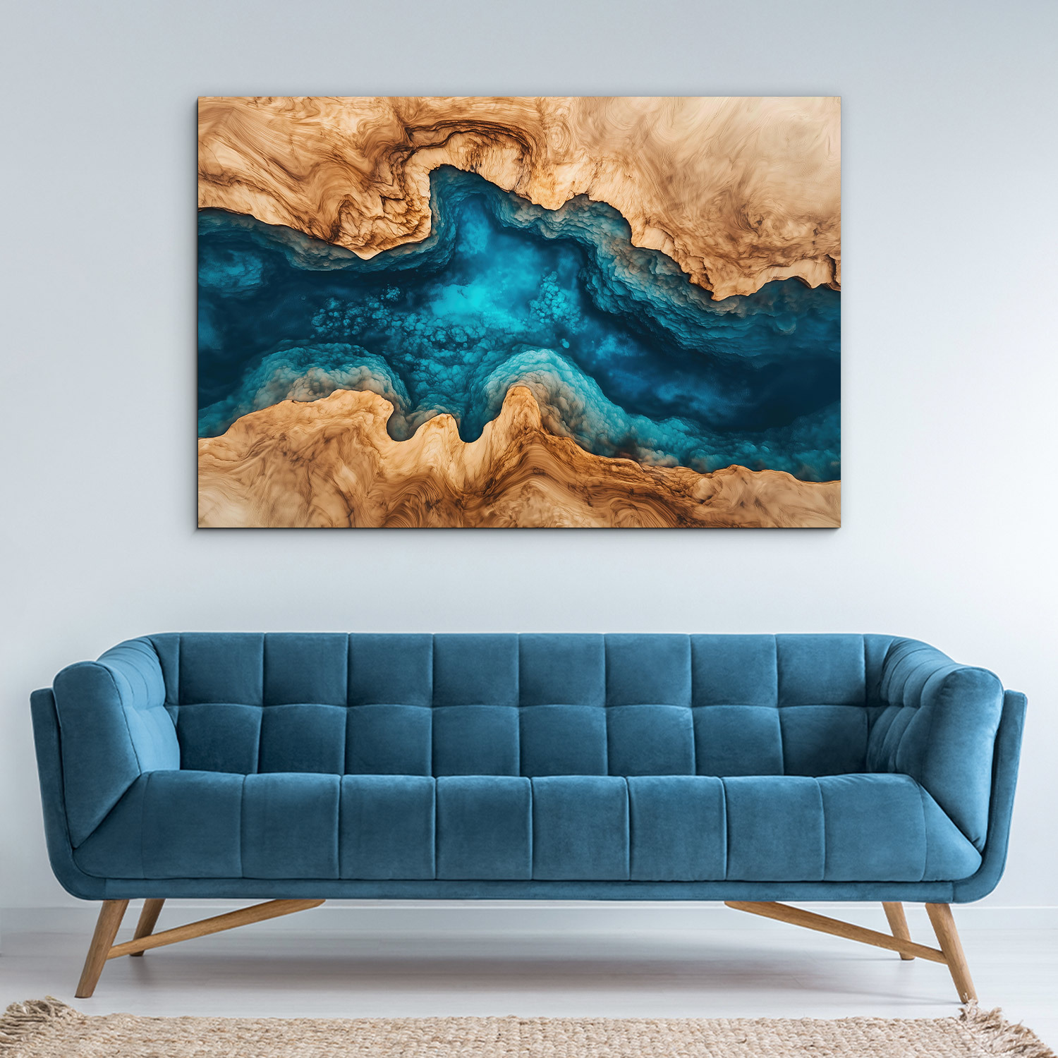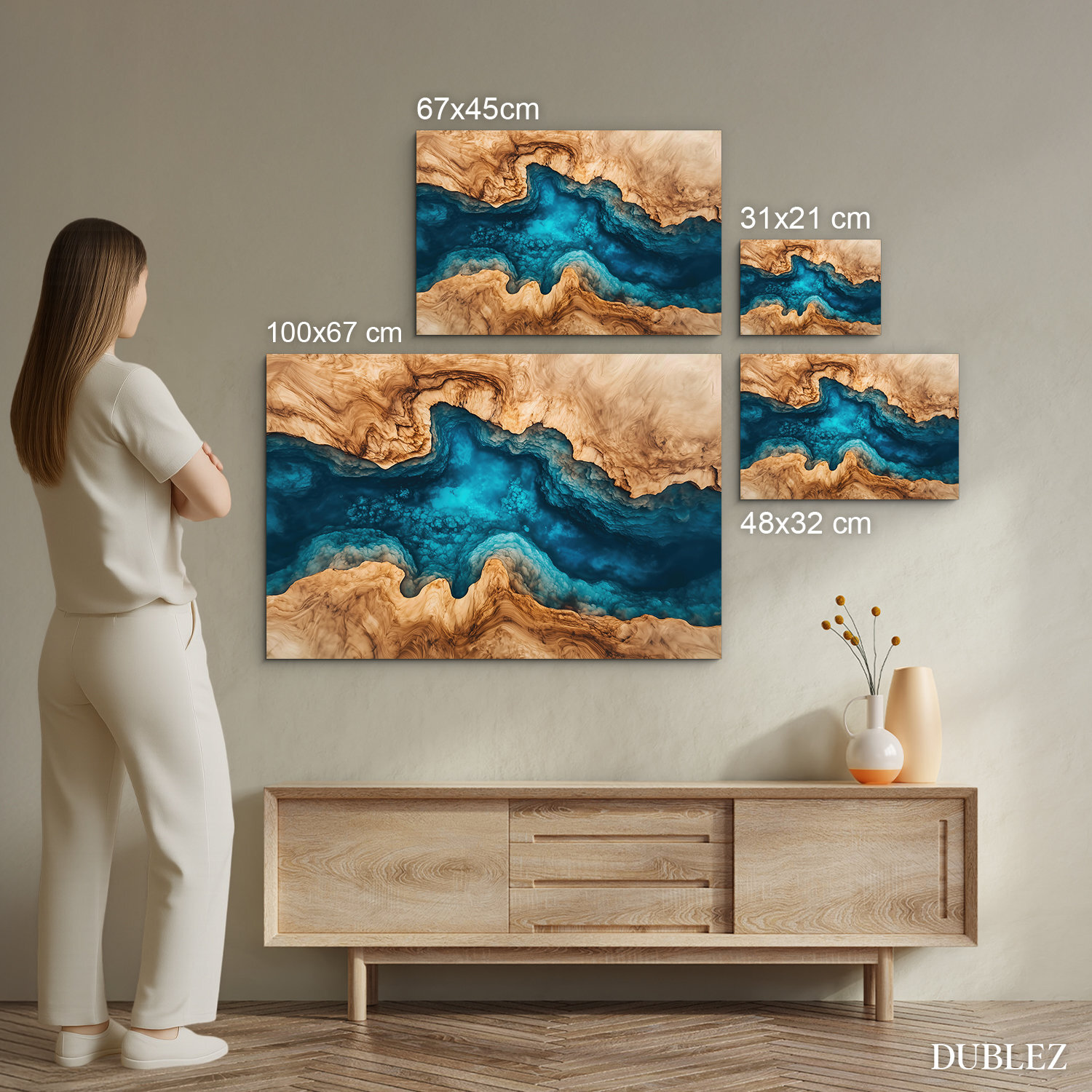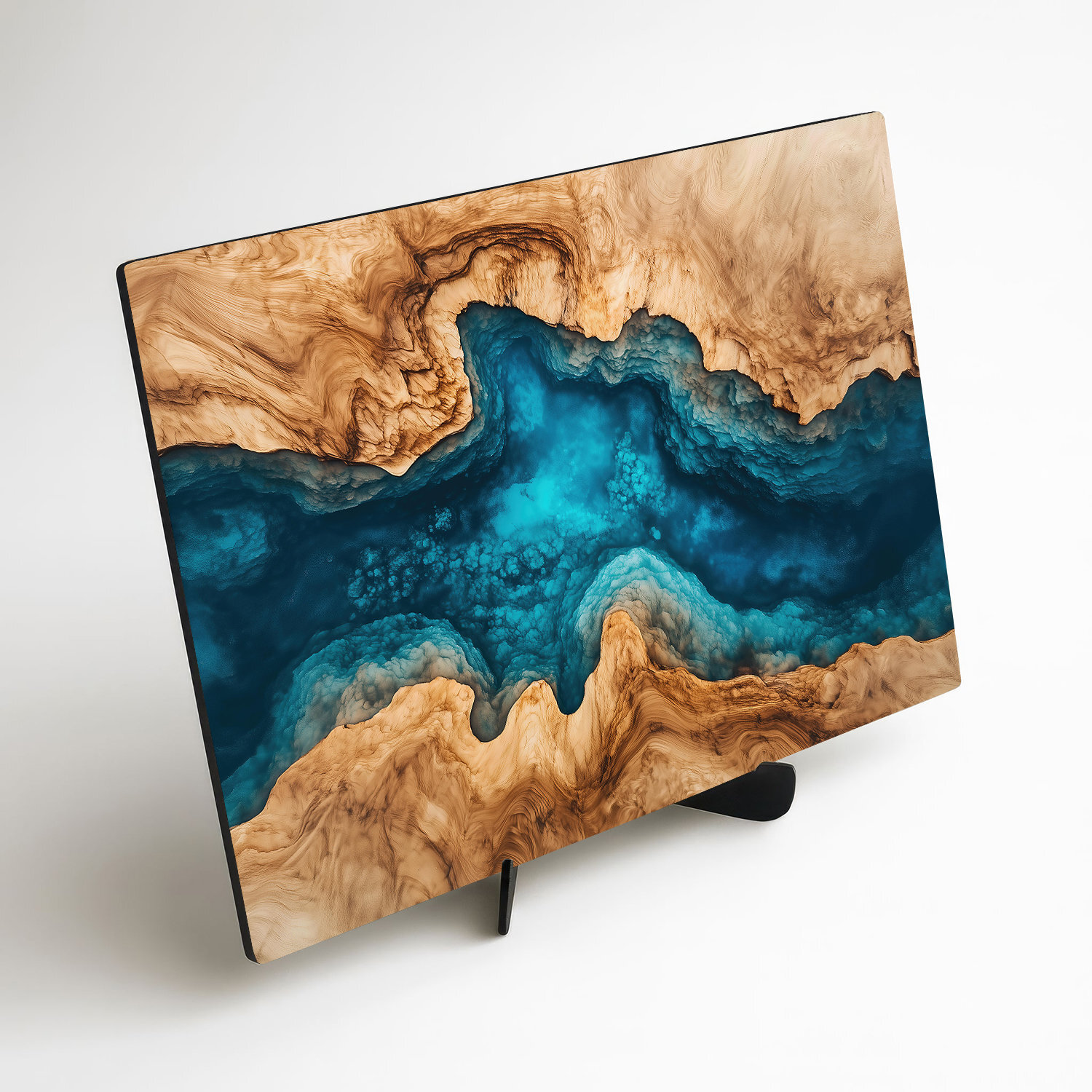 Imitace pryskyřice v kombinaci se dřevem, vytištěná ve vysoké kvalitě pro dlouhou životnost, přináší úžasnou hloubku a zářivé barvy. Dřevěný obraz spojuje krásu olivového dřeva s intenzivní modrou, přičemž realistické detaily a organické linie vytvářejí dojem skutečného epoxidového obrazu. Hluboký kontrast mezi dřevem a tyrkysově azurovou vodou okamžitě přitahuje pozornost a dodá interiéru nádech luxusu. Perfektní doplněk pro moderní i minimalistické interiéry.