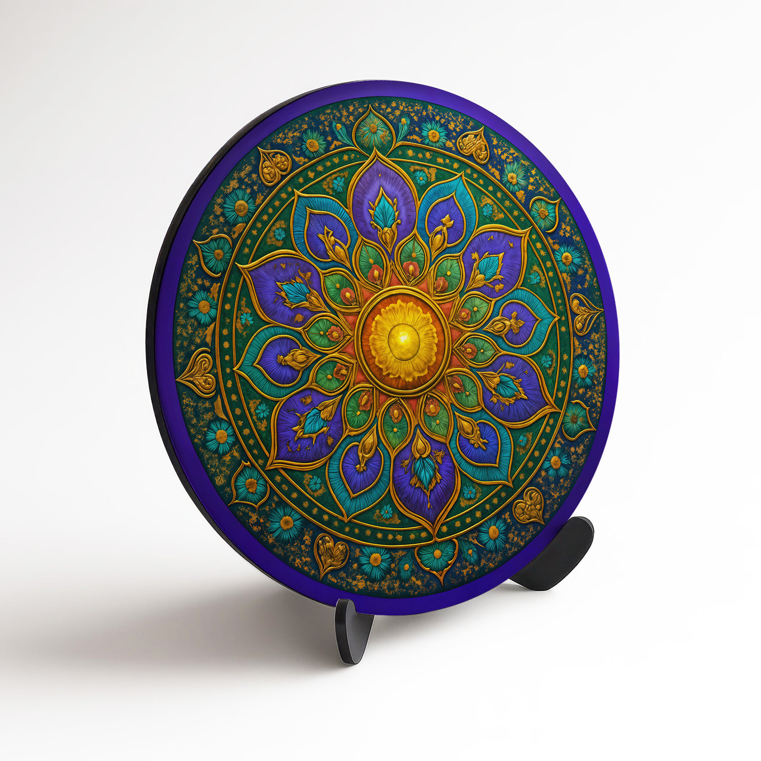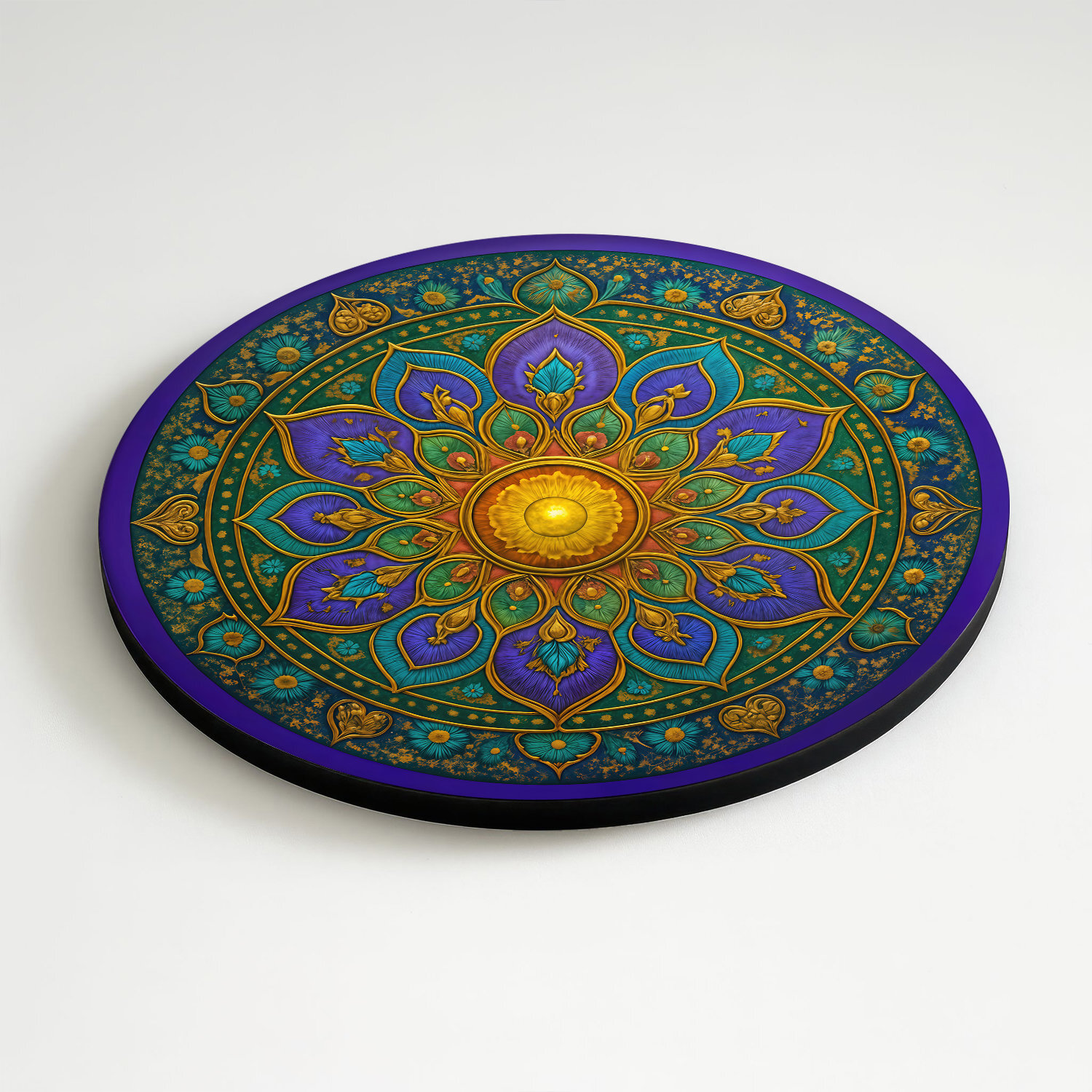 Uzdravující mandala na zeď - Srdce Orientu je spirituální dekorace, která v sobě spojuje sílu barev, symbolů a klidu. Fialová, tyrkysová a zlatá evokují duševní sílu, vnitřní stabilitu a energii. Srdce ve středu znázorňuje lásku a vitální sílu. Dřevěný obraz se dokonale hodí do meditačních místností, ložnic či terapeutických místností, kde podporuje harmonii a léčivou atmosféru.