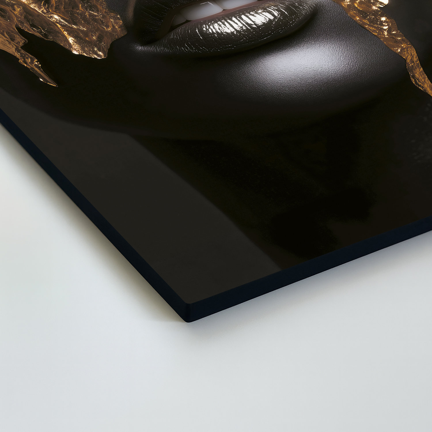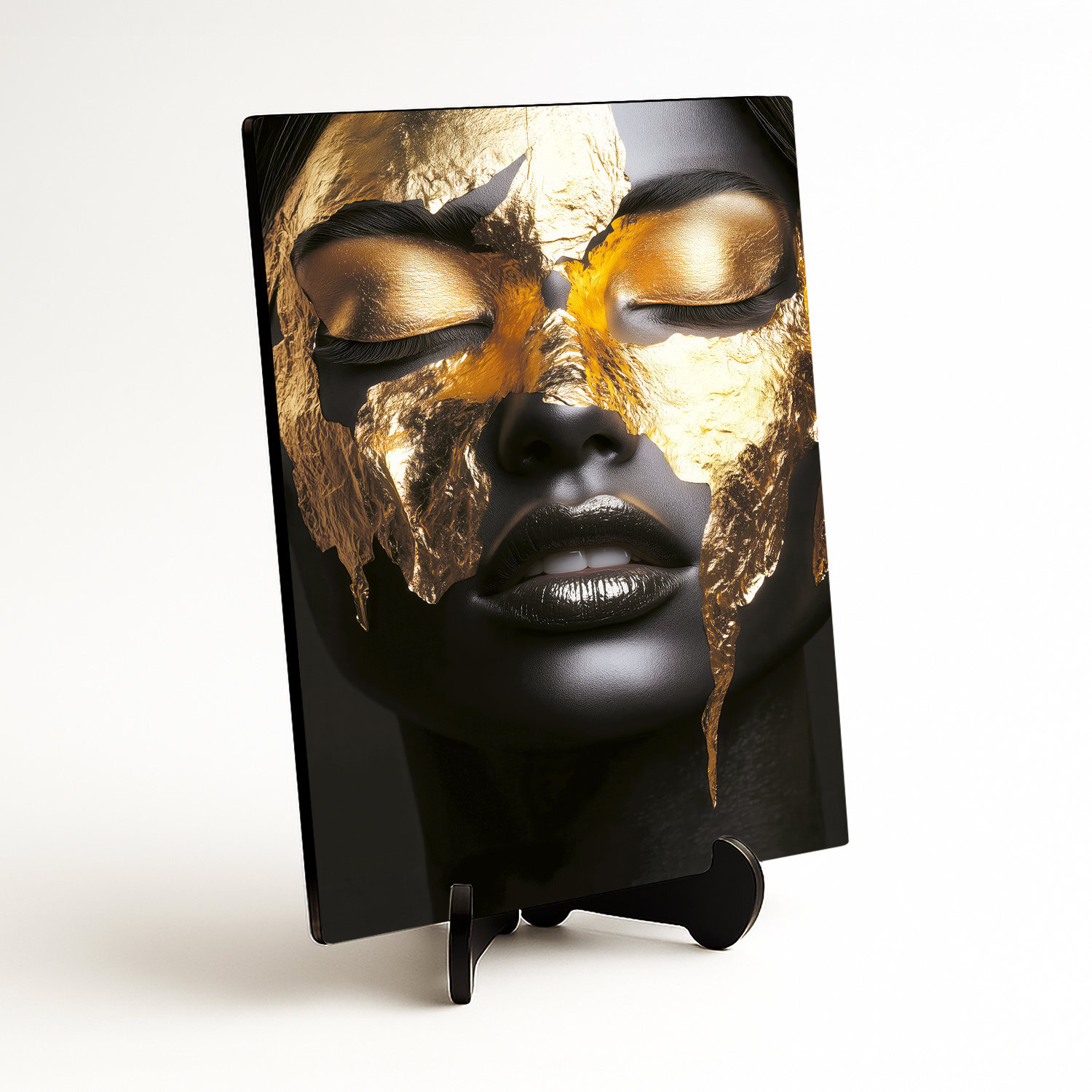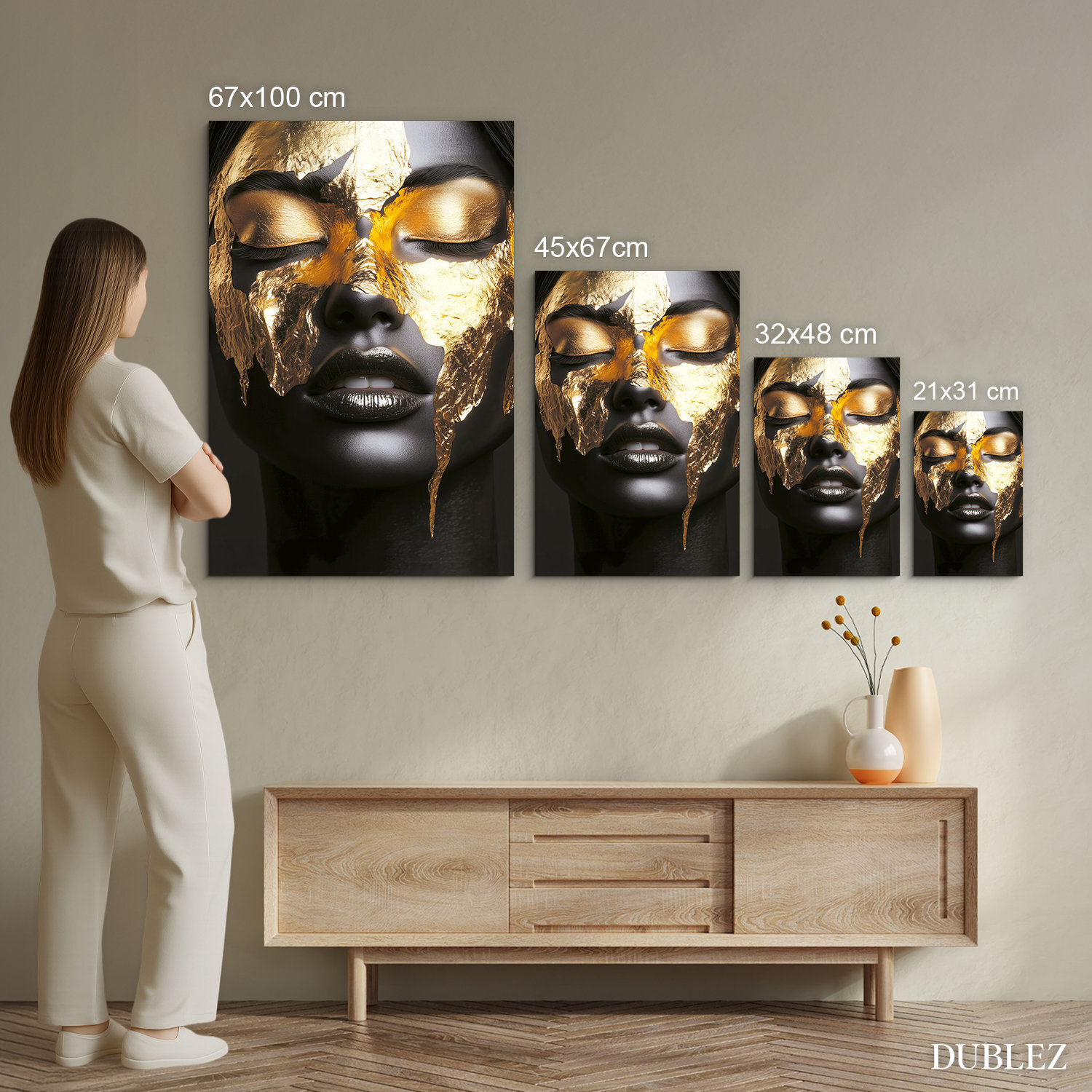 Dřevěný obraz zachycuje portrét ženy, jejíž tvář je pokryta zlatými lístky. Kontrast mezi černou a zlatou vytváří obraz, který okamžitě upoutá pozornost. Jemné zlaté detaily na tváři dodávají obrazu luxusní a moderní vzhled. Obraz ženy se hodí do moderních a minimalistických interiérů, kde dodá styl a eleganci. Perfektně se hodí do obývacího pokoje, ložnice či kanceláře.