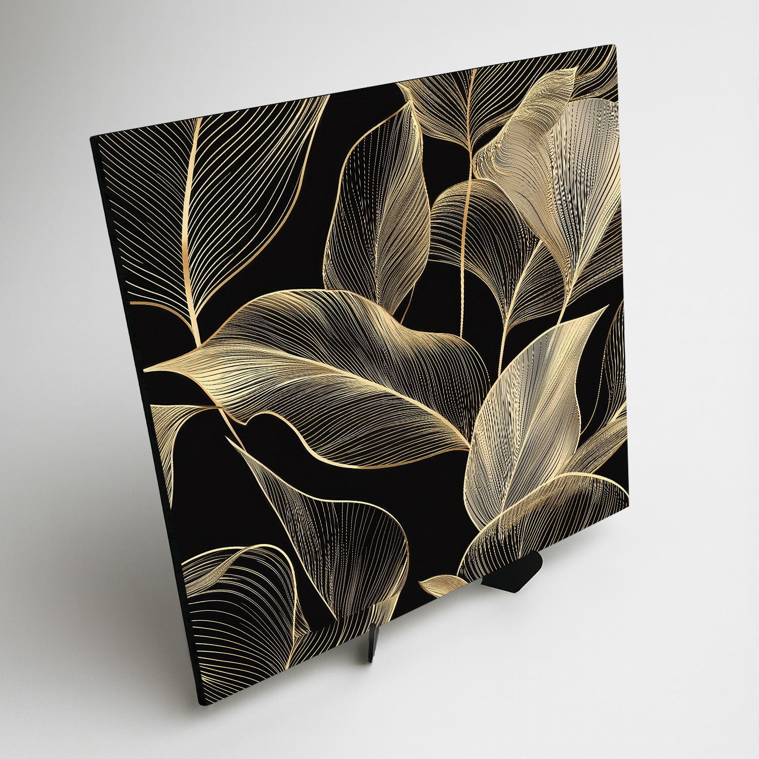Dřevěný luxusní obraz s liniovou kresbou listů ve zlaté barvě na výrazném černém pozadí přináší do interiéru moderní design. Nadčasový obraz do obývacího pokoje, ložnice, předsíně i kanceláře. Botanický obraz listů funguje jako nadčasové téma pro milovníky čistých linií a pěkného bydlení.
