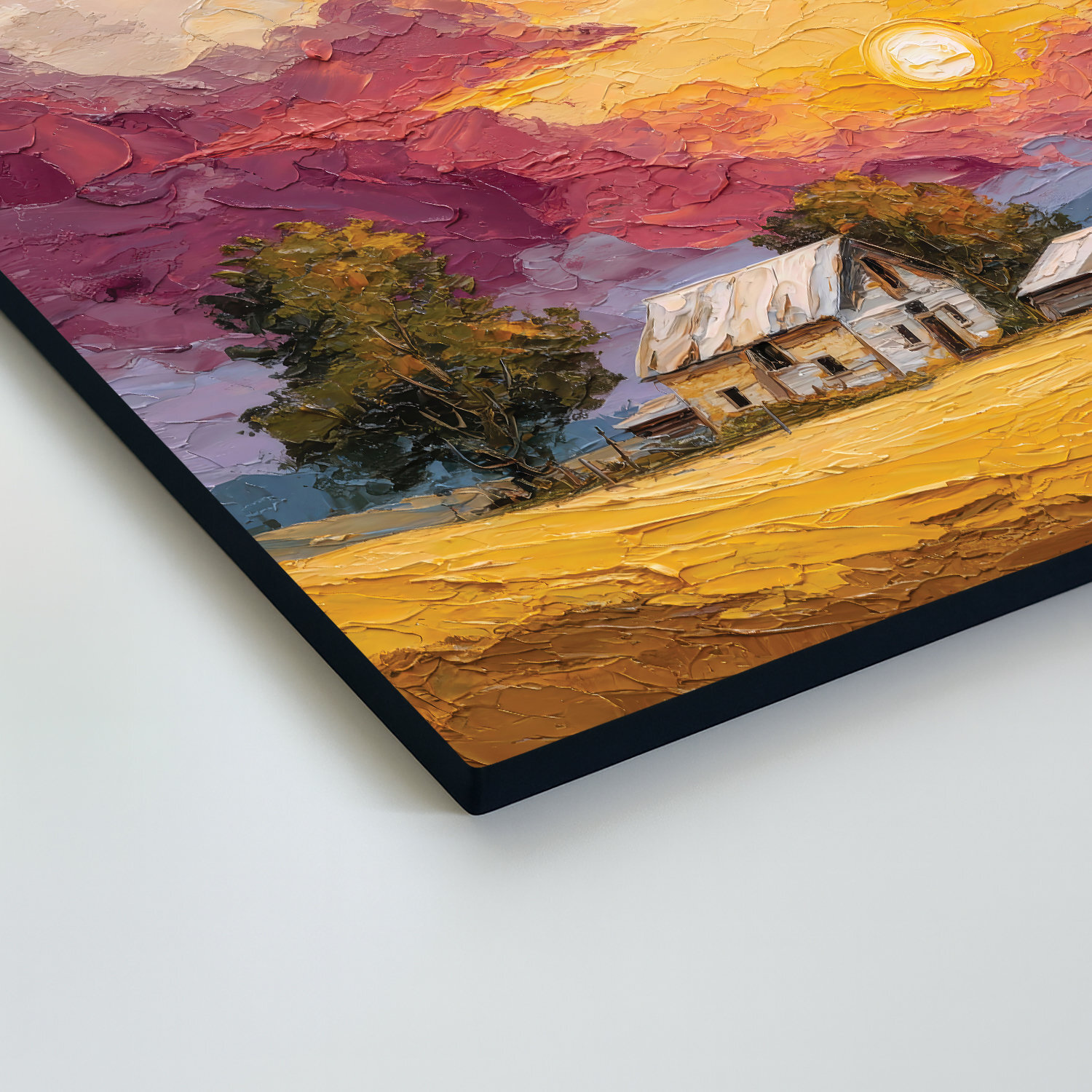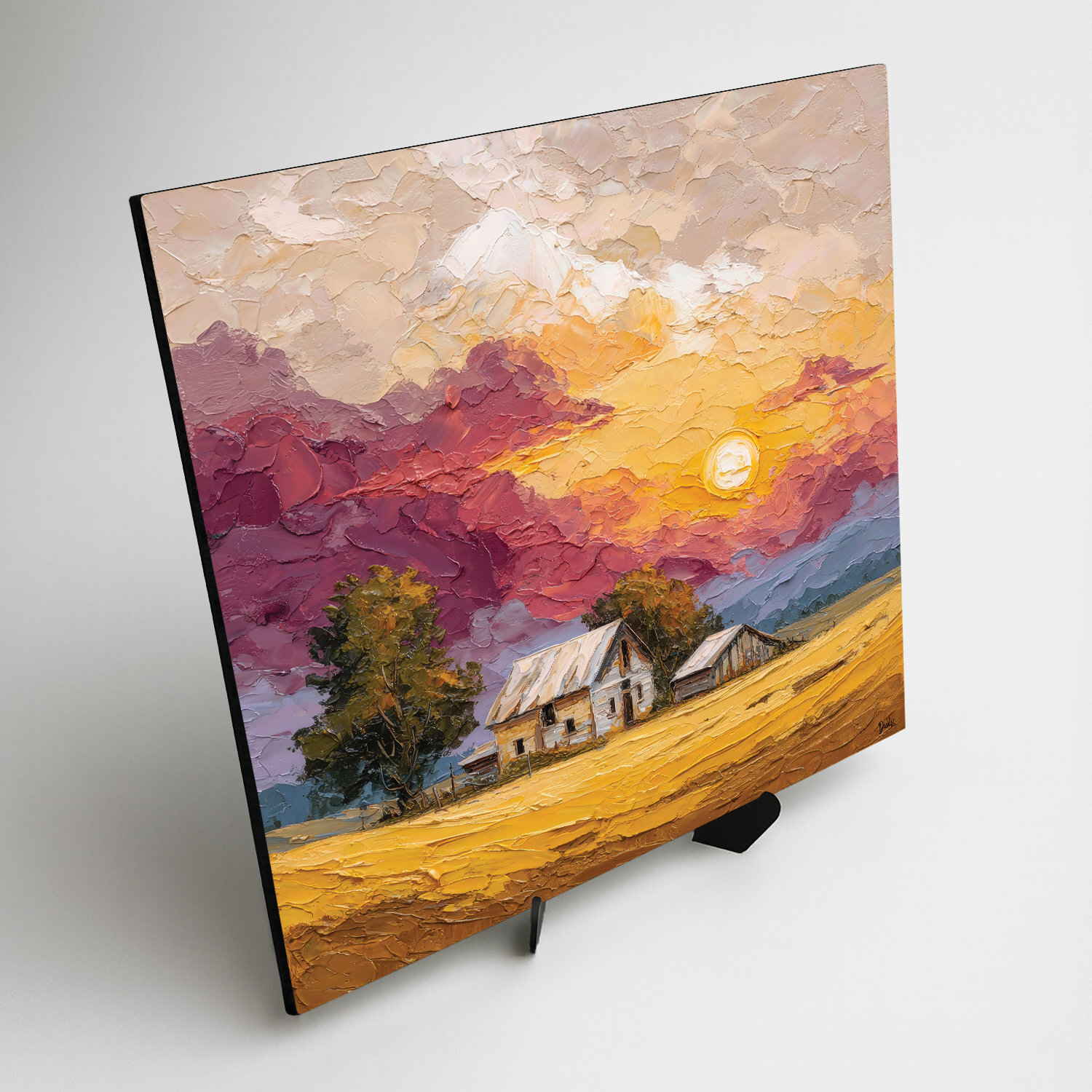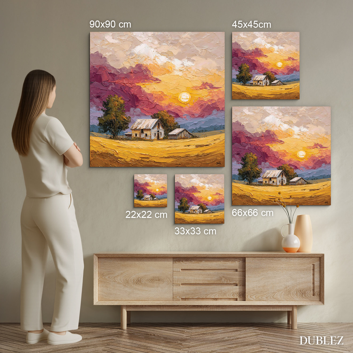 Krásný obraz západu slunce nad polem a starým domkem vytvoří doma příjemnou a klidnou atmosféru. Vypadá jako ručně malovaný – s hrubými tahy štětce a bohatými vrstvami barvy, ale ve skutečnosti jde o kvalitní UV tisk na pevný dřevěný materiál. Teplé barvy jako žlutá, oranžová a fialová působí uklidňujícím dojmem a hodí se do každé místnosti – do obývacího pokoje, ložnice i na chodbu. Dřevěný obraz je skvělý také jako dárek pro rodiče nebo prarodiče.
