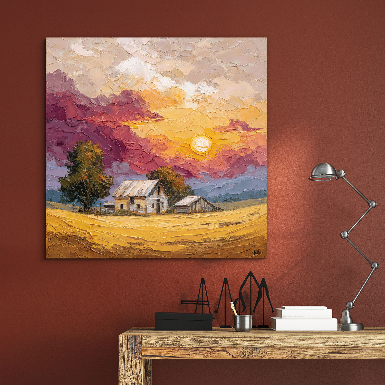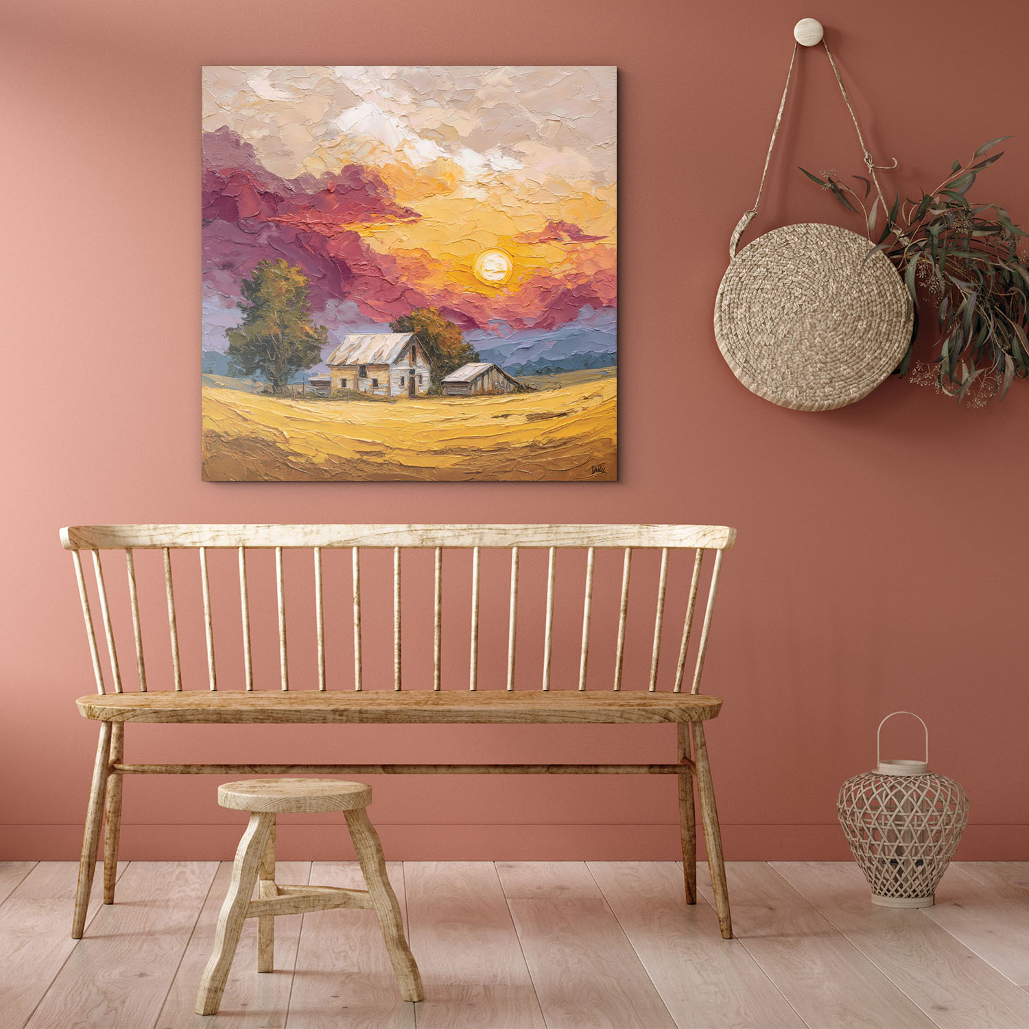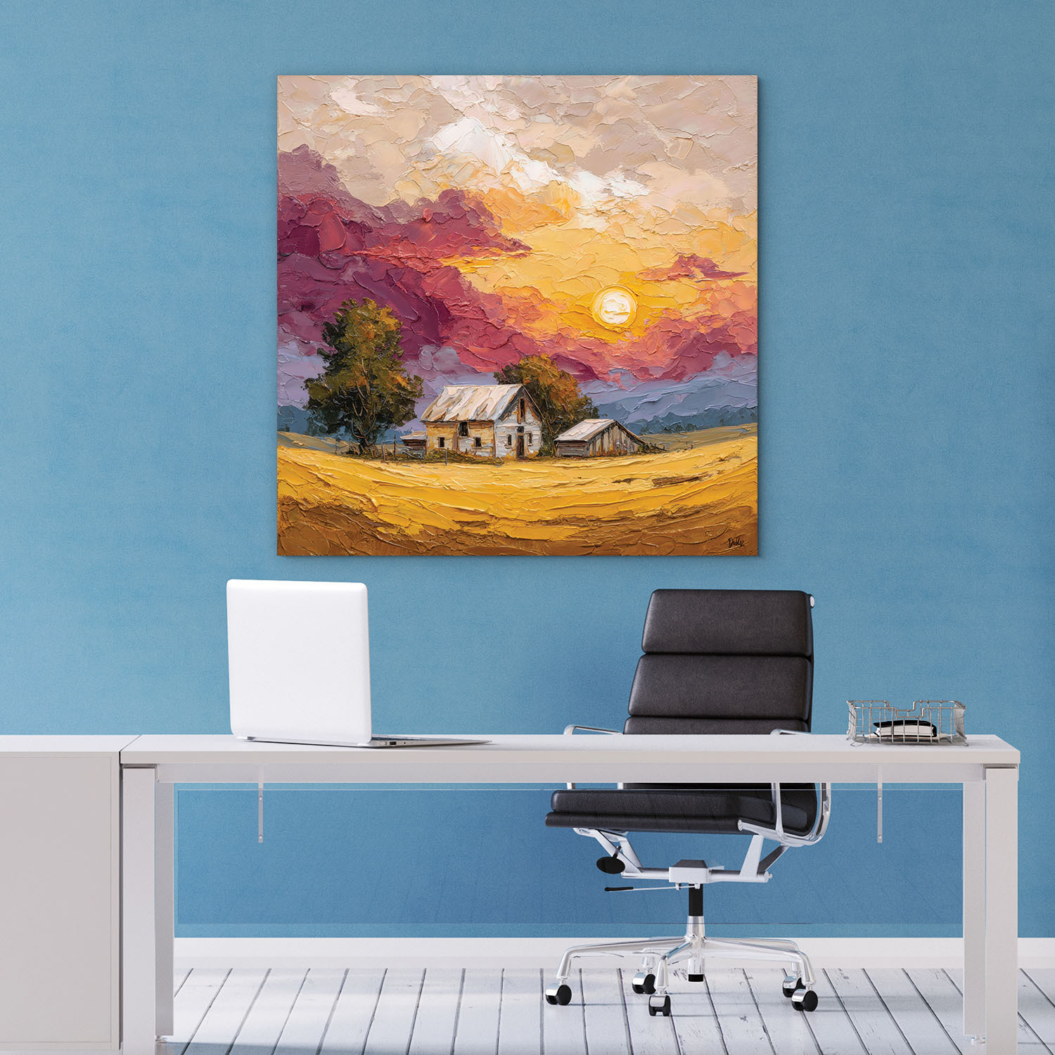 Krásný obraz západu slunce nad polem a starým domkem vytvoří doma příjemnou a klidnou atmosféru. Vypadá jako ručně malovaný – s hrubými tahy štětce a bohatými vrstvami barvy, ale ve skutečnosti jde o kvalitní UV tisk na pevný dřevěný materiál. Teplé barvy jako žlutá, oranžová a fialová působí uklidňujícím dojmem a hodí se do každé místnosti – do obývacího pokoje, ložnice i na chodbu. Dřevěný obraz je skvělý také jako dárek pro rodiče nebo prarodiče.