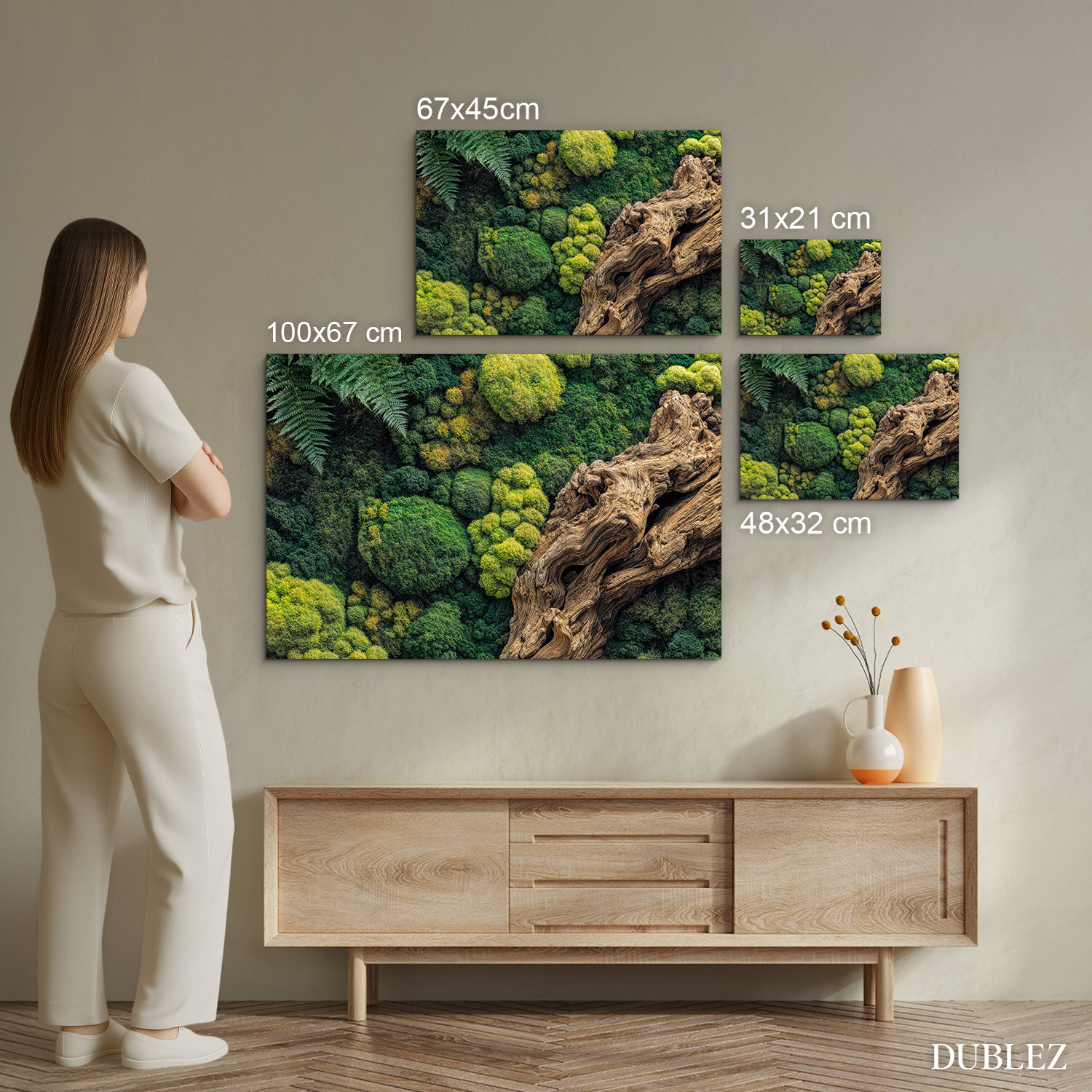 Imitace mechového obrazu a masivního kořene přináší do interiéru dotek lesa a jedinečný pocit spojení s přírodou. Obraz je vyroben UV tiskem ve vysoké kvalitě, přičemž realisticky imituje strukturu mechu a kresbu dřeva. Výborně zapadne do obývacího pokoje, pracovny, chodby, kanceláře, ale také do relaxačních zón jako wellness či jogové studio. Hodí se do moderního interiéru, ale i do prostor laděných v boho, skandinávském či přírodním stylu.