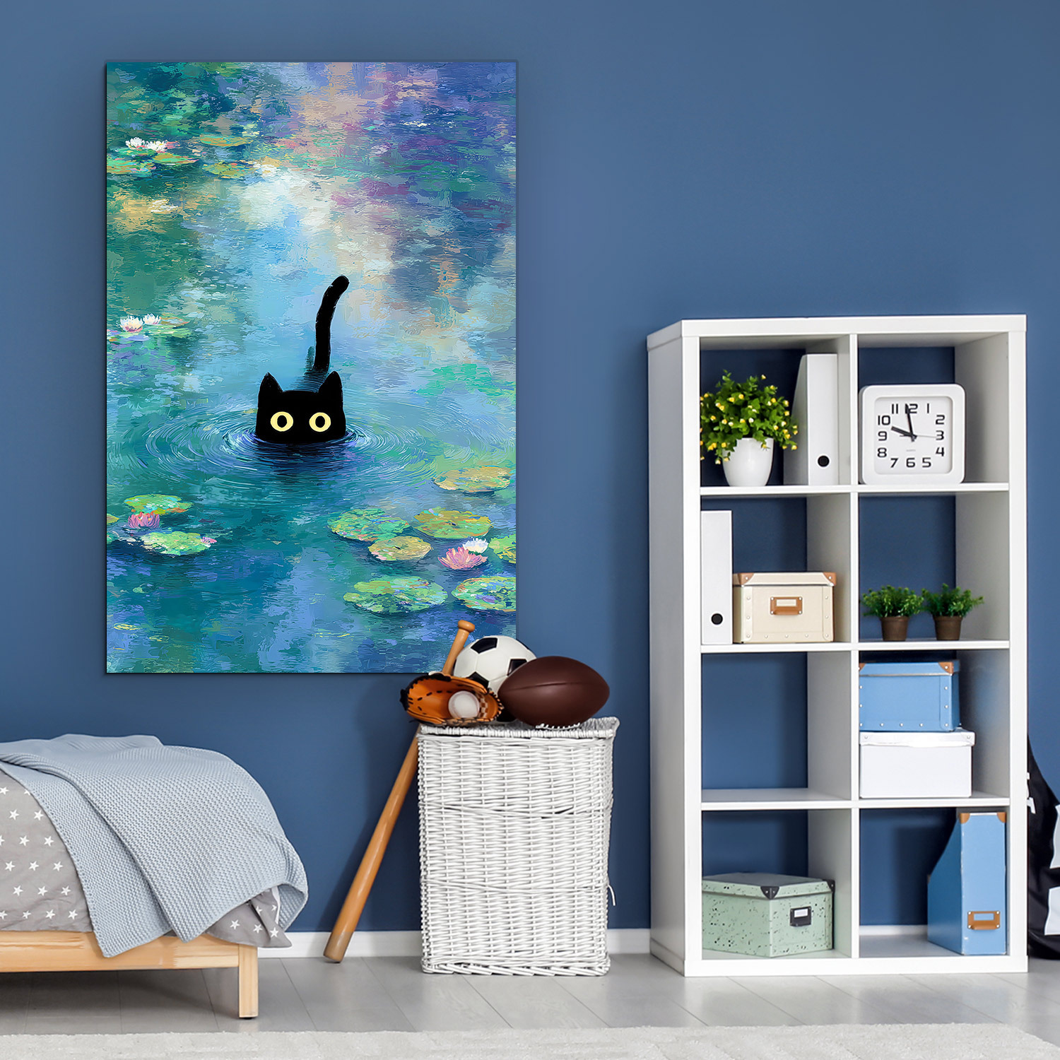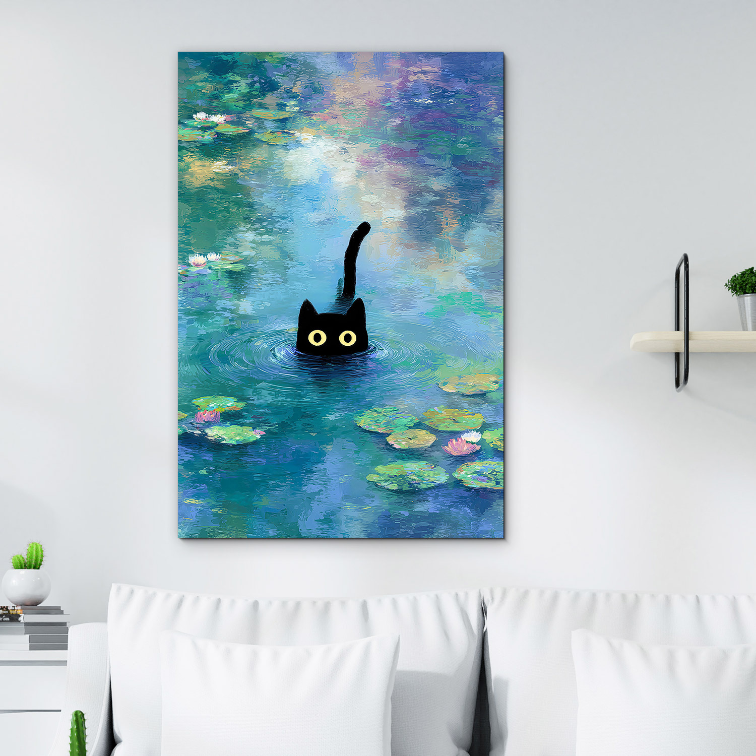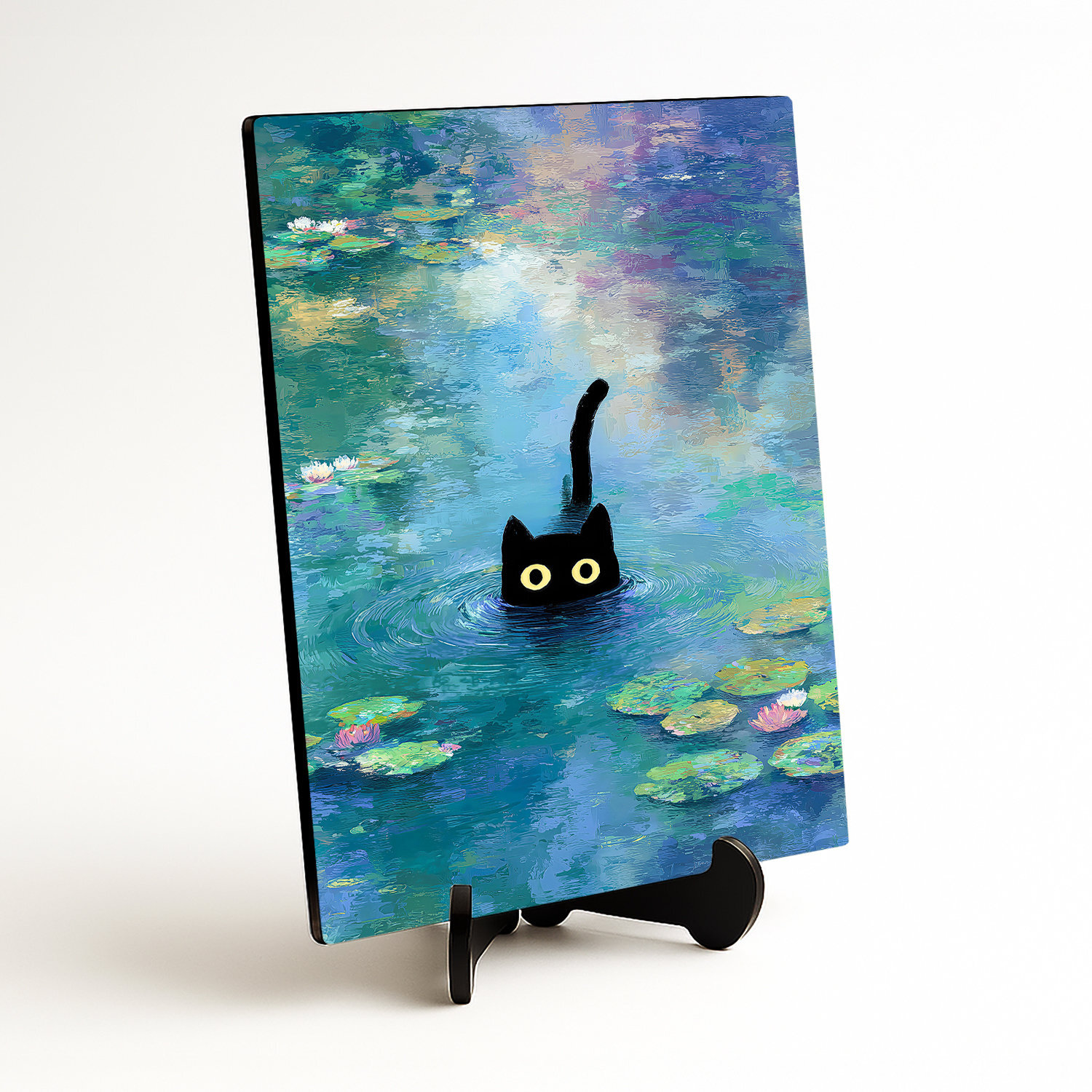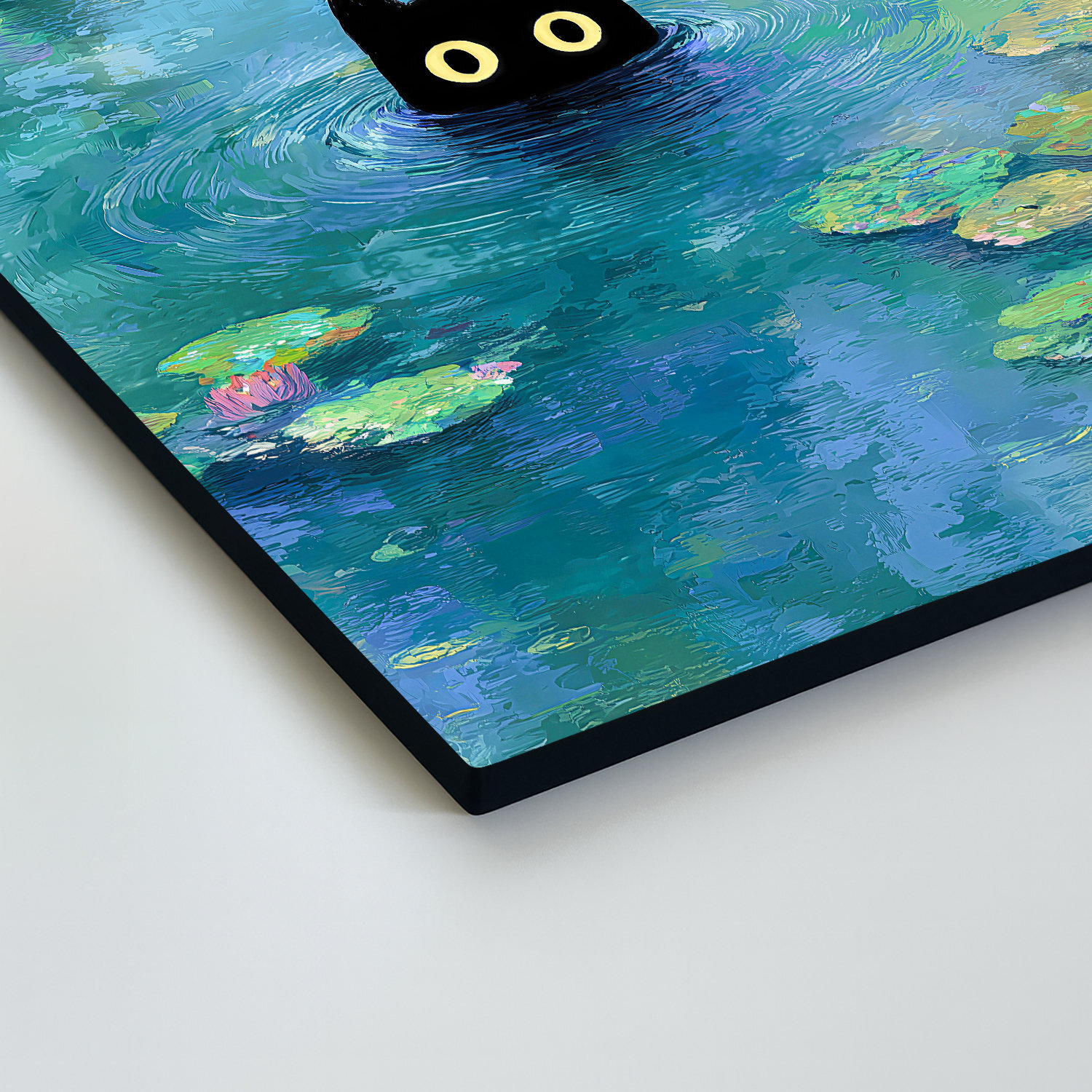 Barevný obraz černé kočky mezi lekníny přináší do interiéru moderní, impresionistický design inspirovaný Monetem. Dřevěný obraz na zeď se hodí do moderní obývacího pokoje, dětského a studentského pokoje i do kreativní kanceláře, kde podpoří dobrou náladu a přinese originální příběh.