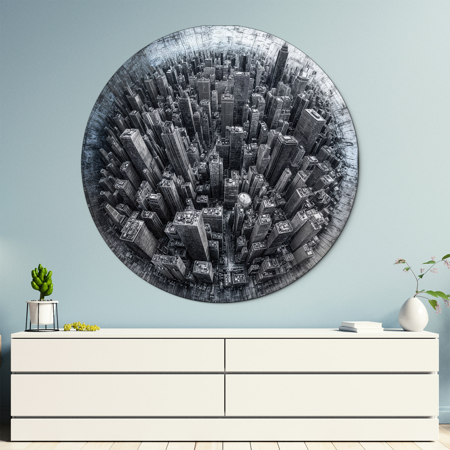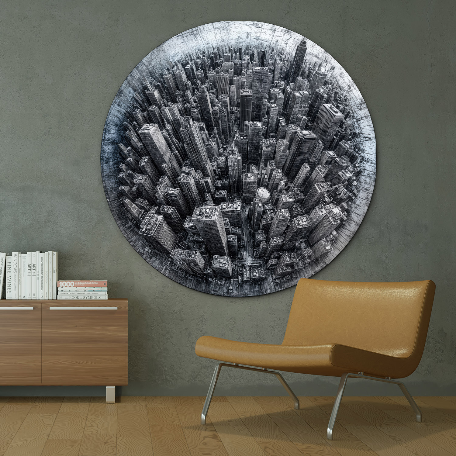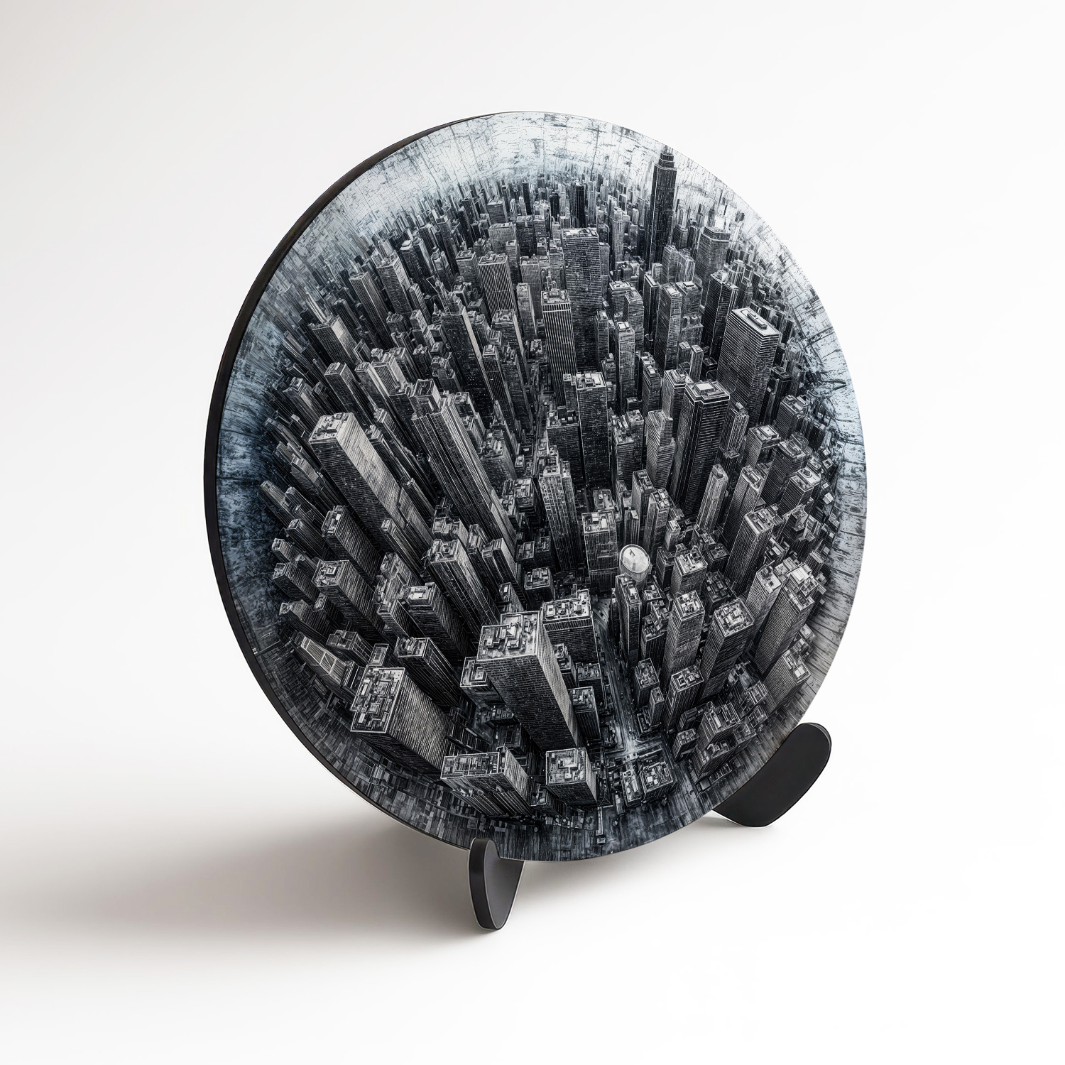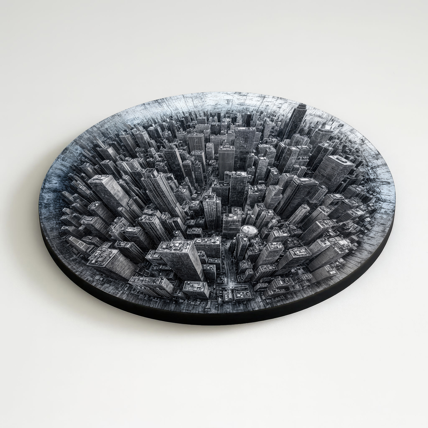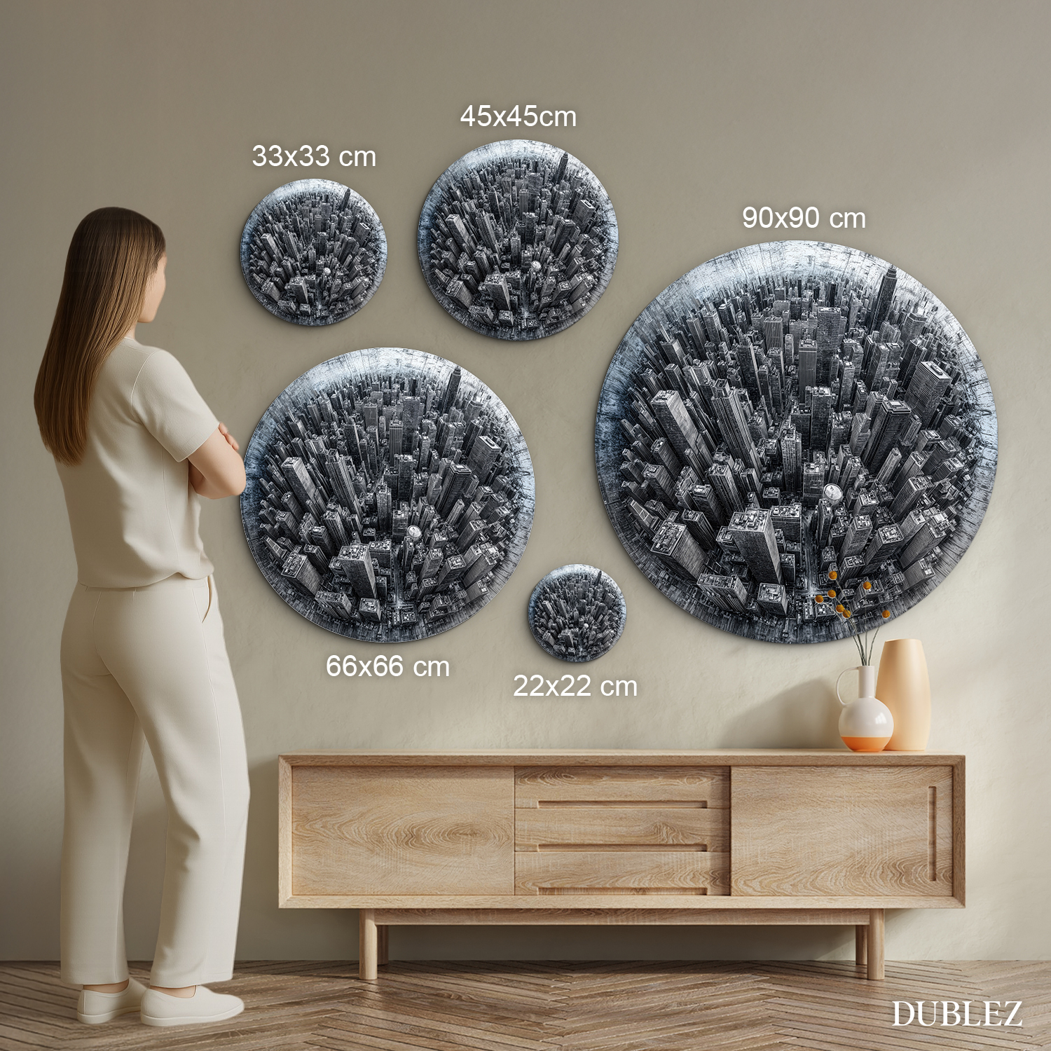 Kulatý obraz s pohledem na město z ptačí perspektivy okamžitě zaujme každého milovníka moderního designu, architektury a výšek. Realisticky ztvárněné mrakodrapy vytvářejí zajímavý 3D efekt. Monochromatická černobílá paleta dělá tento obraz ideálním doplňkem do kanceláře, studia či industriálně laděného bydlení. Díky UV tisku na kvalitní dřevěný podklad je obraz odolný, sytý a detailně zpracovaný. Vhodný jako dárek pro architekty, urbanisty či fanoušky metropolí, kteří ocení každý detail této městské scenérie.
