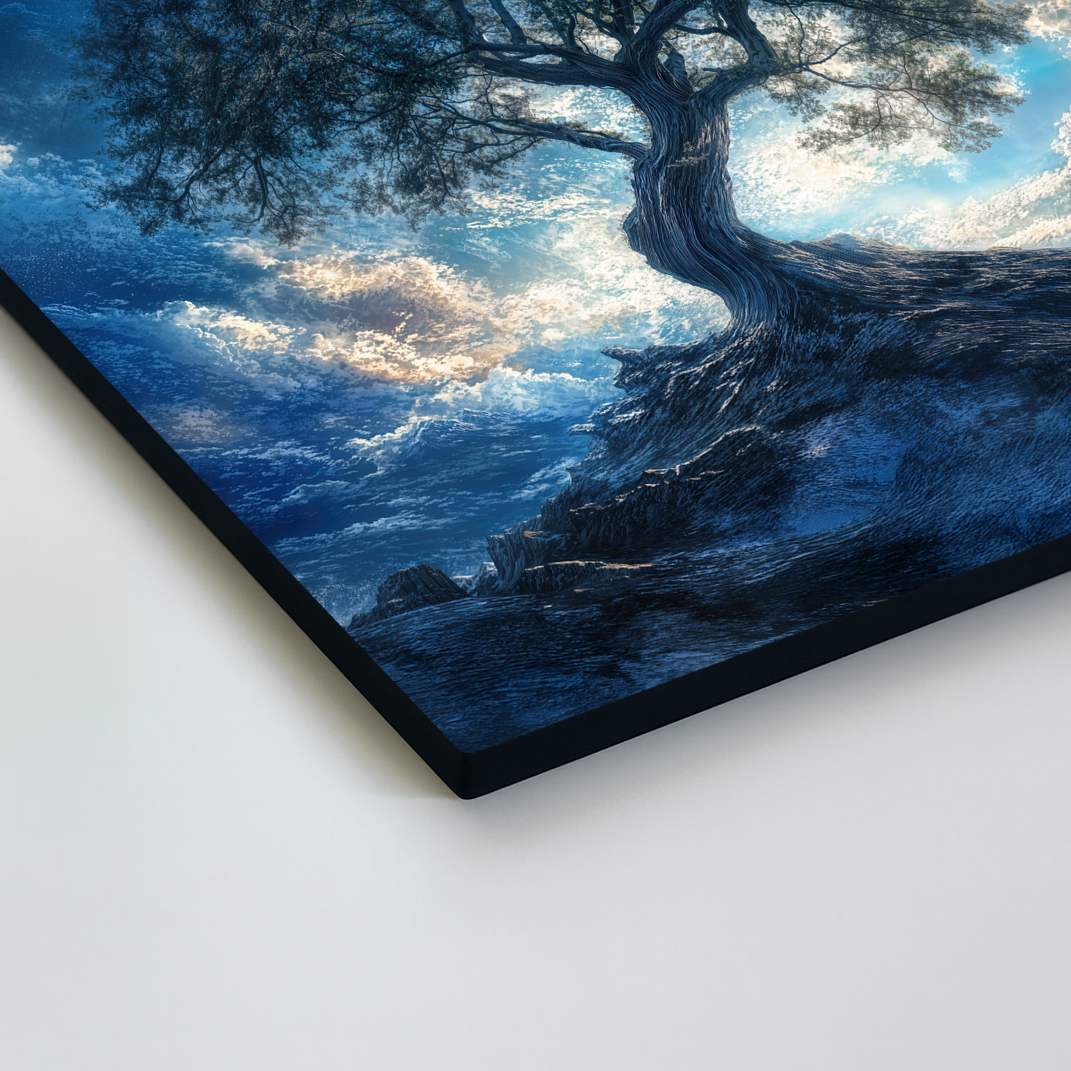 Mezi nebem a zemí vyrůstá mystický strom života – symbol propojení, energie a nekonečna. Jeho mohutné kořeny se hluboko noří do temné půdy neznáma, zatímco jeho větve se dotýkají hvězd, aby čerpaly sílu přímo z vesmíru. Nad ním se vznáší měsíc jako připomínka, že jsme všichni součástí velkolepého univerza.