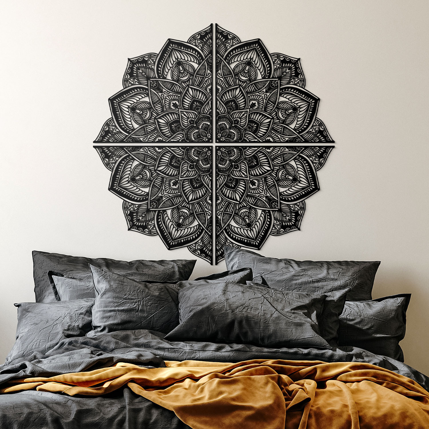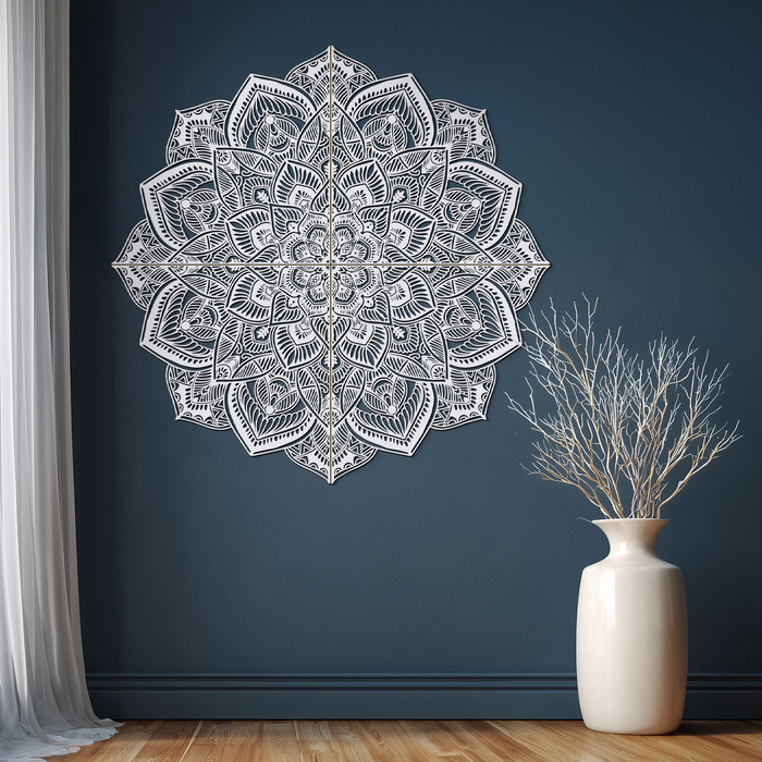 Poznámka: Mandala je vzhledem na nadrozměrnou velikost rozdělená na 4 částí. V galerii produktu se nachází detailní rozdělení jednotlivých částí pro lepší představu. Rozměry výrobku, které jsou uvedeny v popisu jsou rozměry po rozložení na stěnu i s mezírkou mezi částmi mandaly.
