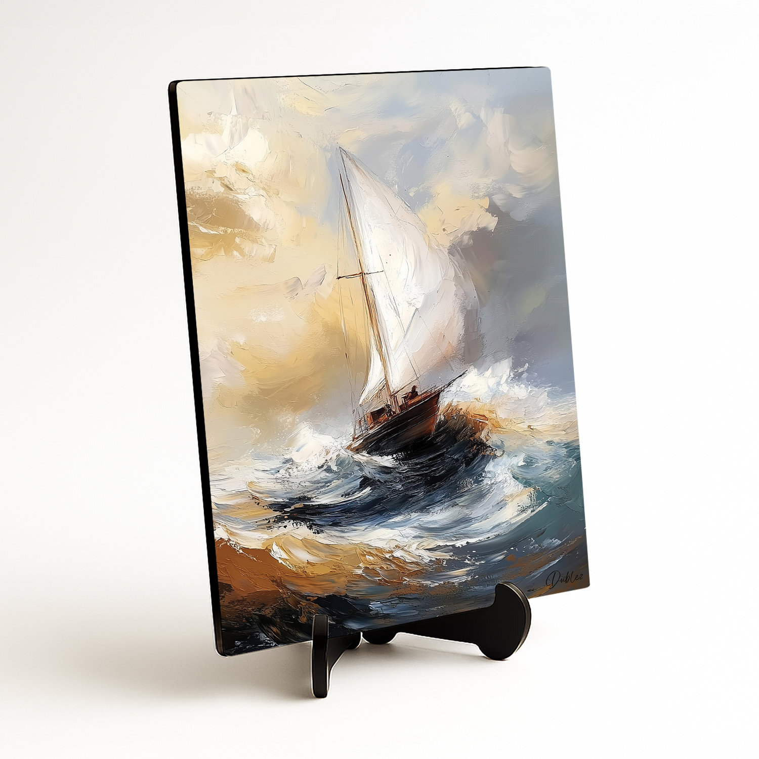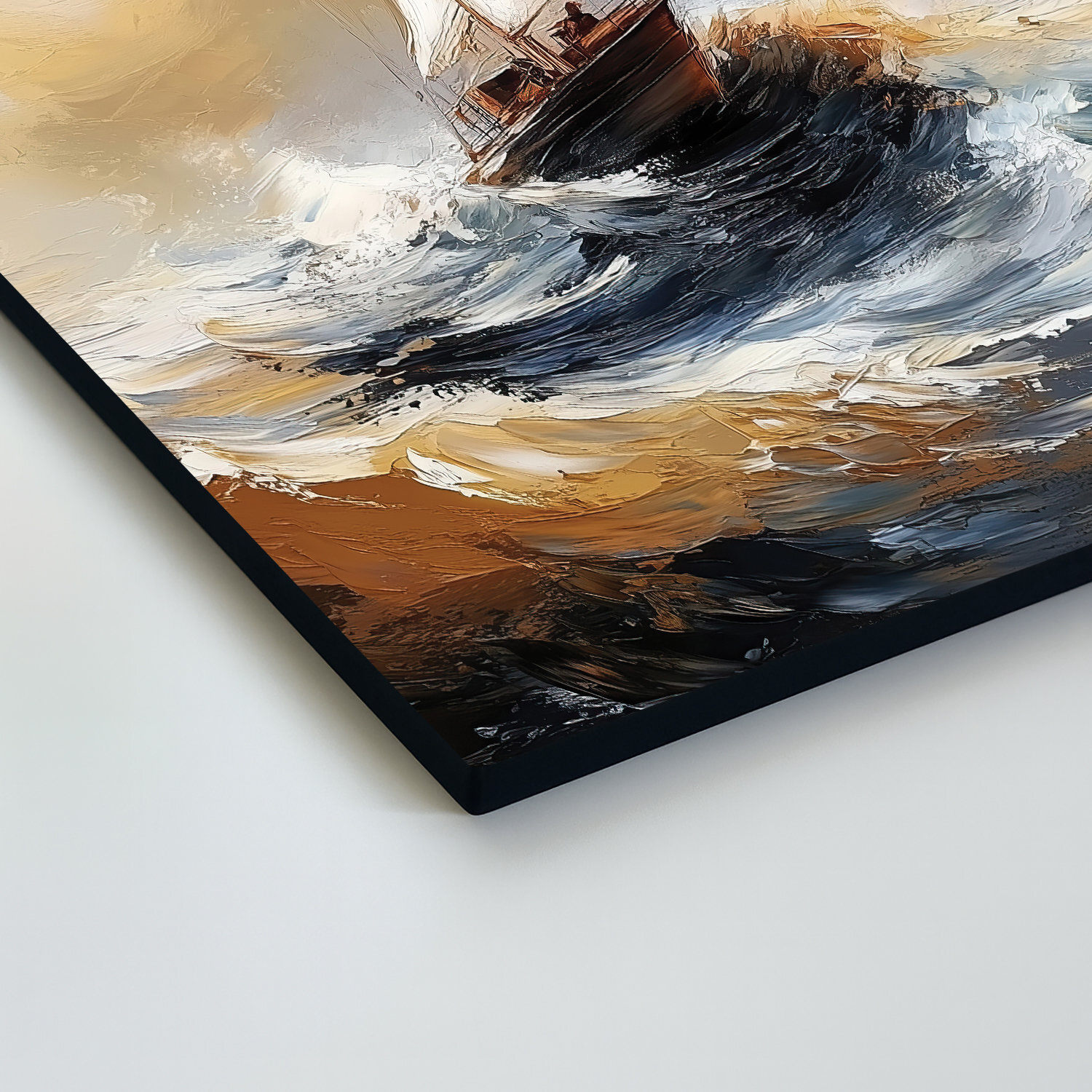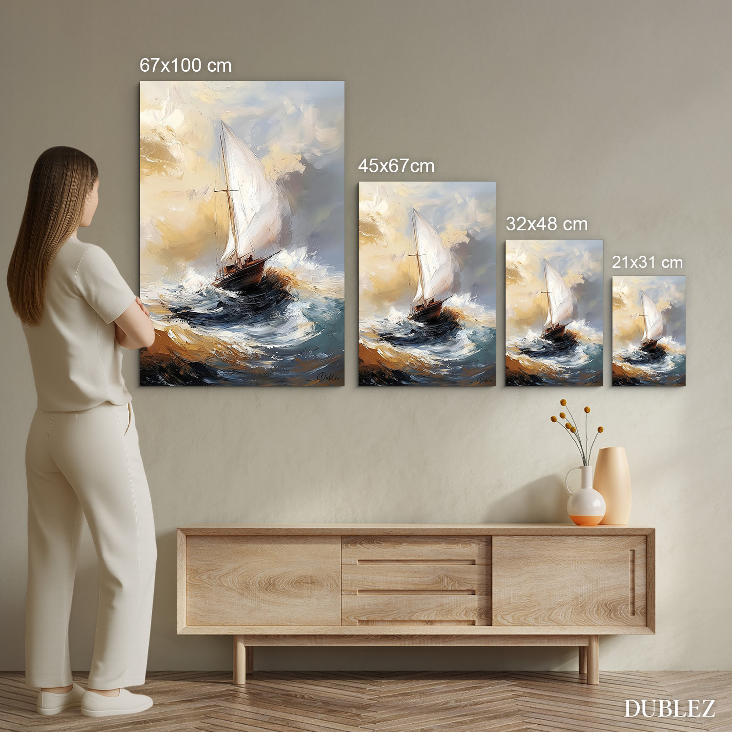 Dřevěný obraz plachetnice překonávající rozbouřené vlny moře při světle zapadajícího slunce přináší do interiéru kontrast jemných zlatých a modrých odstínů. Perfektně vynikne v obývacím pokoji, chodbě nebo kanceláři. Stejně tak se hodí do prostor s přírodním nebo námořnickým stylem.