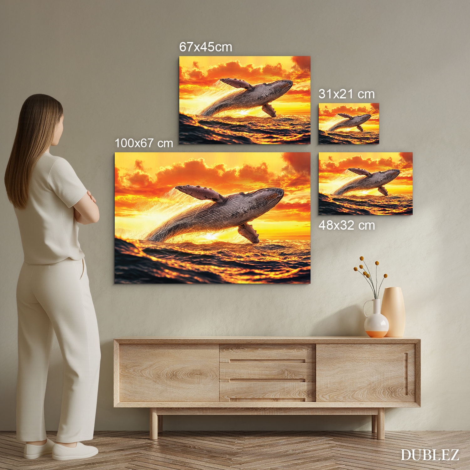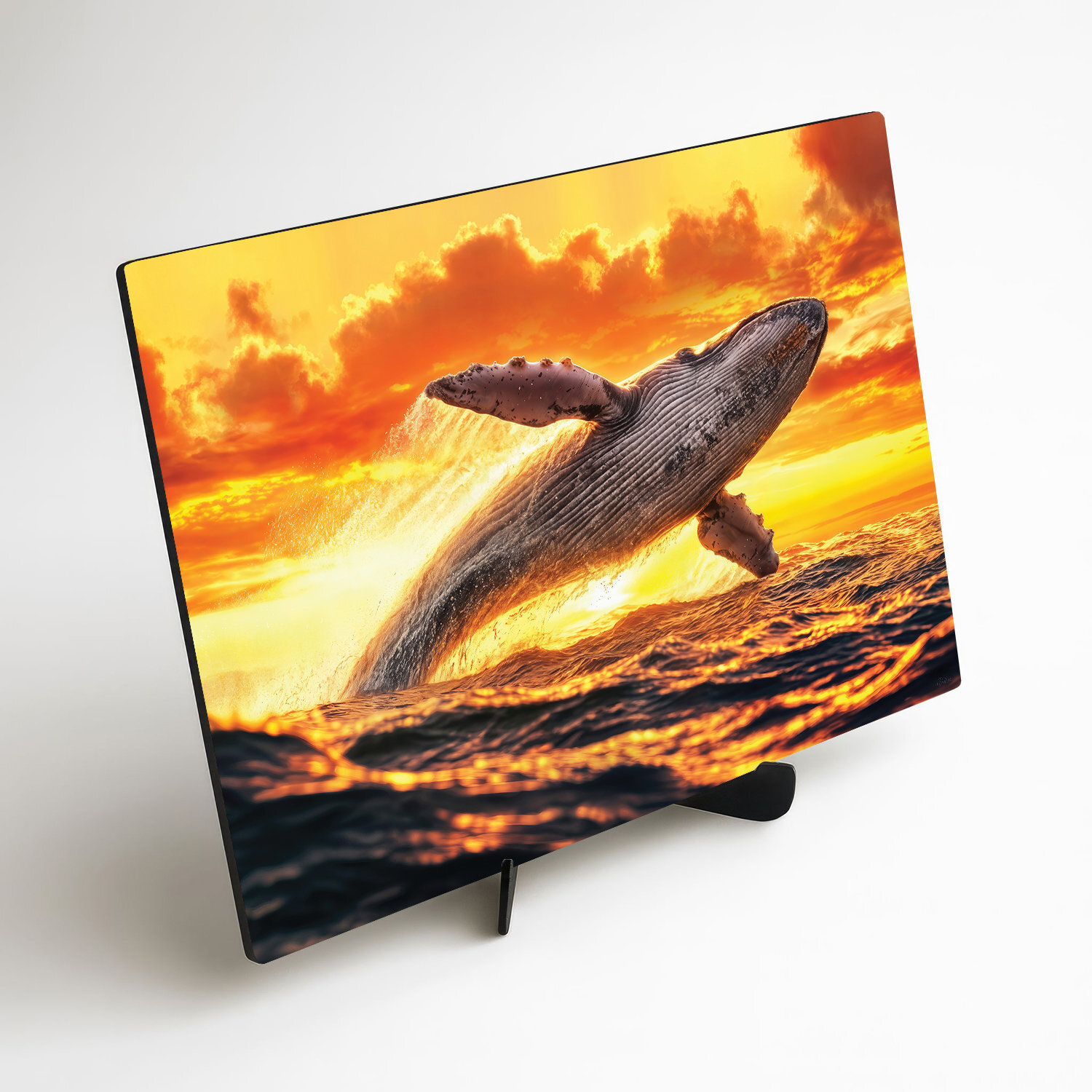 Velryba skákající nad hladinu oceánu, zachycená při světle západu slunce. Tento dřevěný obraz moře a velryby oživí moderní interiér, pracovnu i obývací pokoj. Detaily stříkající vody a těla velryby zachycené na dřevě z něj dělají nepřehlédnutelný bytový doplněk. Je ideální pro milovníky moře, cestování a nespoutané přírody.