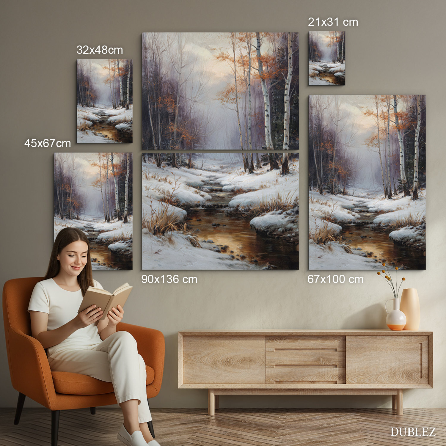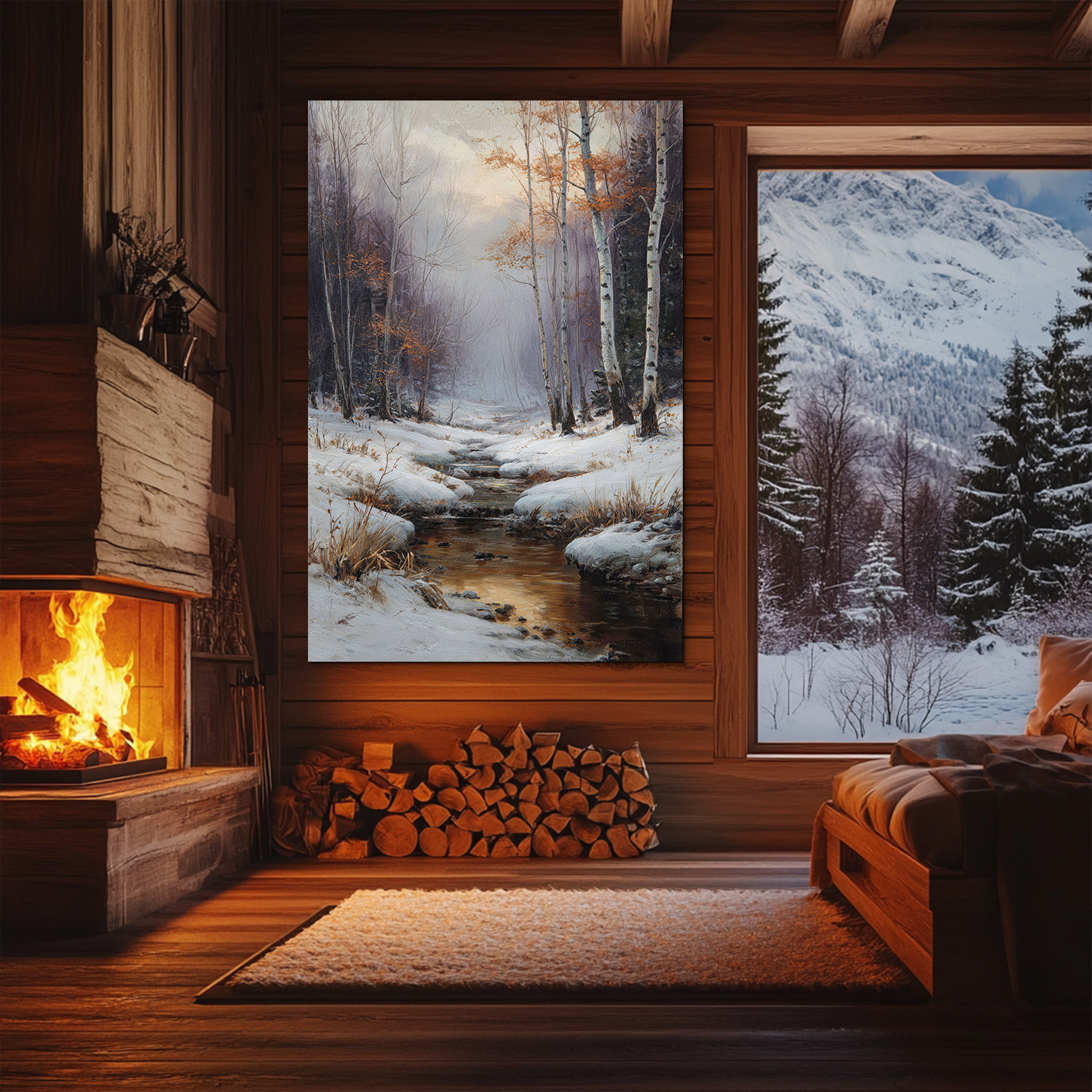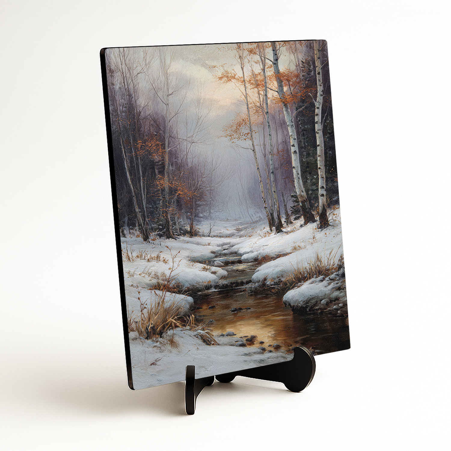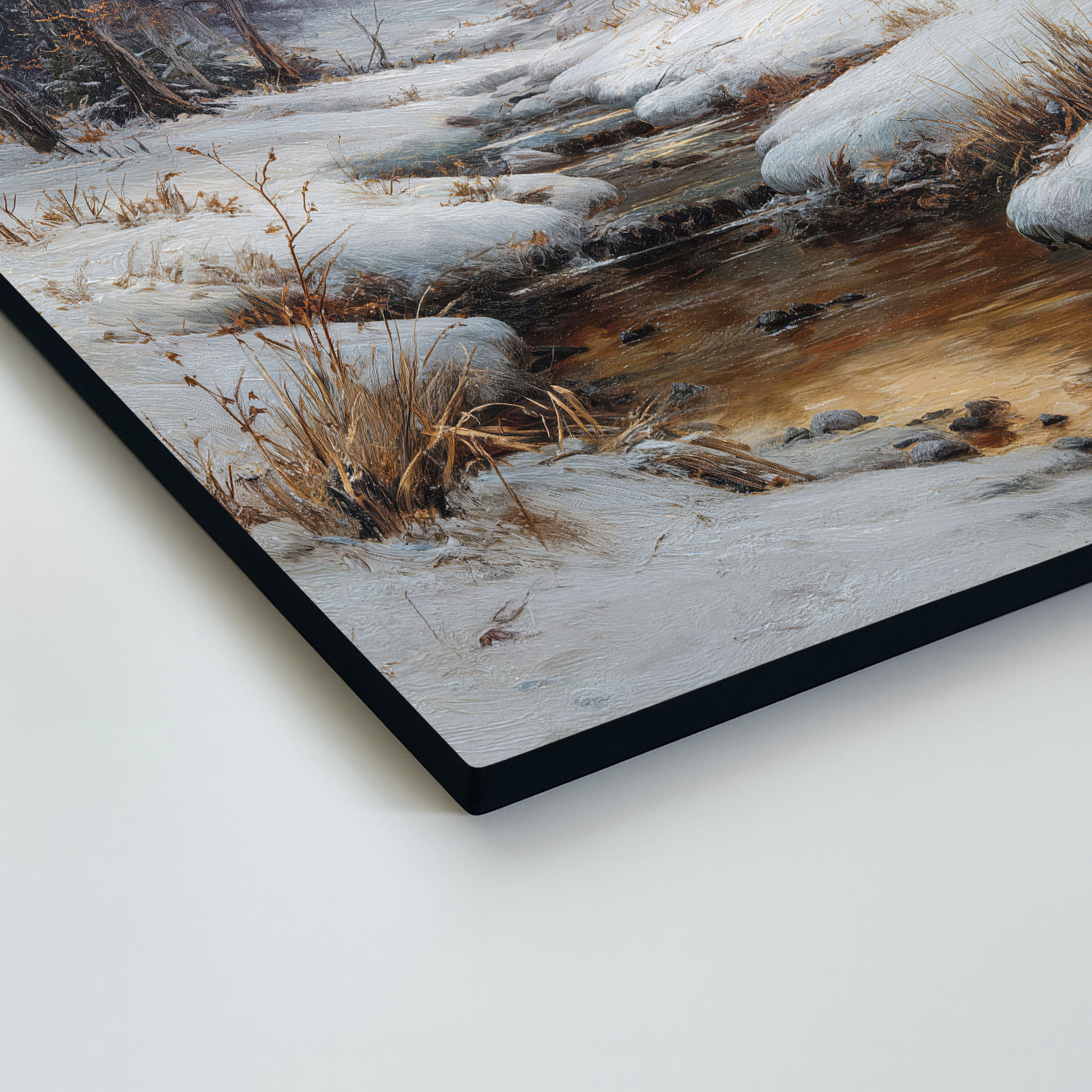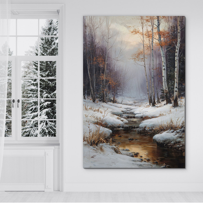 Nástěnný obraz zasněžené krajiny, kde se zlatavé světlo nízkého slunce odráží v klidné hladině lesního potoka lemovaného elegantními břízami. Obraz na přírodním dřevě díky špičkovému UV tisku a efektu tahů štětce okamžitě vnese do interiéru nostalgickou krásu zimy. Obraz se dokonale hodí do moderních interiérů ve skandinávském stylu, útulného venkovského designu či světlého minimalismu.