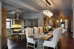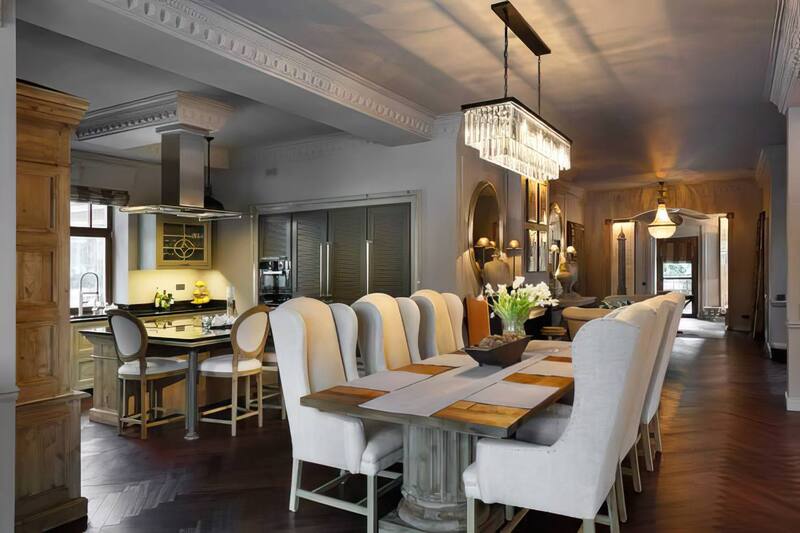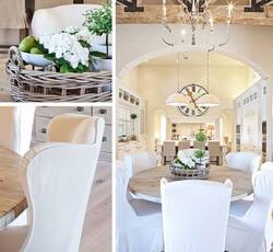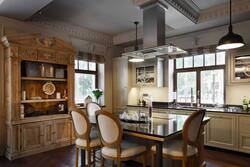 Estetiku kuchyně umocňuje masivní stůl a židle, které mají ošoupaný a „zanedbaný“ vzhled - základ každého designu vintage kuchyně. Sladění tmavého starožitného dřeva se světlými skříňkami je skvělý způsob, jak přidat hloubku barevného schématu vaší kuchyně, přičemž tyto teplé a bohatší akcenty kontrastují s chladnými neutrálními tóny. V případě, že si chcete pořídit originální vintage kuchyni, doporučujeme Vám sáhnout po kvalitních kredencích z masivu.