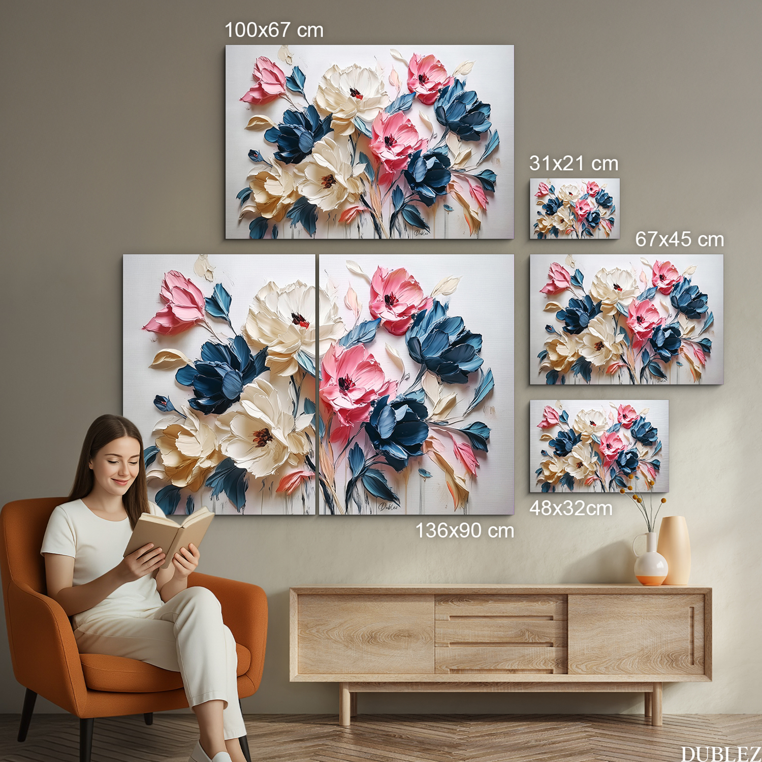 Obraz do obývacího pokoje – květiny přináší do prostoru barvy a pozitivní energii. Kombinace růžových, krémových a tmavomodrých květů působí výrazně, ale zároveň vkusně. 3D efekt malovaných květů vynikne i na větší stěně v obývacím pokoji. Originální dárek pro ženu, která má ráda květiny a stylové interiéry.