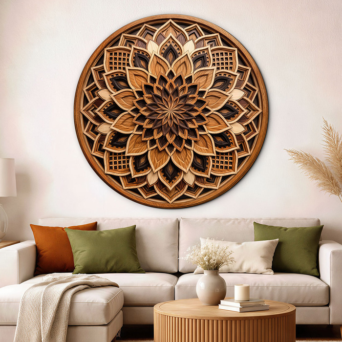 Detailně zpracovaný obraz dřevěné mandaly zaujme precizní geometrií a vrstveným efektem, který je vytvořen pomocí kvalitního UV tisku. Kombinace přírodních odstínů dřeva a symetrického vzoru působí harmonicky a elegantně. Dřevěný obraz se hodí do obývacího pokoje, ložnice nebo kanceláře, zejména v interiérech v rustikálním nebo klasickém stylu.