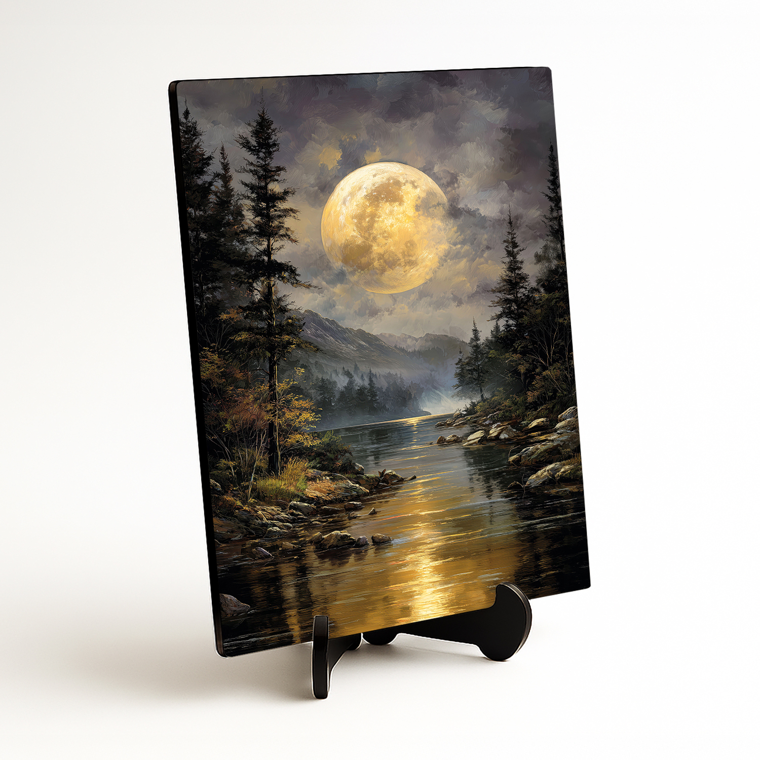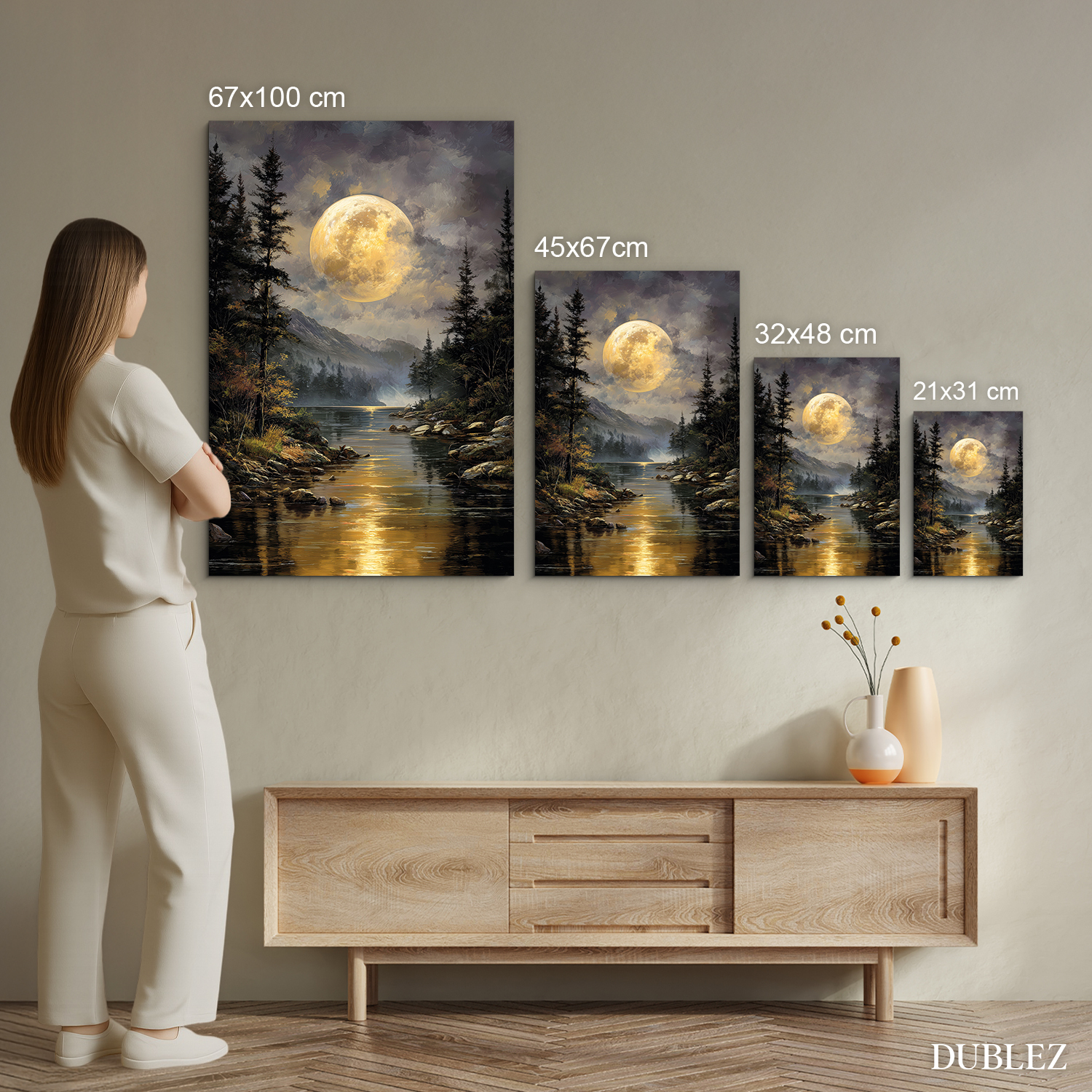 Dřevěný obraz zachycuje měsíc v úplňku zářící nad tichým horským jezerem, kde se jeho světlo odráží na hladině a vytváří jedinečnou atmosféru. Měsíční světlo se zrcadlí na vodní hladině a vytváří nádherný zlatistý efekt, který okamžitě upoutá. Hodí se do obývacího pokoje, ložnice, kanceláře. Ideální také jako dárek pro milovníky přírody či noční krajiny.