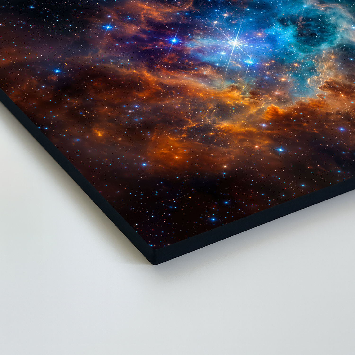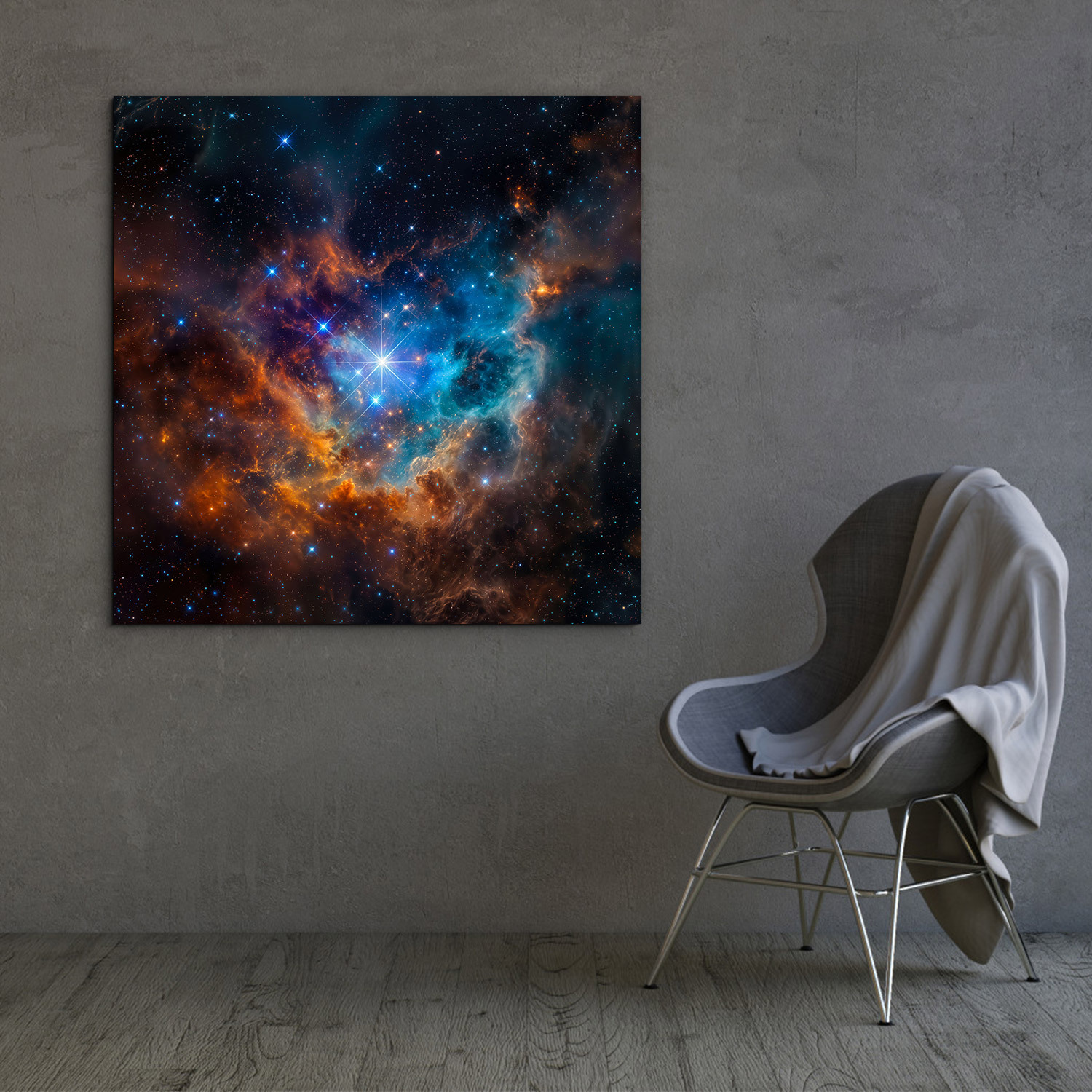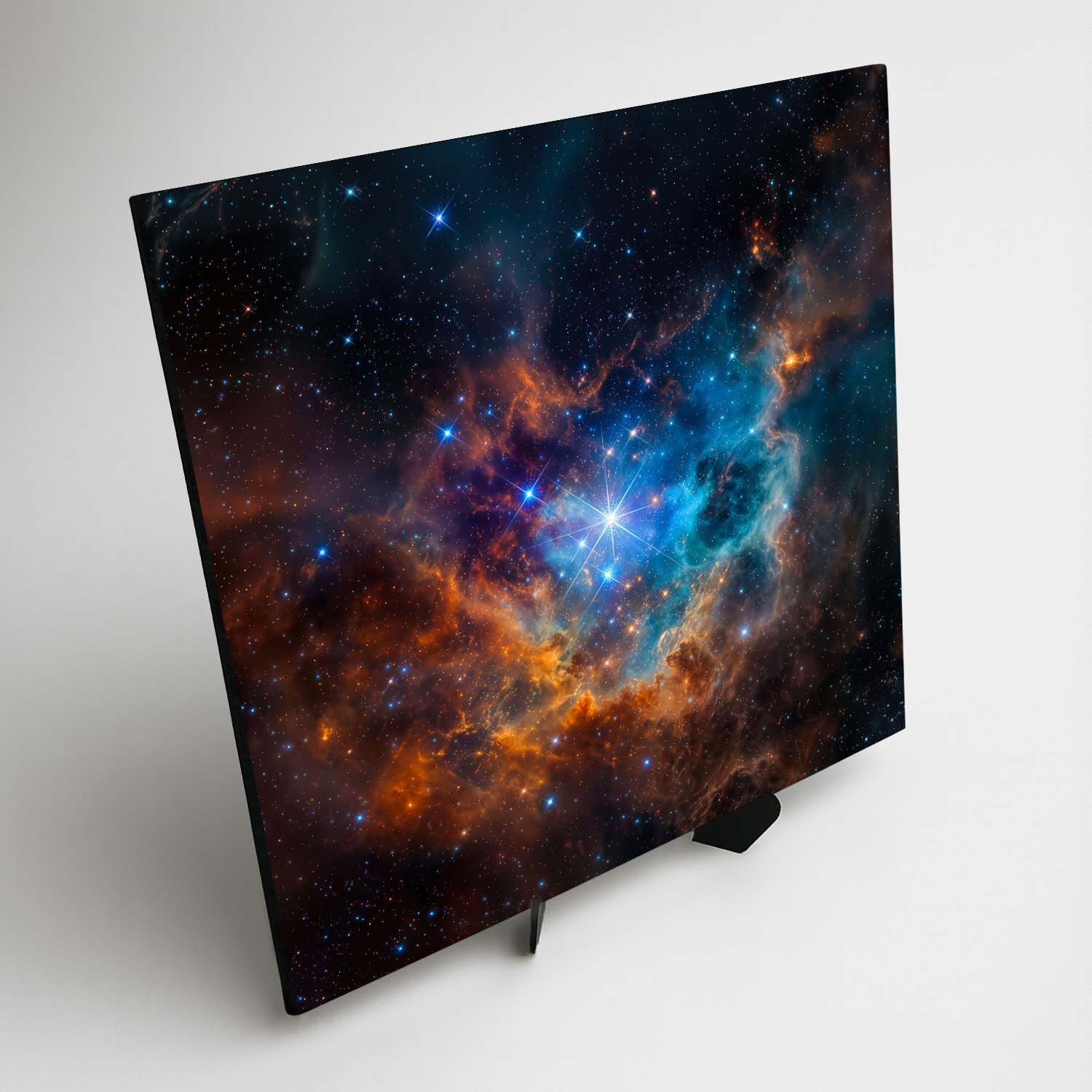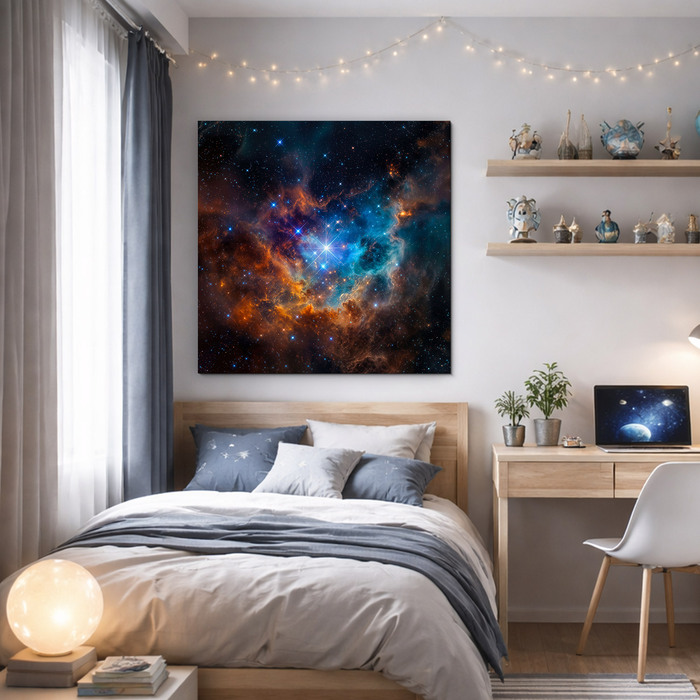 Dřevěný obraz vesmíru zachycuje fascinující mlhovinu s jasnou hvězdou v centru, obklopenou explozí modrých a oranžových barev. Moderní obraz galaxie na zeď se hodí do obývacího pokoje, kanceláře, studentského pokoje i stylového minimalistického interiéru. Pokud hledáte obraz vesmíru, který přitáhne pohled a dodá prostoru energii i tajemství, tento dřevěný obraz je originální bytový doplněk.