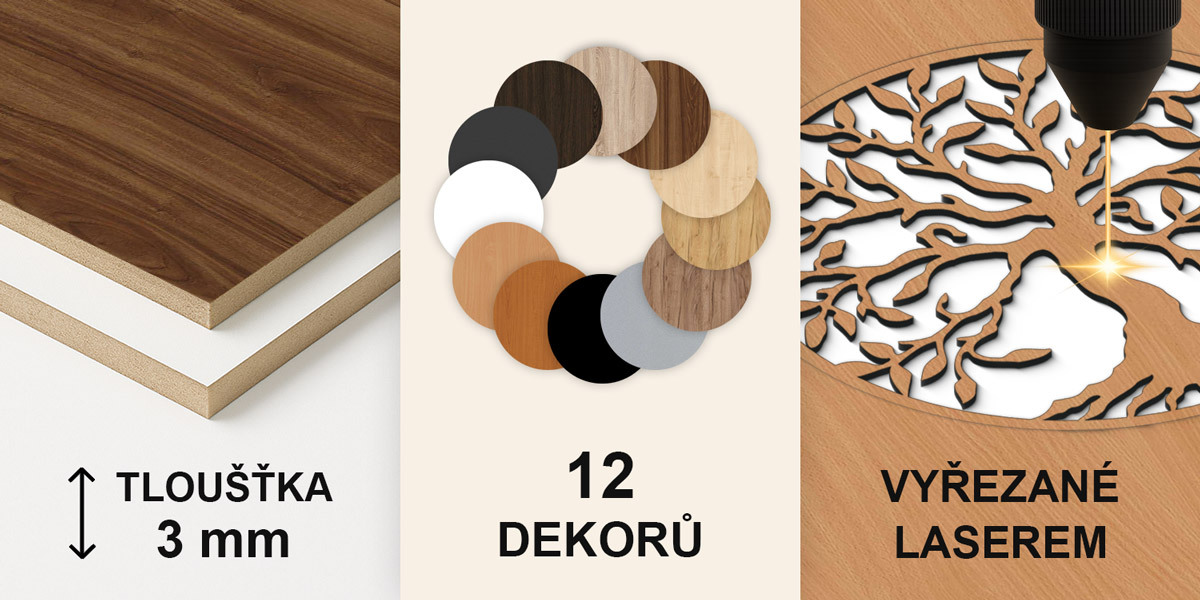 Výrobek je vyřezávaný laserovou technologií ze dřevěné HDF desky – dřevovláknitá deska s vysokou hustotou, která vzniká slisováním dřevěných vláken a pryskyřice pod tlakem. Materiál je pevný (tloušťka 3 mm), tvarově stálý a má hladký povrch. Díky své pevnosti umožňuje precizní řezání i jemných, tenkých detailů.