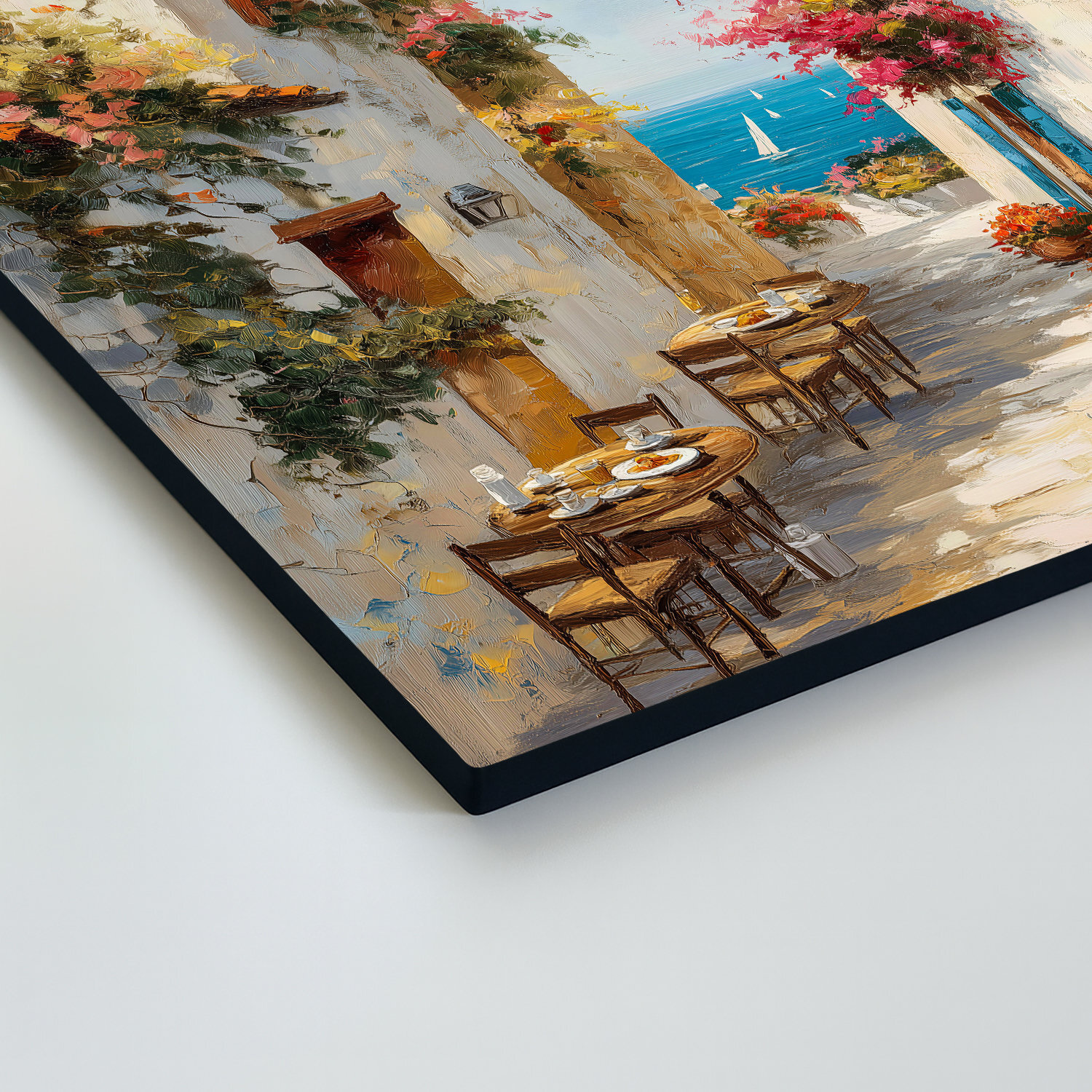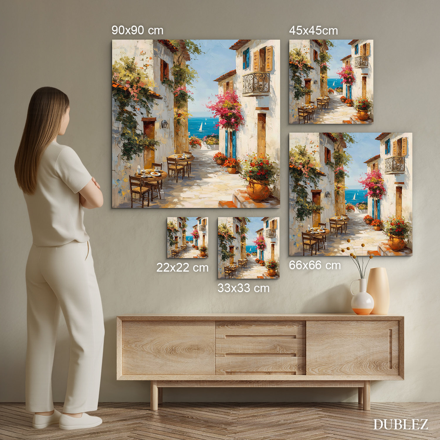 Vítejte ve svém interiéru s dotekem Provence. Jemné sluneční paprsky a šepot moře vnesou do vašeho domova atmosféru klidu. Dřevěný obraz vás přenese do úzké kamenné uličky v srdci francouzského jihu, kde čas plyne pomaleji a káva chutná lépe. Květiny v květináčích, stoly připravené na snídani a modré moře v dáli vytvářejí výjimečnou scenérii, která rozjasní každý prostor. Je ideální pro milovníky venkovského stylu a romantiky. Vynikne v kuchyni, jídelně, na chalupě či v světlém obývacím pokoji.