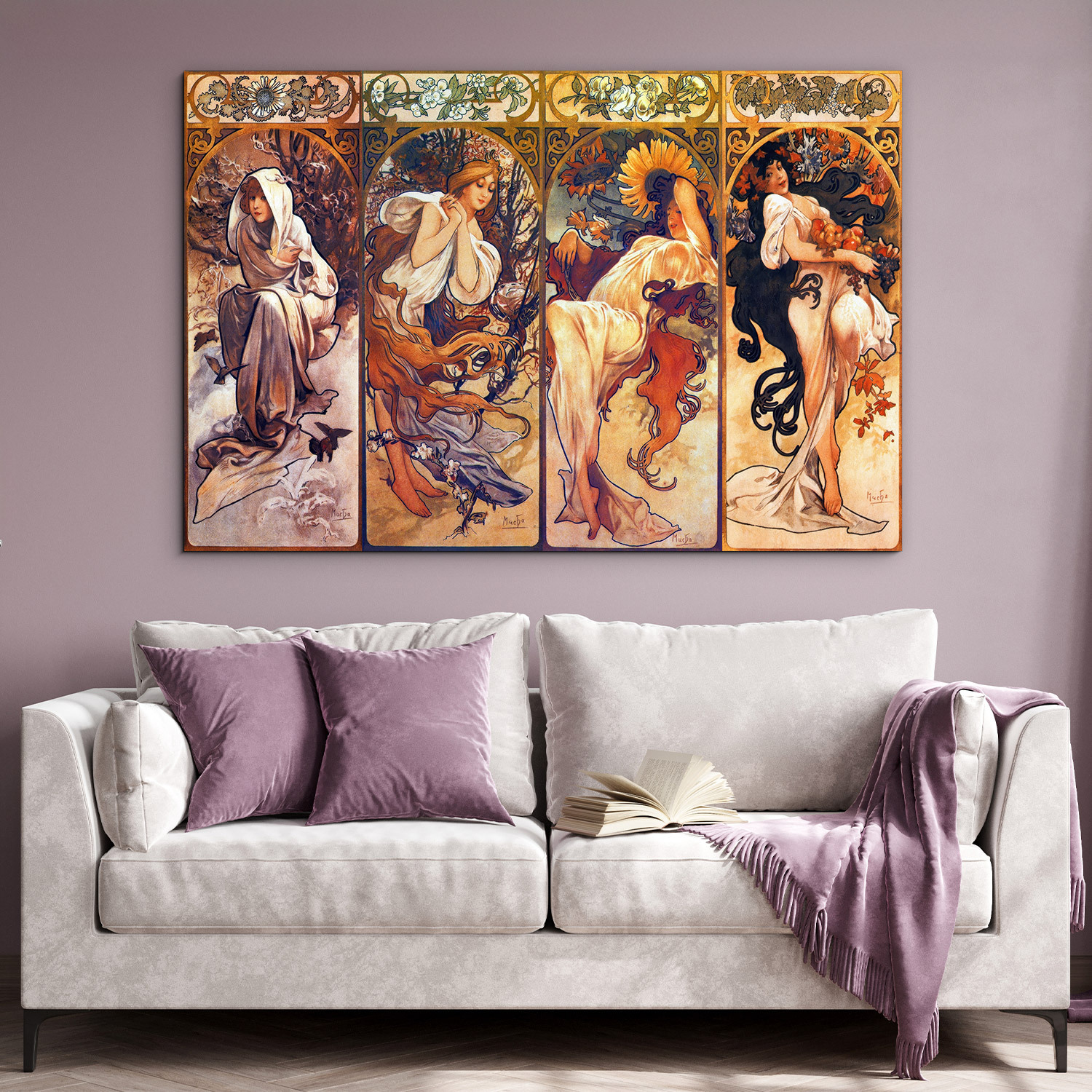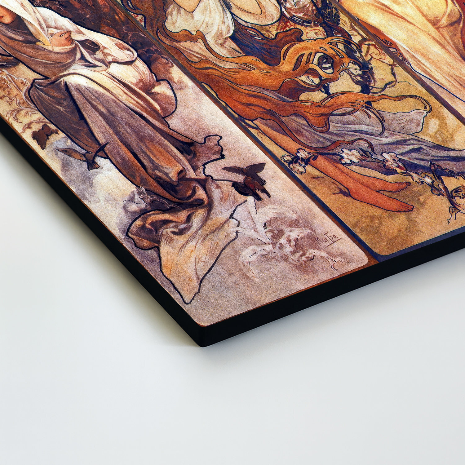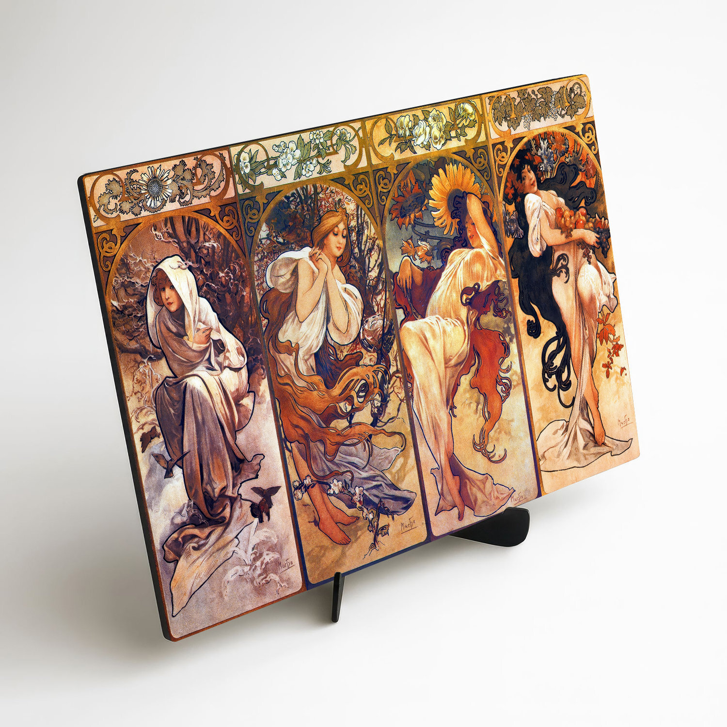 Dřevěný obraz Alfons Mucha – The Seasons zachycuje reprodukci jednoho z nejznámějších děl tohoto secesního mistra. Secesní umění zde ožívá v podobě půvabných ženských postav, které symbolizují cyklus ročních období. Reprodukce slavného obrazu je ideální do designové ložnice, světlého obývacího pokoje či stylového hotelu.