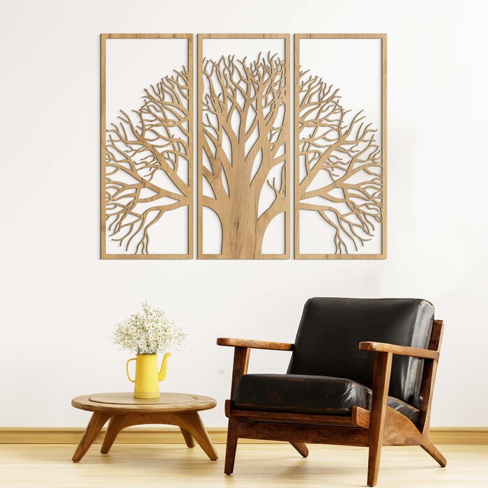 Vyřezávaný 3 dílný obraz stromů na stěnu je skvělou dřevěnou dekorací do bytu a bude se krásně vyjímat na stěně v obývacím pokoji nebo ložnici. Tento výrobek je dostupný v několika barevných variantách. Dřevěný strom na stěnu je velmi oblíbený designový doplněk do domácnosti, pro své propojení s přírodou. Díky příznivým pocitům, které vyvolává v lidech se těší stále větší oblibě i jako bytová dekorace.