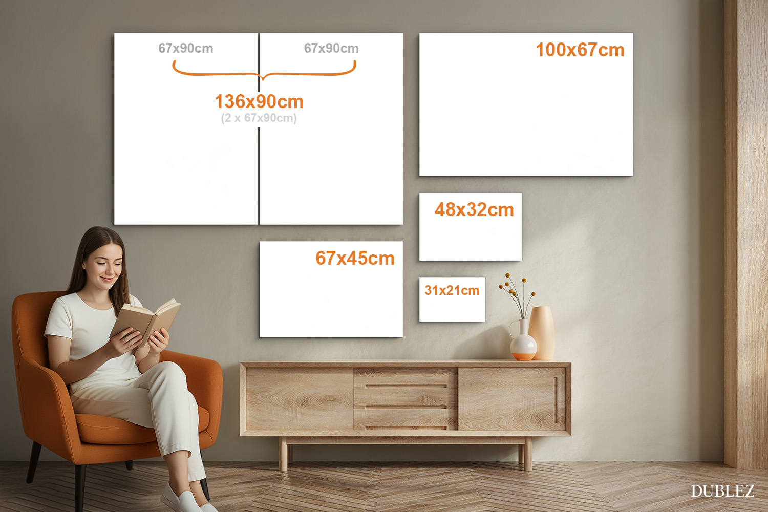 2. 136x90 cm - Obraz je rozdělen na 2 části (rozměr jedné části je 67x90 cm - viz galerie produktu). Rozměr 135x90 cm je rozměr po zavěšení na zeď s 2 cm mezerou mezi jednotlivými díly. Mezery mezi jednotlivými díly je možné libovolně nastavit a tím dosáhnout i větší velikosti.